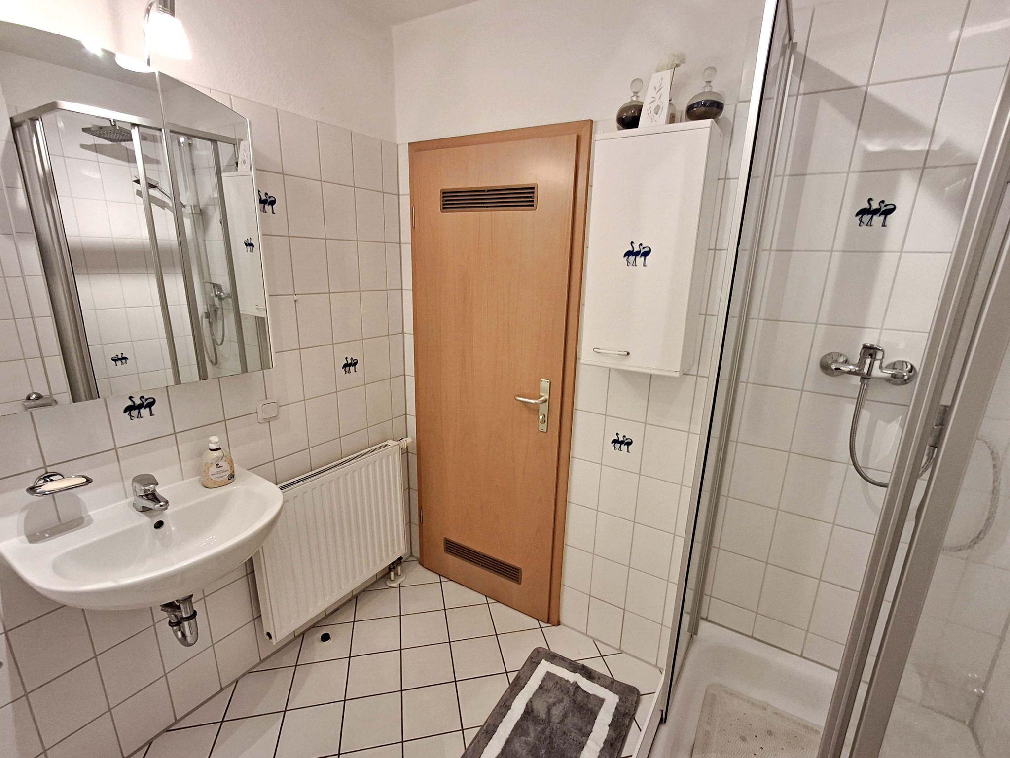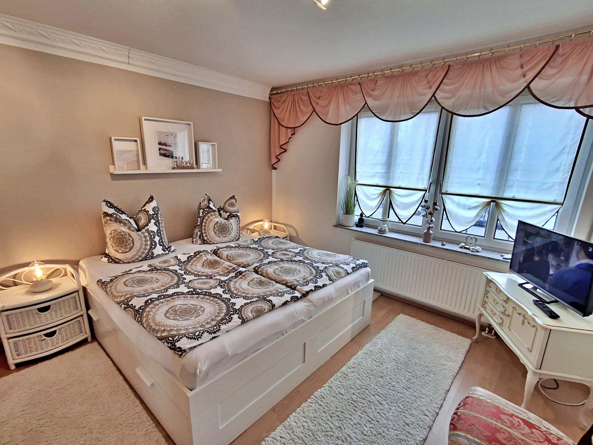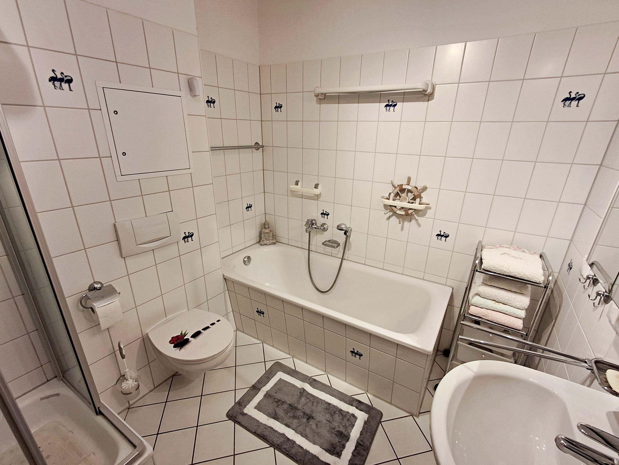 Mit einer großzügigen Fläche von ca. 58 m² bietet Ihnen diese charmante Wohnung alles, was Sie für einen angenehmen Aufenthalt benötigen und genügend Platz für bis zu 2 Personen. Sie befindet sich in der 1. Etage eines kleinen Mehrfamilienhauses und verfügt über ein separates Schlafzimmer mit einem komfortablen Doppelbett. Für Selbstversorger steht Ihnen eine rundum gut ausgestattete separate Küche mit einem kleinen Essplatz zur Verfügung, die keine Wünsche offen lässt. Im Wohnbereich erwartet Sie ein großer Essplatz sowie eine bequeme Sitzgarnitur, ideal zum Entspannen und Verweilen. Ein Flachbildfernseher sorgt für Unterhaltung. Das Badezimmer ist sowohl mit einer Badewanne als auch mit einer Dusche ausgestattet, sodass Sie sich nach einem erlebnisreichen Tag wunderbar erfrischen können. Genießen Sie die frische Luft auf Ihrem eigenen Balkon, der mit bequemen Sitzmöbeln ausgestattet ist - perfekt, um morgens Ihren Kaffee zu genießen oder den Abend bei einem Glas Wein ausklingen zu lassen. Ein Pkw-Stellplatz befindet sich direkt auf dem Grundstück und die Erstausstattung mit Bettwäsche und Handtüchern ist bereits im Preis enthalten. Für Fahrradliebhaber steht ein Fahrradständer vor dem Haus bereit.