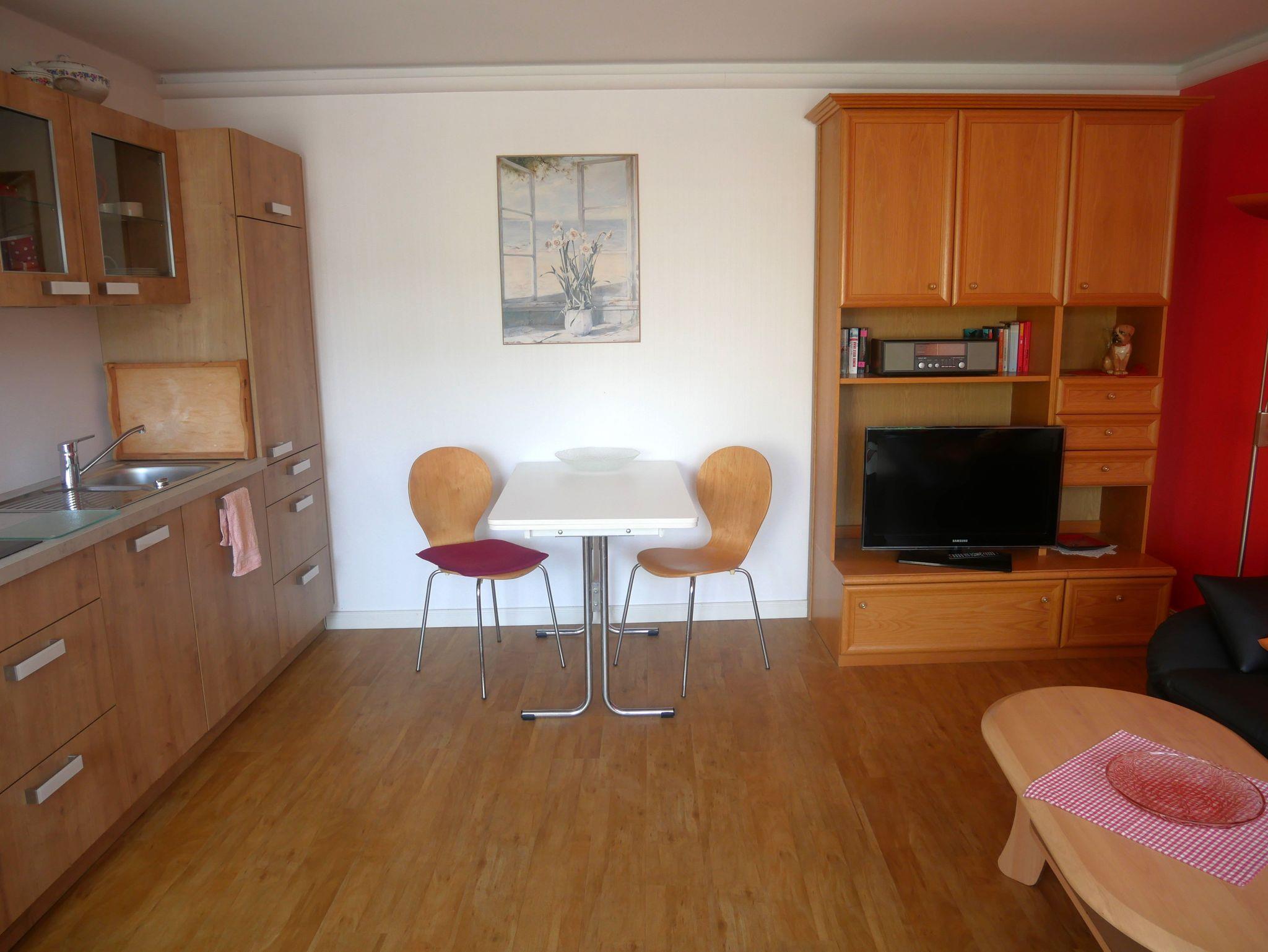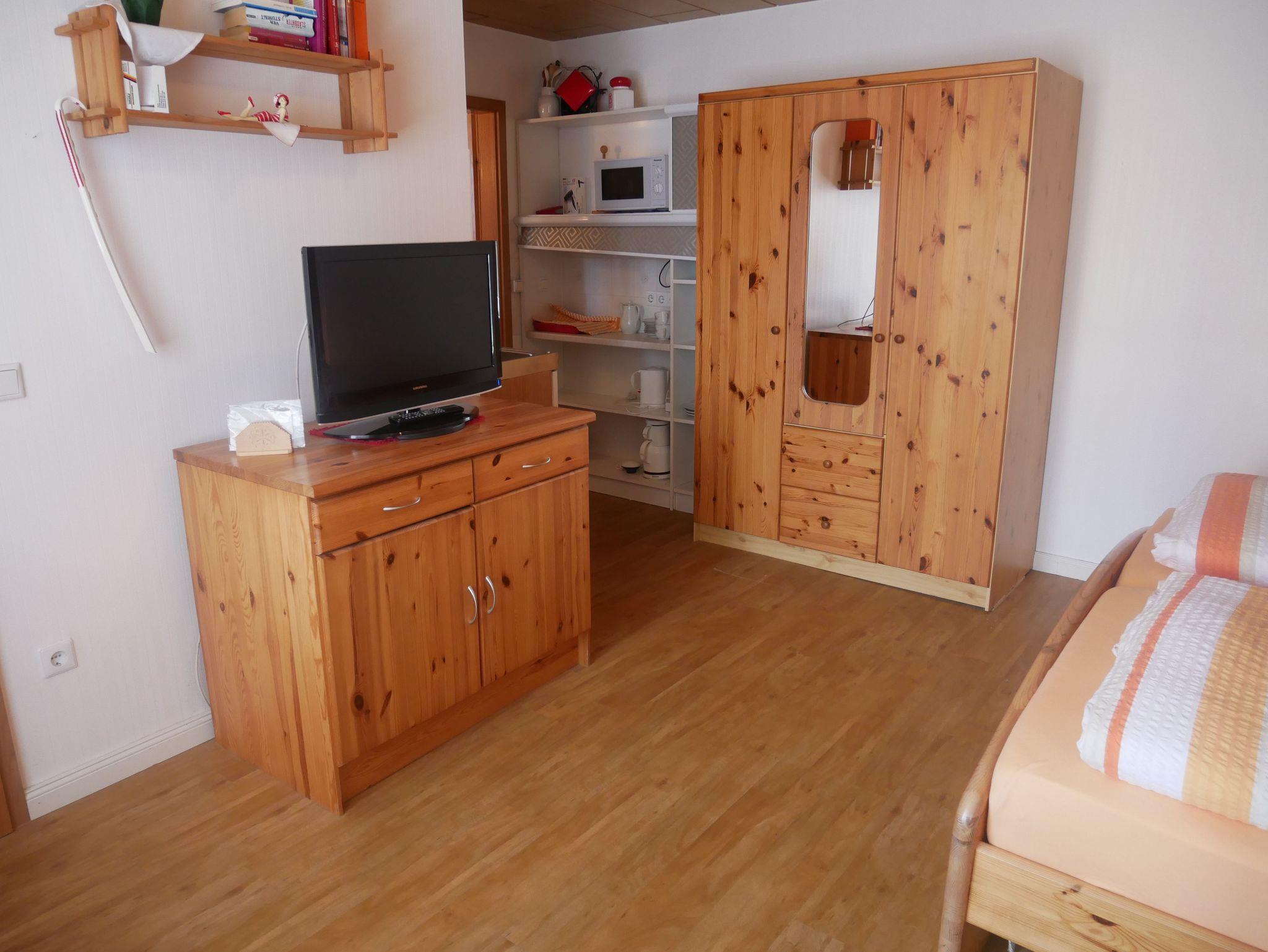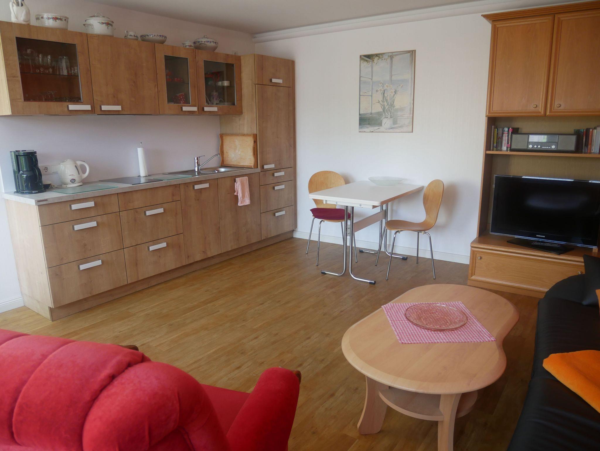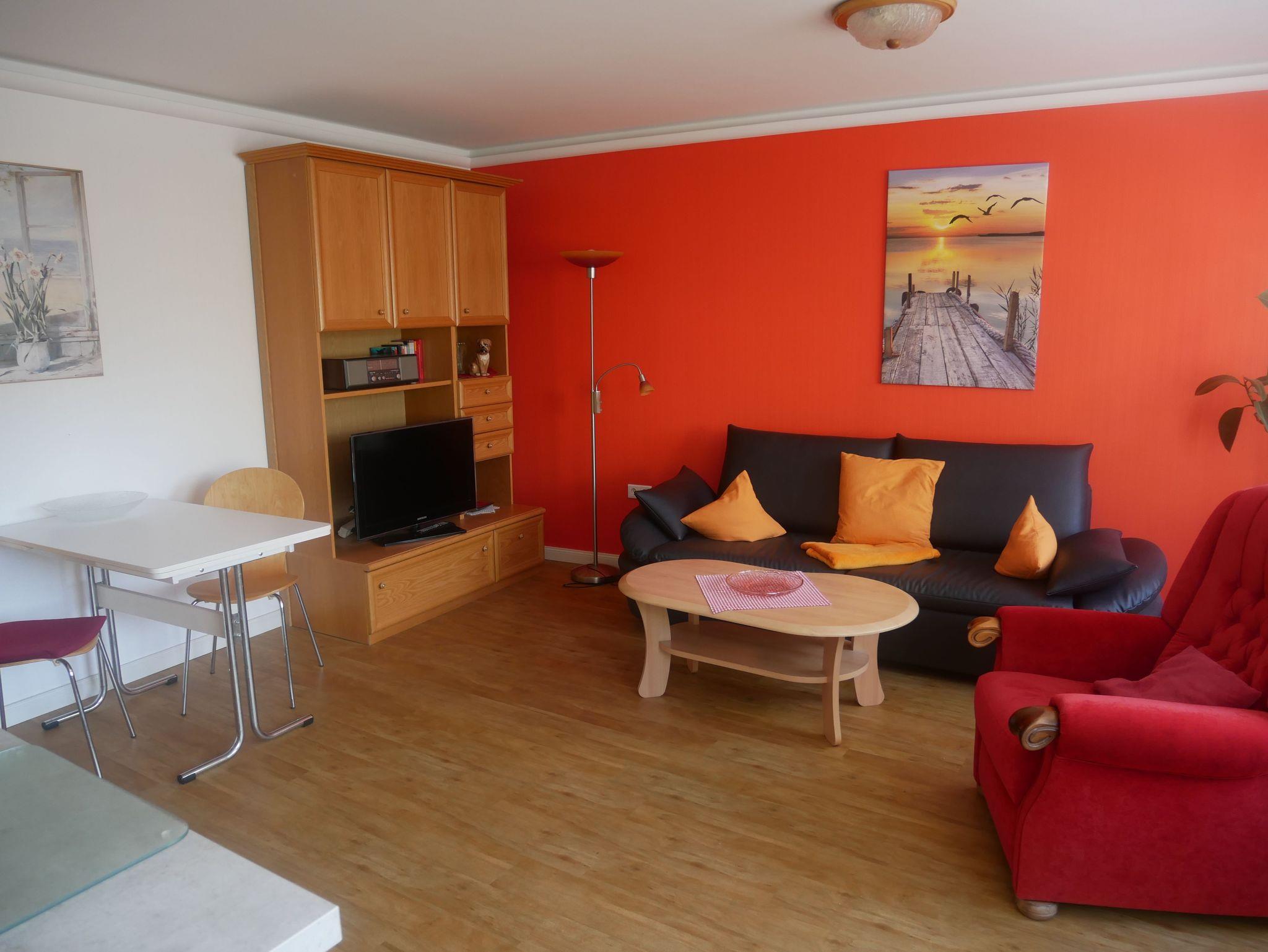Die 2-Raum-Wohnung Orange befindet sich im Erdgeschoss und ist ca. 50 m² groß. Das Wohnzimmer ist mit einer gemütlichen Couch, Sessel und Flachbildfernseher ausgestattet. Im Wohnzimmer befindet sich die offene Küche und der Essbereich. Die Küche verfügt über ein 2er-Cerankochfeld, Kühlschrank mit Gefriermöglichkeit, Kaffeemaschine, Wasserkocher, Toaster und Mikrowelle. Das Schlafzimmer ist ausgestattet mit einem gemütlichen Doppelbett, Fernseher und Kleiderschrank. Das Badezimmer verfügt über eine Dusche und einen Haartrockner. Vor der Wohnung befindet sich eine möblierte Terrasse mit Esstisch, Holzbänken und einem Strandkorb.