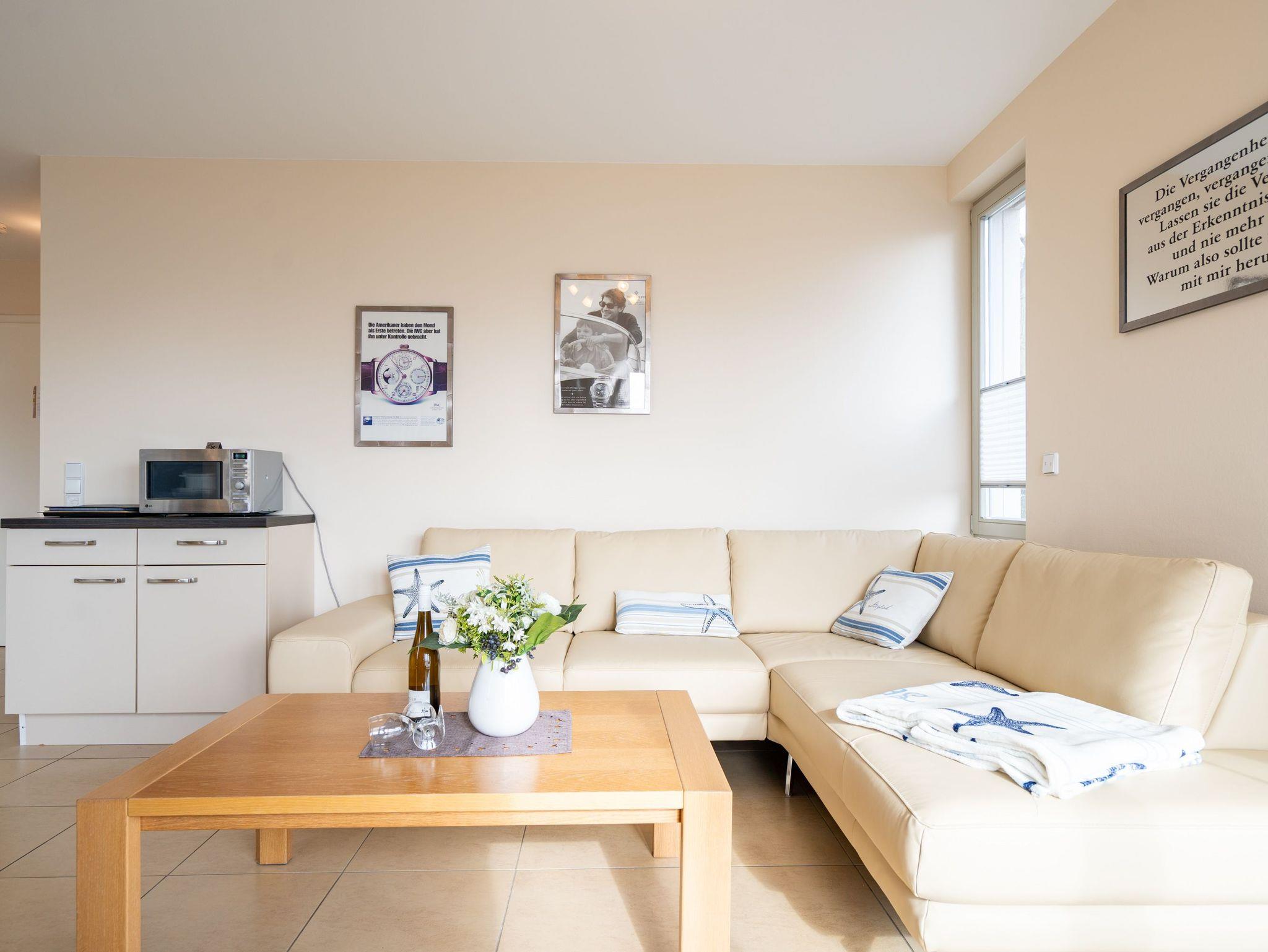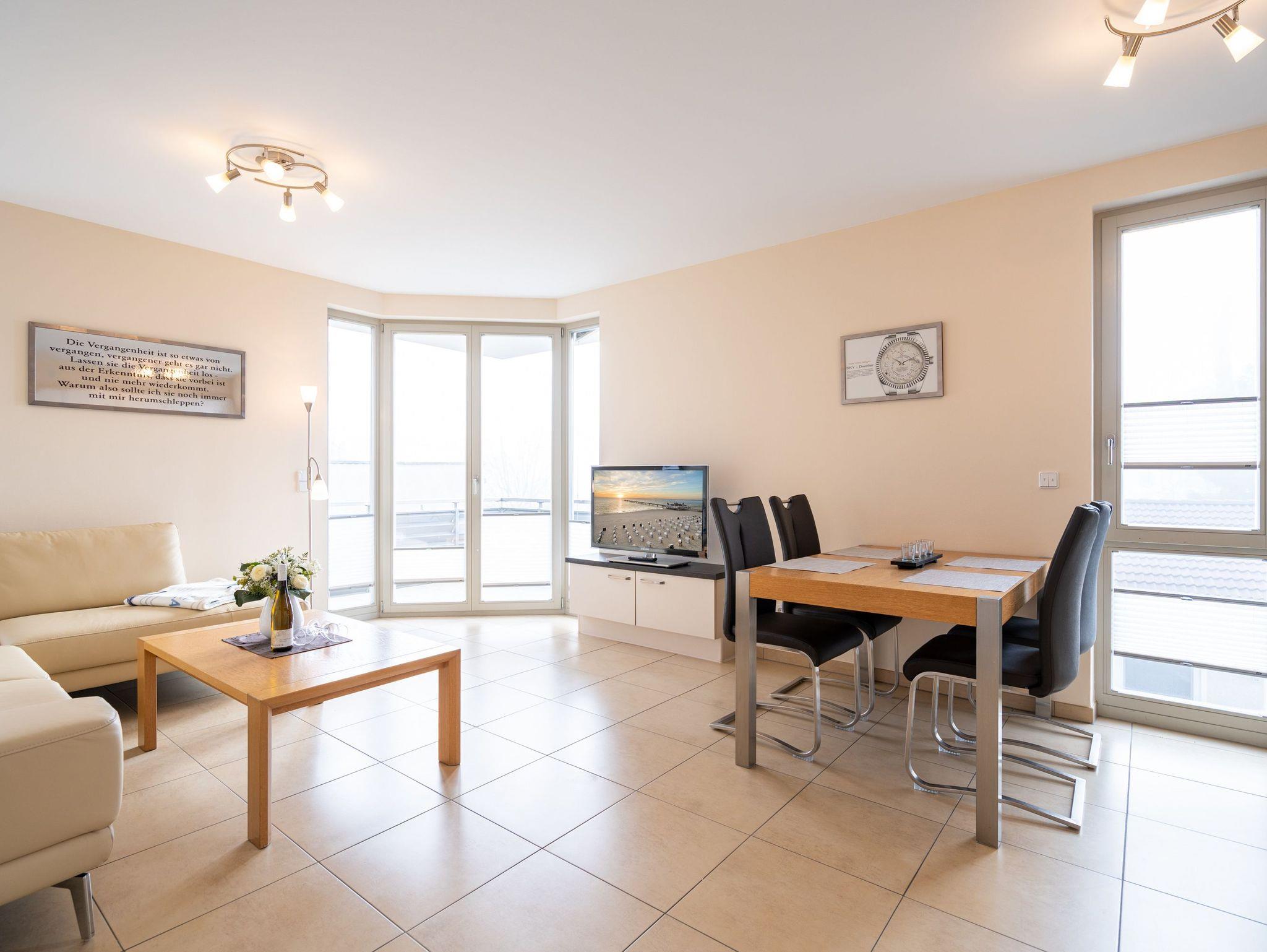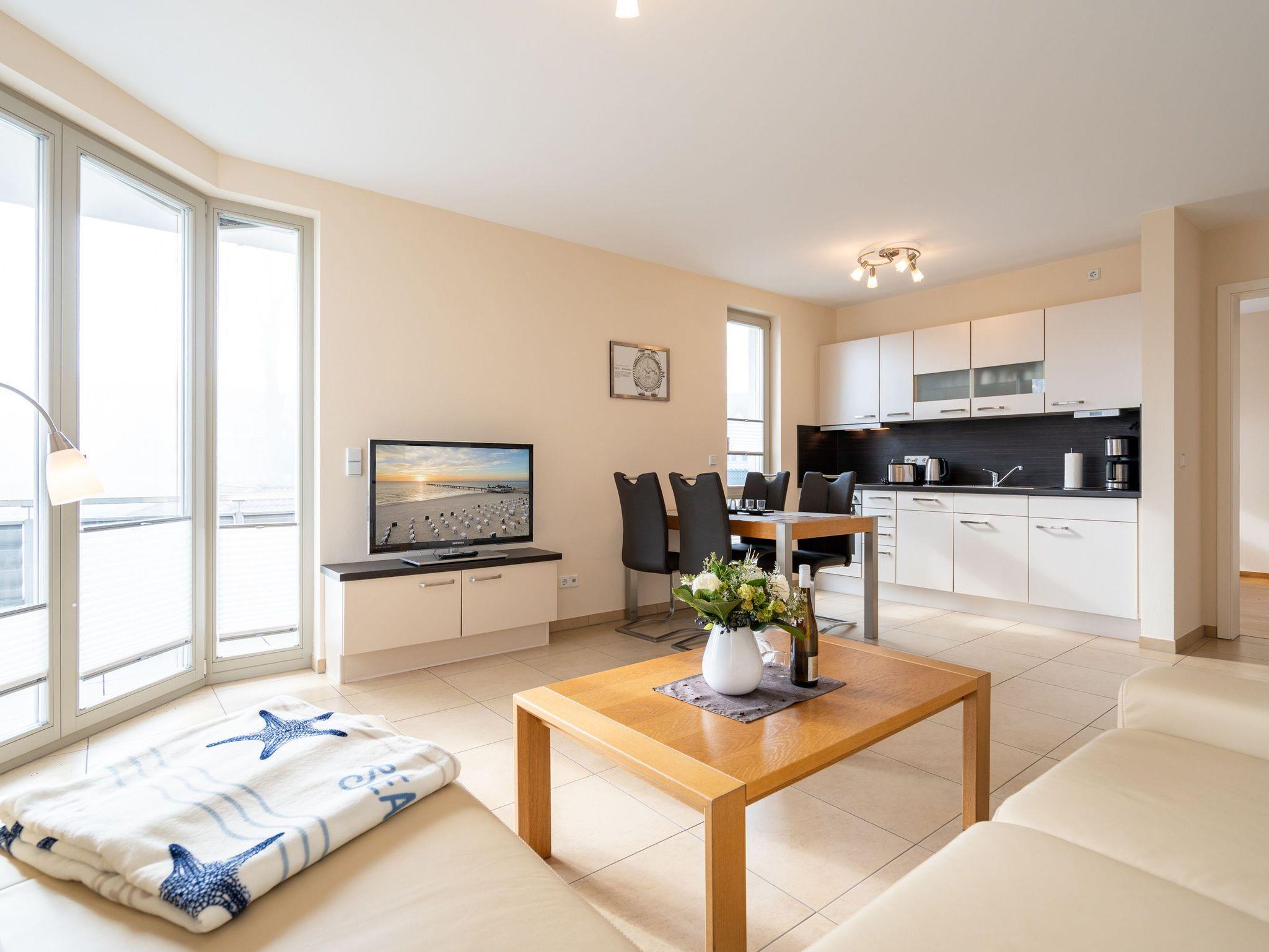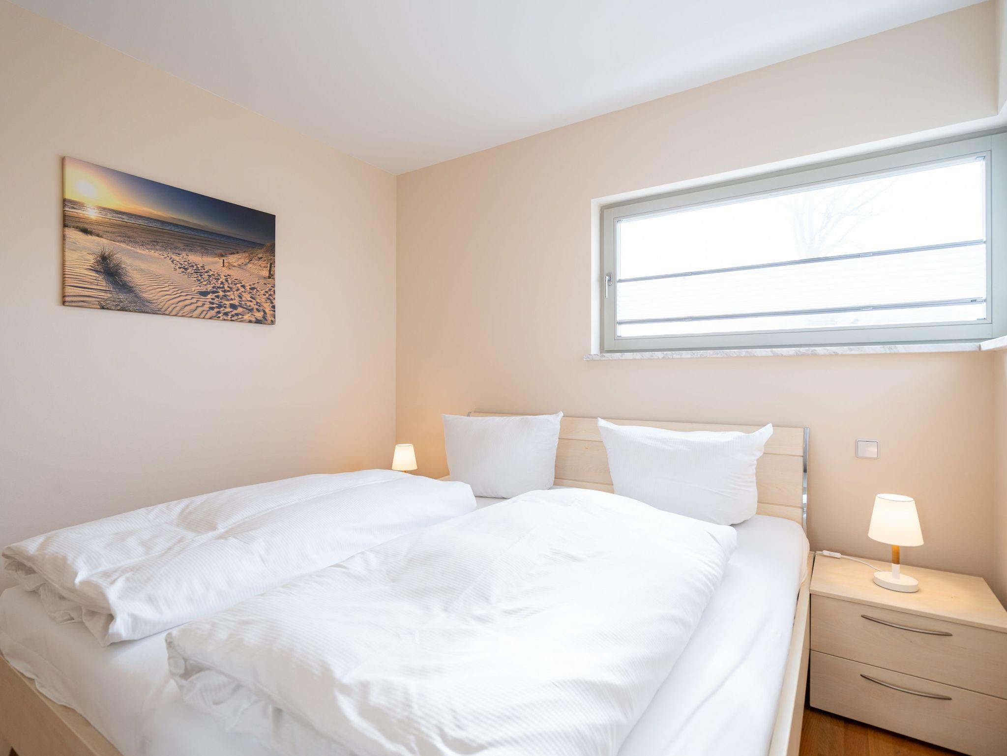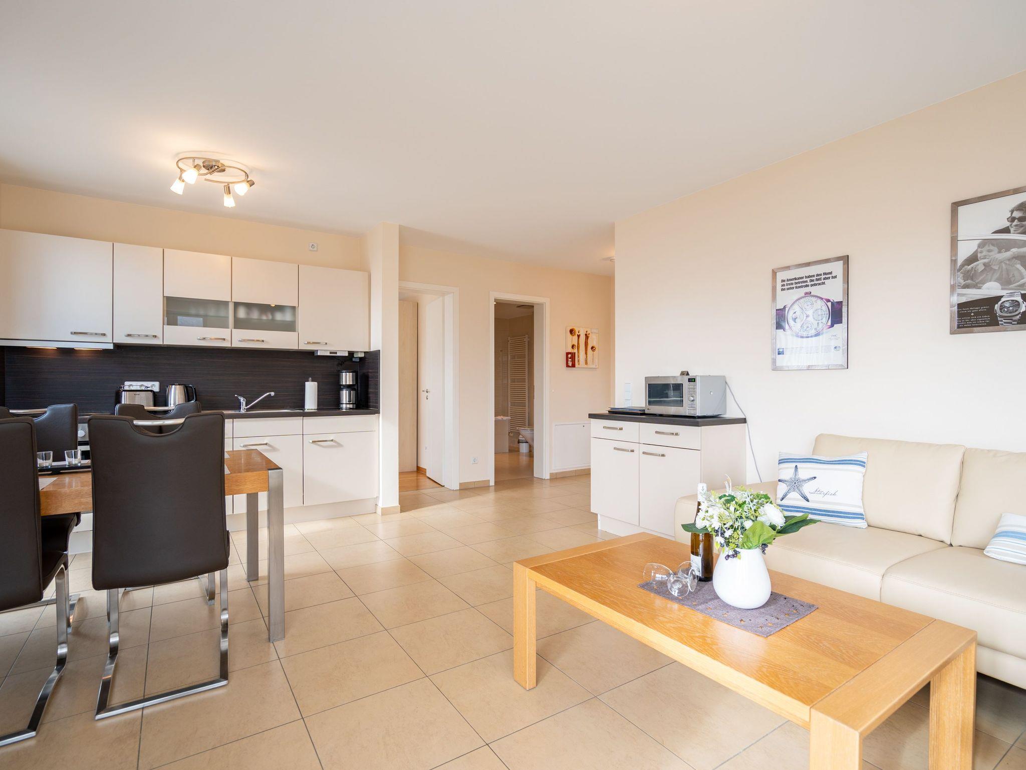 Die moderne und stilvoll eingerichtete 3-Raum-Ferienwohnung in der Villa Estrelia bietet auf 65 m² ausreichend Platz für bis zu vier Personen. Sie befindet sich im 1. Obergeschoss des hochwertigen Neubaus und überzeugt mit einer durchdachten Raumaufteilung sowie einer komfortablen Ausstattung. Der helle Wohnbereich lädt mit einer gemütlichen Sitzgruppe, einem großen Flat-TV und einer modernen Einrichtung zum Entspannen ein. Angrenzend befindet sich die offene Küche, die mit hochwertigen Geräten und einer vollständigen Ausstattung für alle kulinarischen Bedürfnisse sorgt. Ein stilvoller Essplatz bietet genügend Raum für gemeinsame Mahlzeiten. Vom Wohnbereich aus gelangt man direkt auf den sonnigen Balkon, der zum Verweilen an der frischen Seeluft einlädt. Die Wohnung verfügt über zwei separate Schlafzimmer, jeweils mit komfortablen Doppelbetten, in denen erholsamer Schlaf garantiert ist. Ein geräumiges Badezimmer mit Badewanne und einer modernen Glasdusche sorgt für besonderen Komfort. Zusätzlich steht ein Gäste-WC zur Verfügung. Zur Ferienwohnung gehört ein kostenfreier Pkw-Stellplatz in der Tiefgarage der Villa Estrelia, wo auch mitgebrachte Fahrräder sicher untergestellt werden können. Ein Waschmaschinen- und Trocknerbereich im Haus kann gegen eine geringe Gebühr genutzt werden. Selbstverständlich steht Ihnen kostenfreies WLAN zur Verfügung.