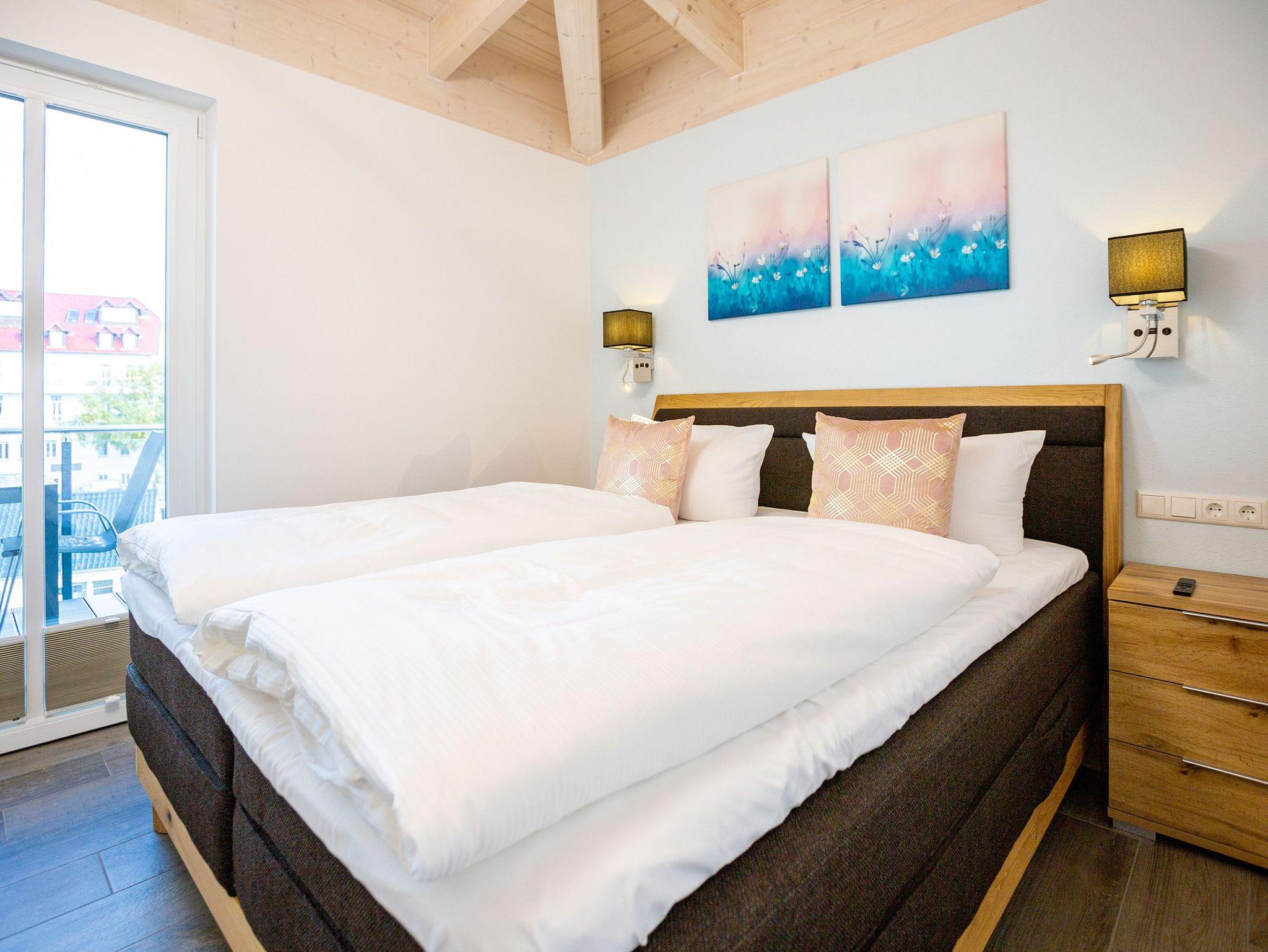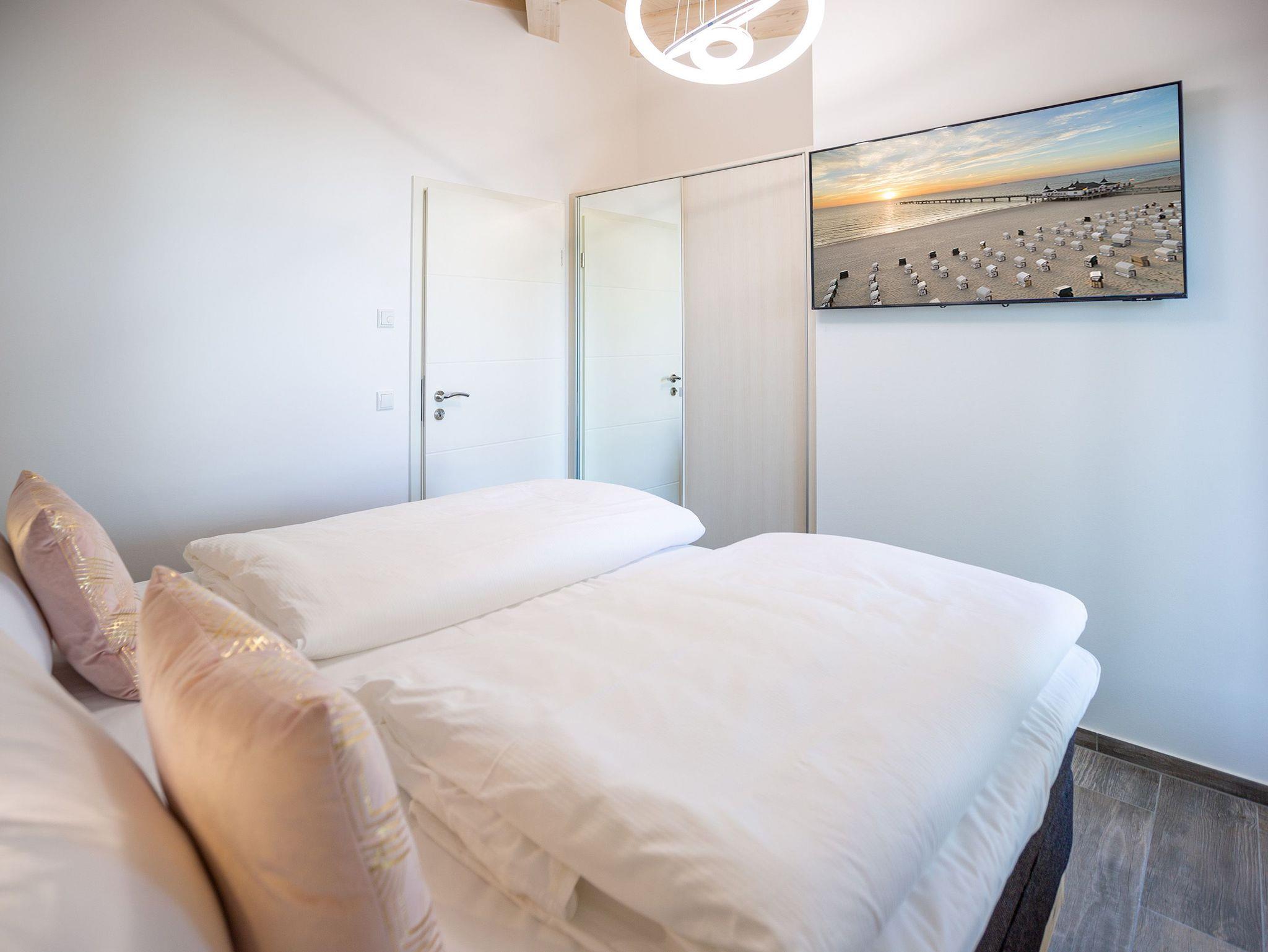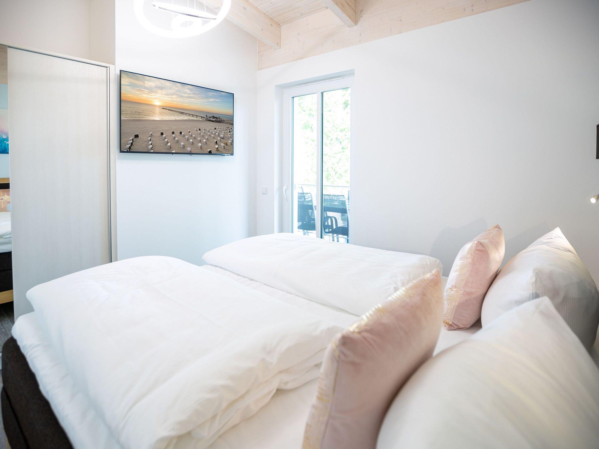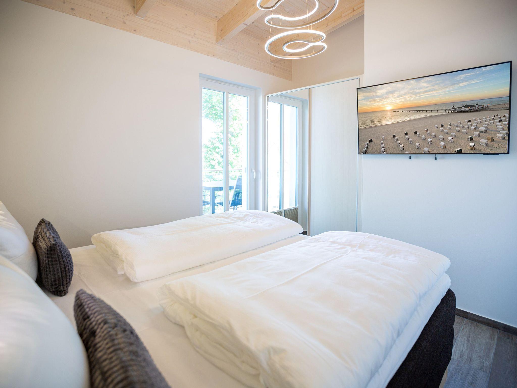 Sie haben schon immer von Meerblick in Ihrem Urlaub geträumt? Dieses schöne 3-Zimmer-Appartement (85qm) im Dachgeschoss (1. OG) für bis zu 4 Personen erlaubt Ihnen gleich von mehreren Seiten den Blick auf die einzigartige Weite der Ostsee. Lassen Sie Ihre Augen in die Ferne schweifen (Entfernung zur Ostsee 150m) und genießen Sie von Ihrem Nord-Balkon im Wohnzimmer oder Ihrem West-Balkon in beiden Schlafzimmern den seitlichen Blick auf das Meer. Hier erleben Sie, nach einer Nacht in einem der beiden komfortablen Boxspringbetten (1,80m x 2,00m), den perfekten Start in den Tag. Oder Sie genießen Ihren Urlaub ganz gemütlich in der appartementeigenen Finnischen Sauna im Masterbad. Für die anschließende Abkühlung sorgt die eingebaute Regendusche. Ein Waschtisch mit LED-Beleuchtung sowie ein beheizter Badezimmerspiegel gehören ebenso zum gehobenen Standard dieser Ferienwohnung wie ein zweites Bad mit Regendusche, Waschbecken und Toilette. Die mit viel Liebe zum Detail eingerichteten Appartementzimmer und die sichtbare Holzbalkendecke machen diese Urlaubsunterkunft zu einem einzigartigen Aufenthaltsort für Ihren Ostseeurlaub. Der offen gestaltete Wohn-Essbereich wird durch einen Gaskamin getrennt, der seine wohlige Wärme zur bequemen Sofalandschaft, in die Küche und den in Essbereich versprüht. Ein großzügiger Flat-TV zum Wohnzimmer und ein separater Flat-TV zum Küchenbereich mit Soundsystem sorgen auch an Regentagen für entsprechende Unterhaltung. Keine Wünsche lässt die voll ausgestattete Küche mit Marken-Elektrogeräten (Ceranfeld, Backofen, Mikrowelle, Spülmaschine, Kühlschrank, Gefrierschrank, Kleinküchengeräte) beim Zubereiten Ihrer Speisen offen. Genießen Sie die Vorzüge des in den Herd integrierten Dunstabzugs und der modernen Touchbedienung. Kostenfreies W-Lan und ein Stellplatz in der hauseigenen Tiefgarage runden Ihren perfekten Urlaub auf der Insel Usedom ab.