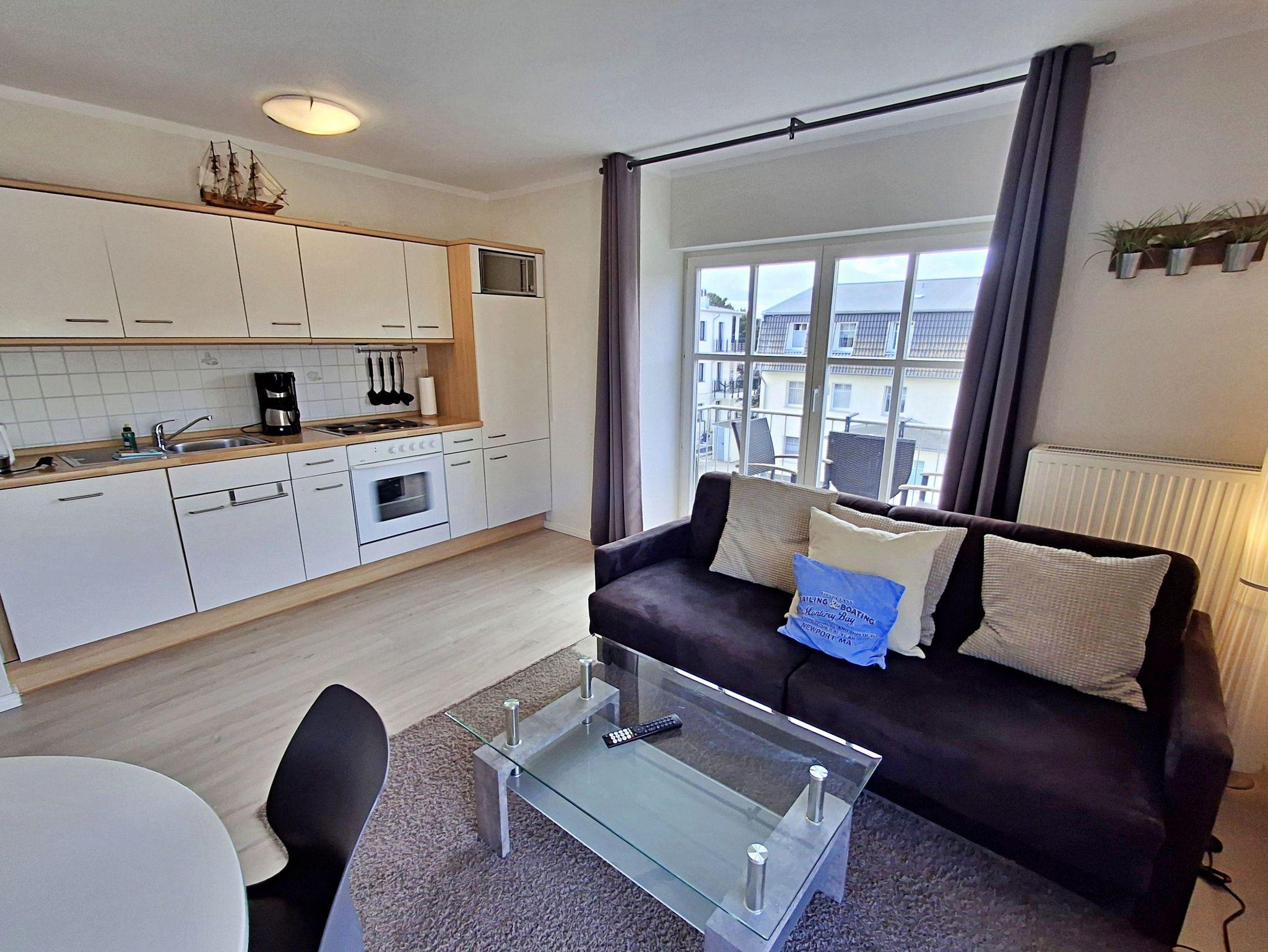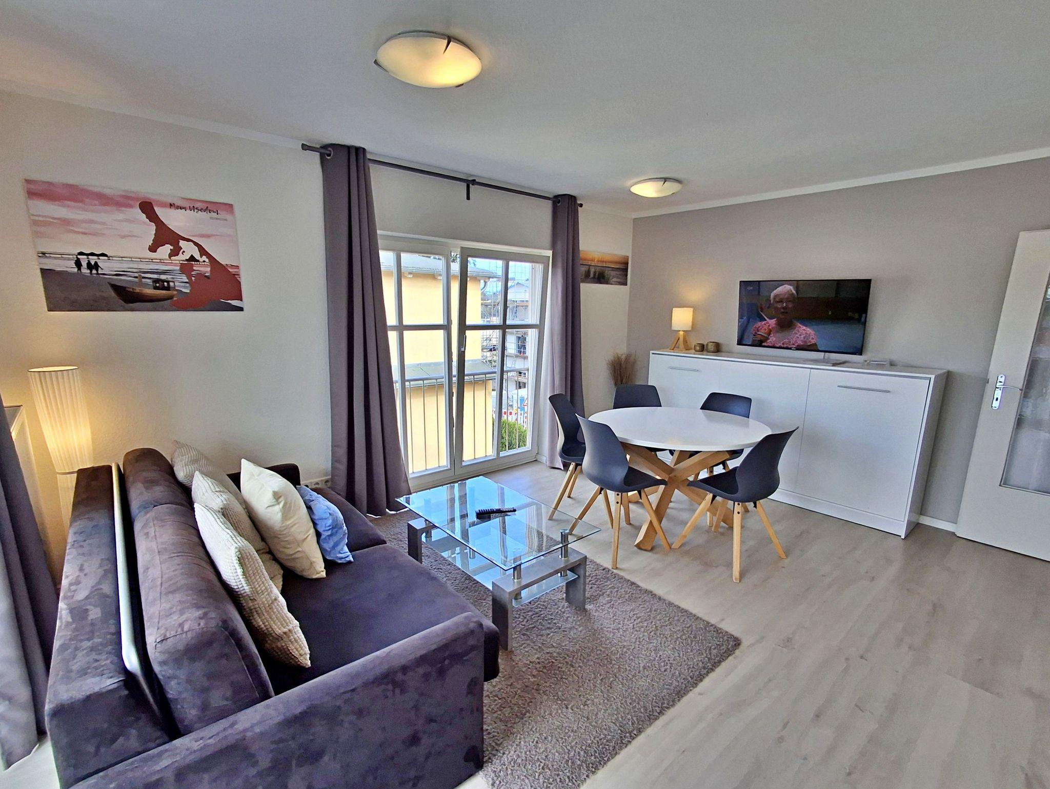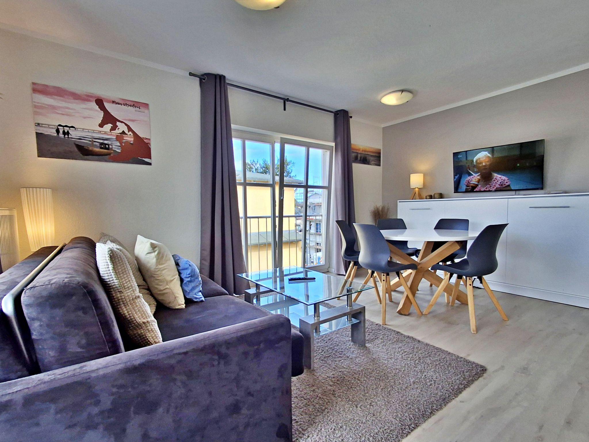 Herzlich willkommen in der hellen und freundlichen Ferienwohnung in der zweiten Etage des Feriendomizils Goethestraße! Auf 48 qm bietet diese schöne Wohnung Platz für bis zu 4 Personen, damit Sie einen erholsamen und entspannten Urlaub genießen können. Die stilvoll eingerichtete Wohnung verfügt über ein einladendes Wohn- und Esszimmer, das mit einer bequemen Couch ausgestattet ist, die auch Platz für 2 weitere Personen bietet. Hier finden Sie auch einen Flachbild-TV und einen Esstisch mit 4 Stühlen. In der vollwertigen Küche stehen Ihnen ein 4-Platten-Herd, Backofen, Spülmaschine, Wasserkocher und Kaffeemaschine zur Verfügung - alles, was Sie für die Zubereitung Ihrer Lieblingsgerichte benötigen! Das separate Schlafzimmer ist mit einem gemütlichen Doppelbett, einem großzügigen Kleiderschrank und einem zusätzlichen Flachbild-TV ausgestattet, sodass Sie sich auch hier wohlfühlen können. Das Tageslicht-Bad bietet Ihnen eine Dusche und WC für Ihren Komfort. Genießen Sie die frische Ostseeluft auf unserem kleinen Balkon, der mit zwei Sitzmöglichkeiten ausgestattet ist - perfekt, um sich zu jeder Tageszeit zu entspannen. Zudem stehen Ihnen W-LAN und ein Parkplatz direkt hinter dem Haus kostenfrei zur Verfügung.