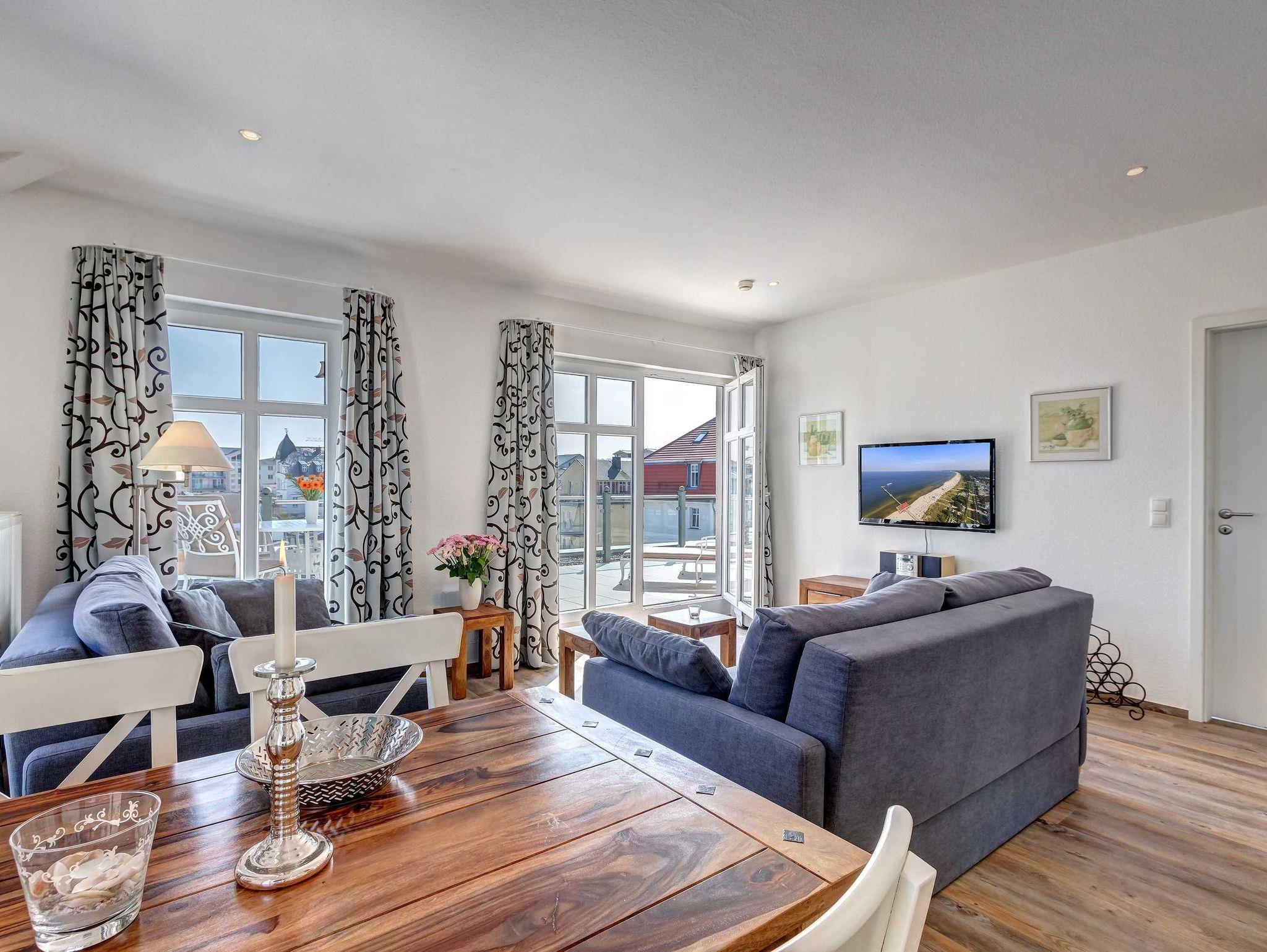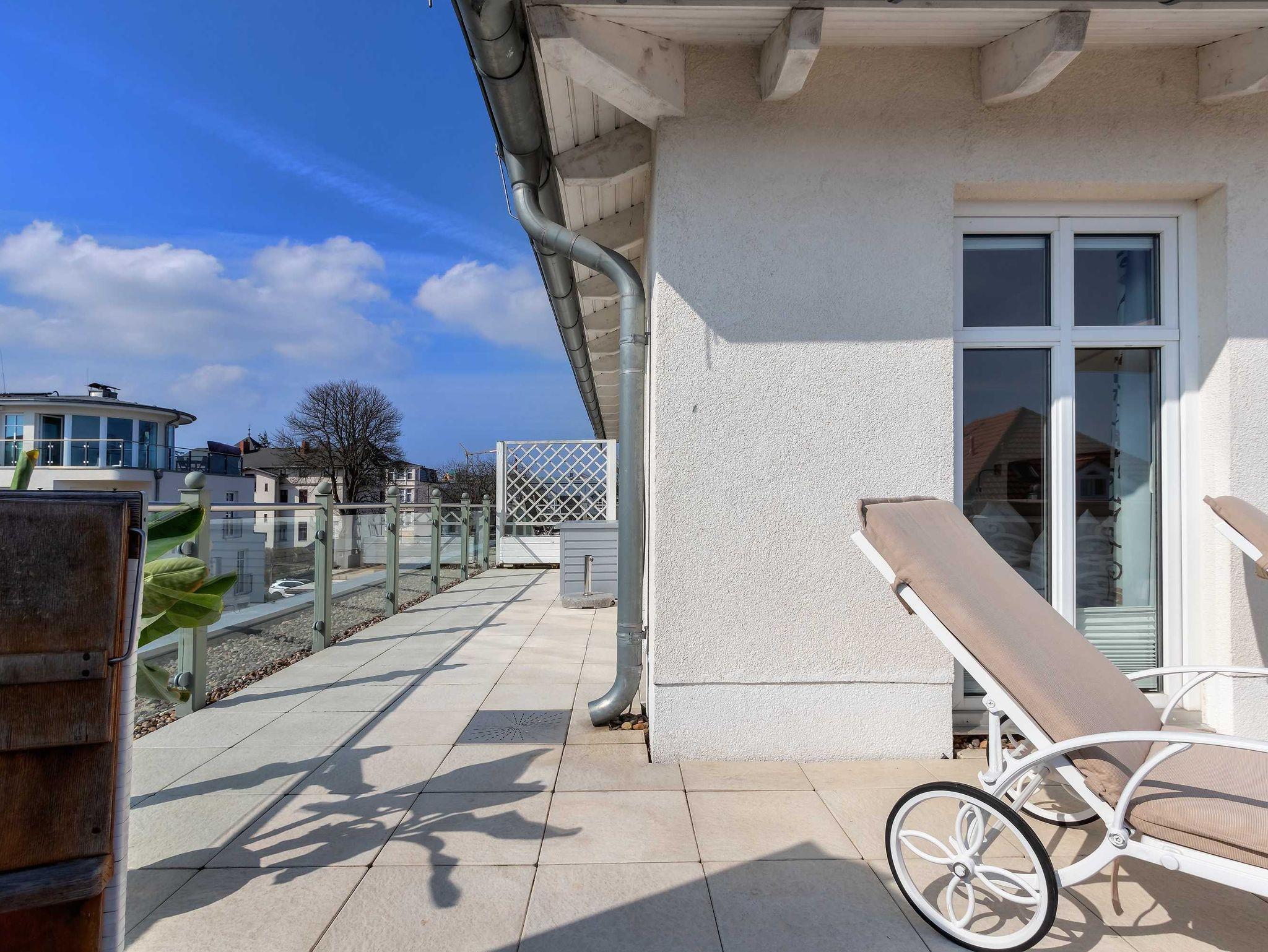 Schickes geräumiges 3-Zimmer-Appartement mit moderner hochwertiger Ausstattung. Zwei separate Schlafzimmer, Wohnzimmer mit Küchenbereich und Essplatz, Duschbad, 45 qm Dachterrasse über Eck nach Osten und Süden mit Sonne von morgens bis abends und herrlichem Seeblick. Die Wohnung verfügt über einen Tiefgaragen-Pkw-Stellplatz. In der Garage können auch Fahrräder und ähnliches untergestellt werden. Von der Villa Aquamarina sind es zum Ortszentrum und der Seebrücke ca. 3 Minuten zu Fuß. Zum Strand sind es 50 m. Die Wohnungen der Villa Aquamarina verfügen alle über passwortgeschütztes WLAN (gerätegebunden, Euro 1,50 pro Tag und pro Gerät).