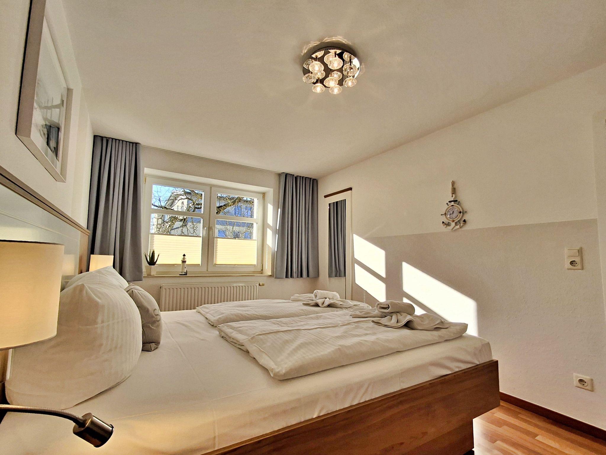 Das separate Schlafzimmer ist mit einem komfortablen Doppelbett ausgestattet. Das Badezimmer verfügt über Dusche und WC.