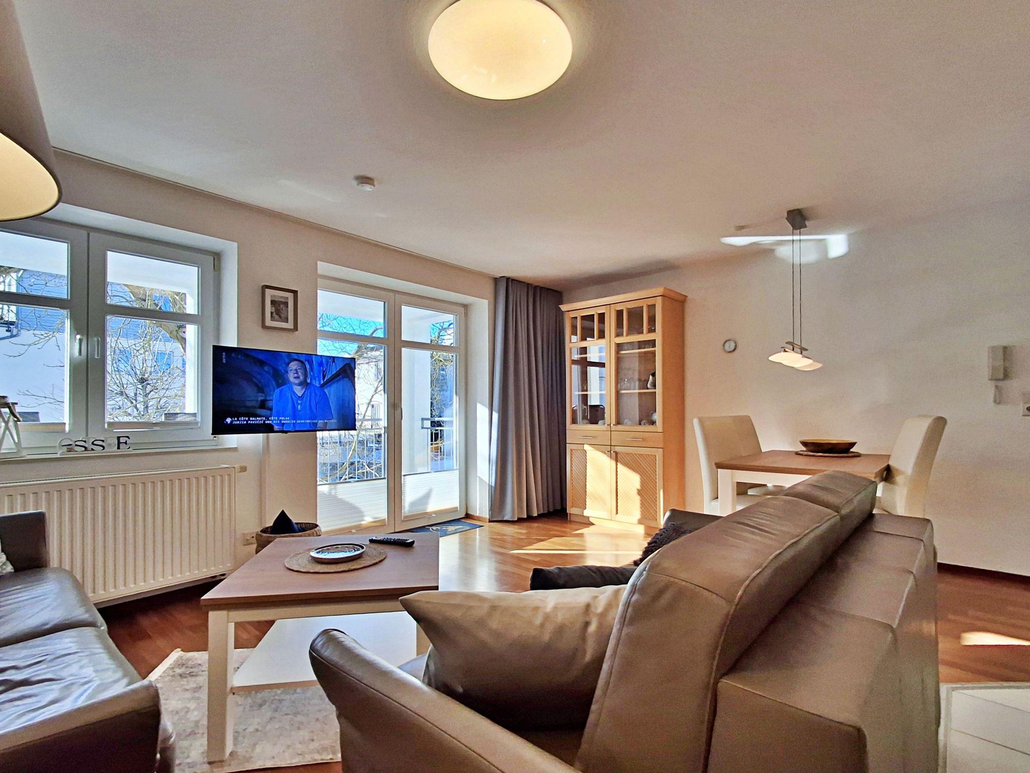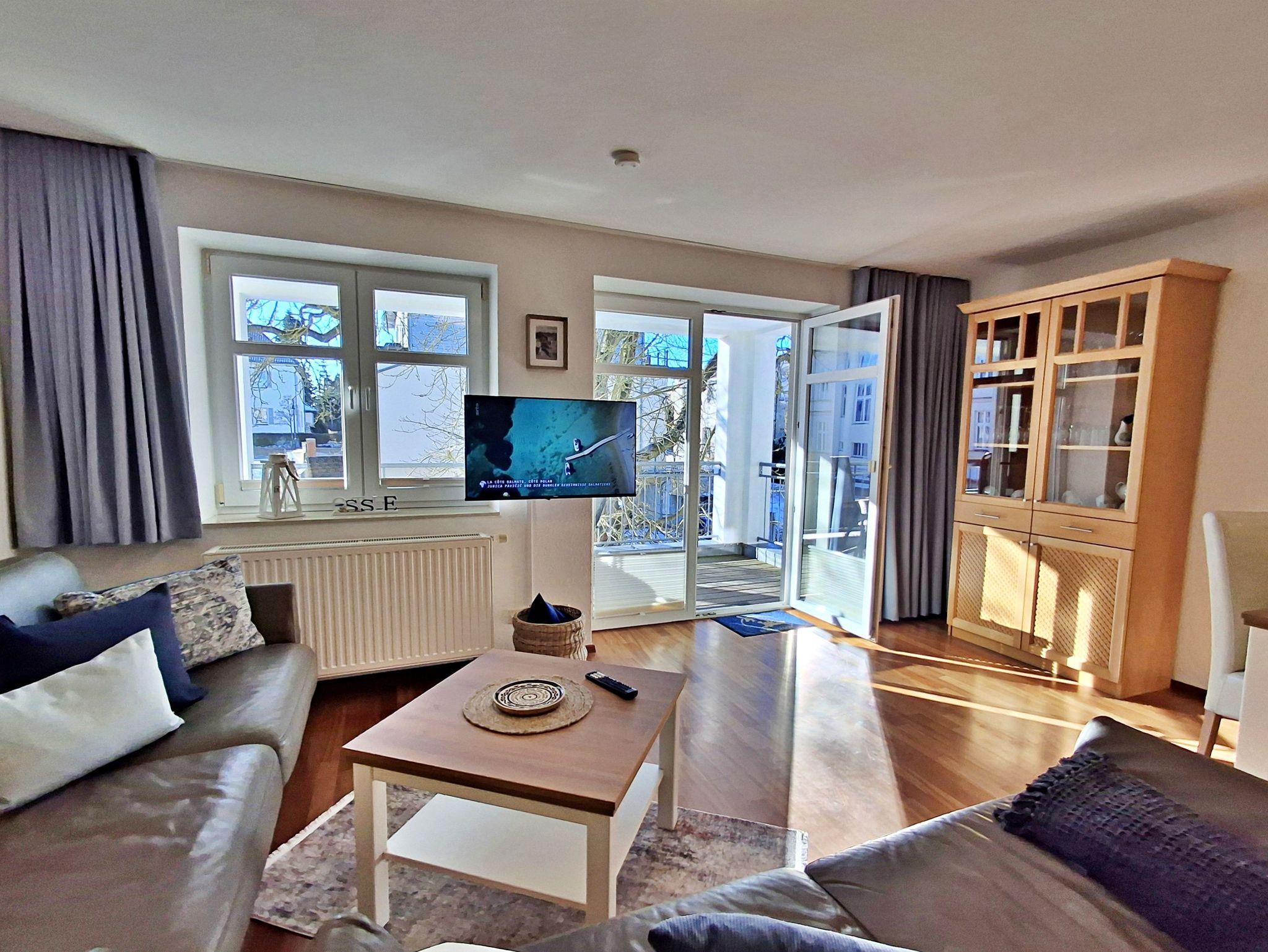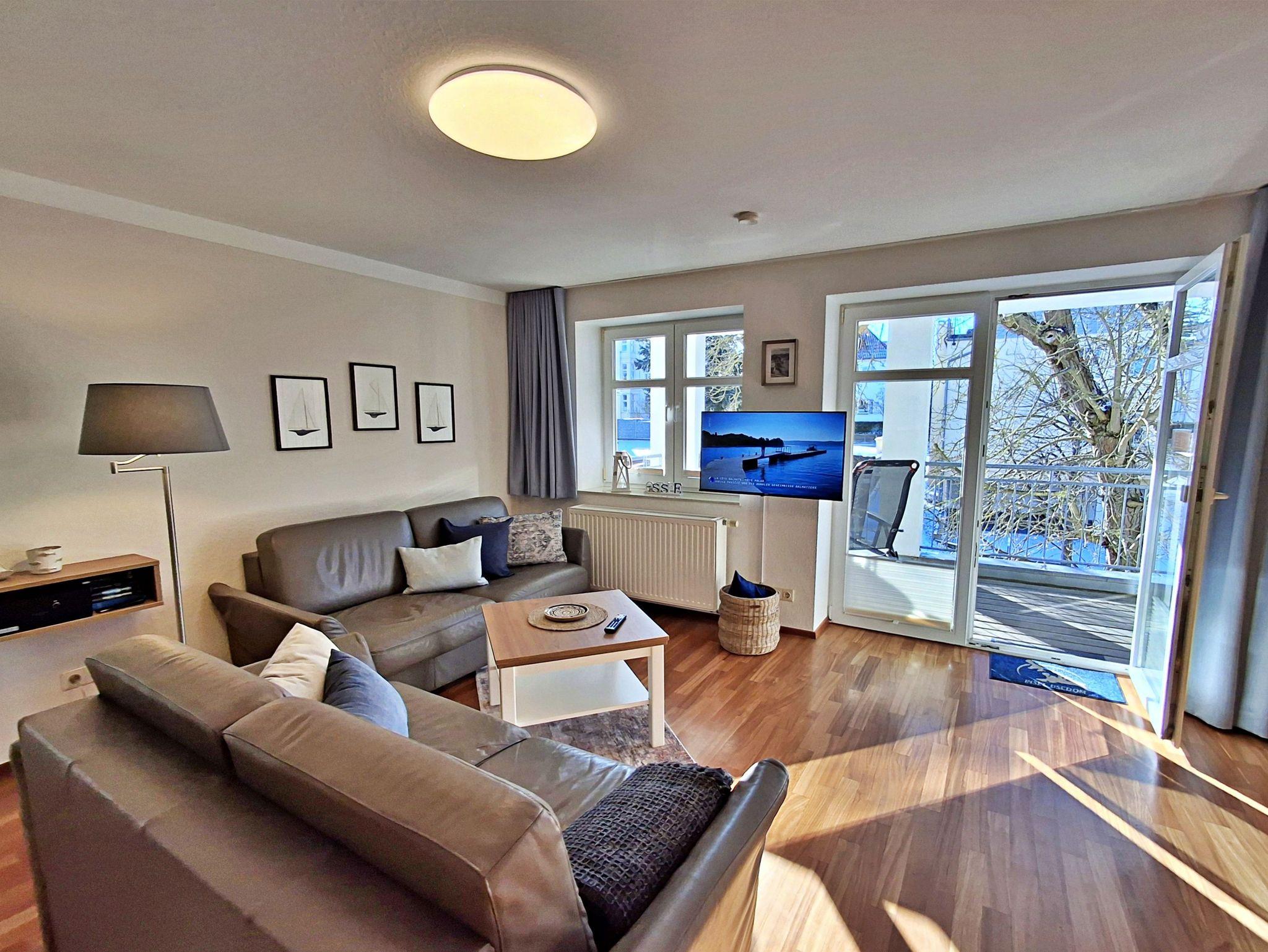Der helle Wohnbereich ist komfortabel eingerichtet und verfügt über zwei gemütliche Sofas sowie einen Esstisch mit vier Stühlen, der ausreichend Platz für gemeinsame Mahlzeiten bietet. Ein besonderes Highlight ist der großzügige Westbalkon, auf dem Sie bei schönem Wetter bereits am Morgen Ihren Kaffee genießen oder den Abend entspannt bei einem Glas Wein ausklingen lassen können.