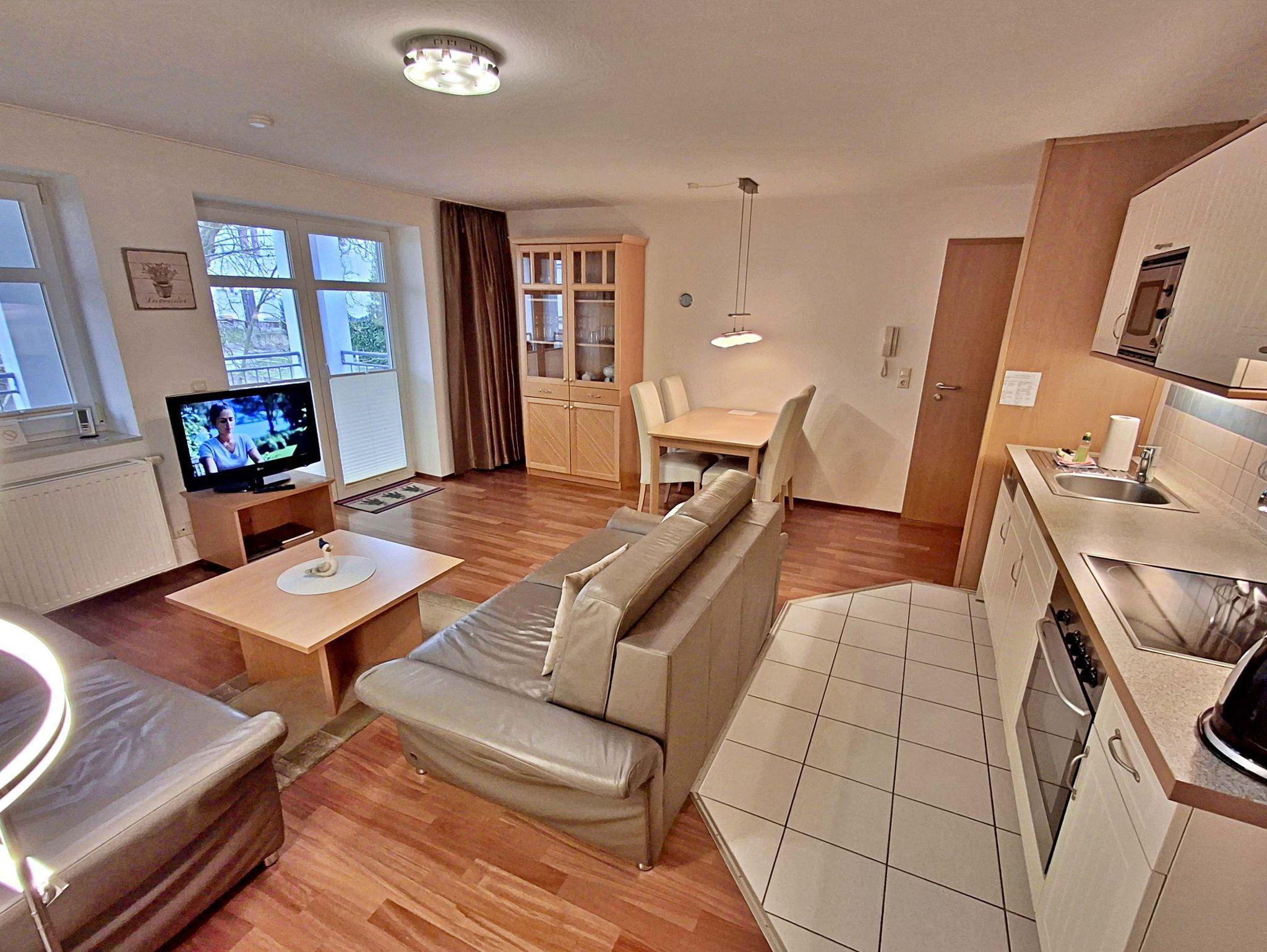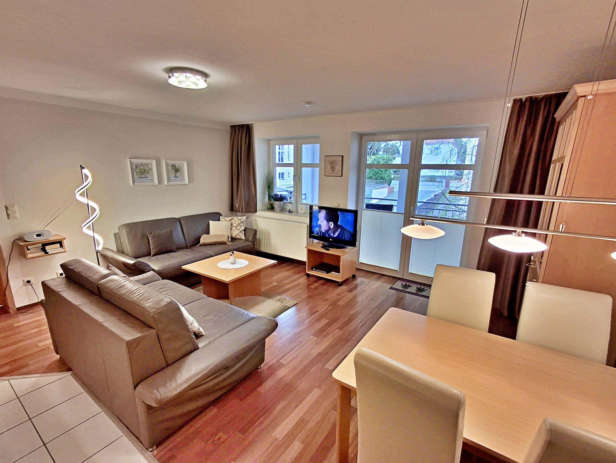 Die moderne 2-Zimmer-Wohnung Strandläufer im 2. Obergeschoss mit Balkon für max. 4 Erwachsene und 1 Kleinkind bis 3 Jahre befindet im Nebengebäude der stilvoll restaurierten Villa Ahlbeck - nur wenige Schritte von der Promenade und dem Strand entfernt. Im Wohnbereich befinden sich neben den zwei gemütlichen Sofas auch ein Esstisch mit 4 Stühlen, der genügend Platz für 4 Personen bietet. Das Highlight der Wohnung ist der großzügige Balkon in West-Ausrichtung, wo Sie bei schönem Wetter bereits morgens Ihren Kaffee genießen oder den Abend bei einem Glas Wein ausklingen lassen können. Die moderne Küchenzeile mit Ceranherd, Backofen, Geschirrspüler, Mikrowelle, Kaffeemaschine, Wasserkocher und Toaster lässt keine Wünsche offen. Für die Unterhaltung sorgen ein Flachbild-TV, Radio-CD-Player und kostenfreies W-LAN. Das Schlafzimmer verfügt über ein Doppelbett und das Badezimmer hat DU/WC.