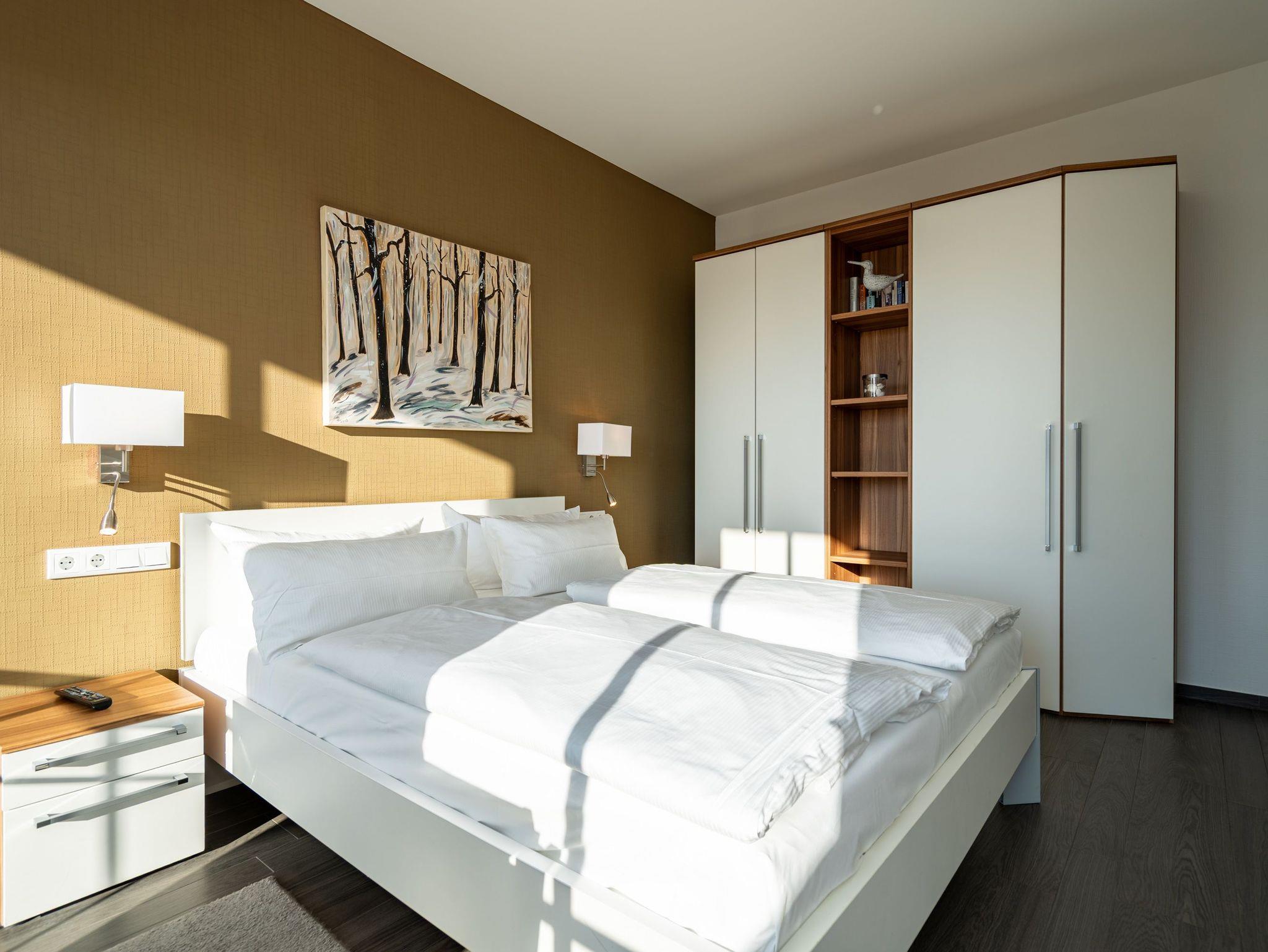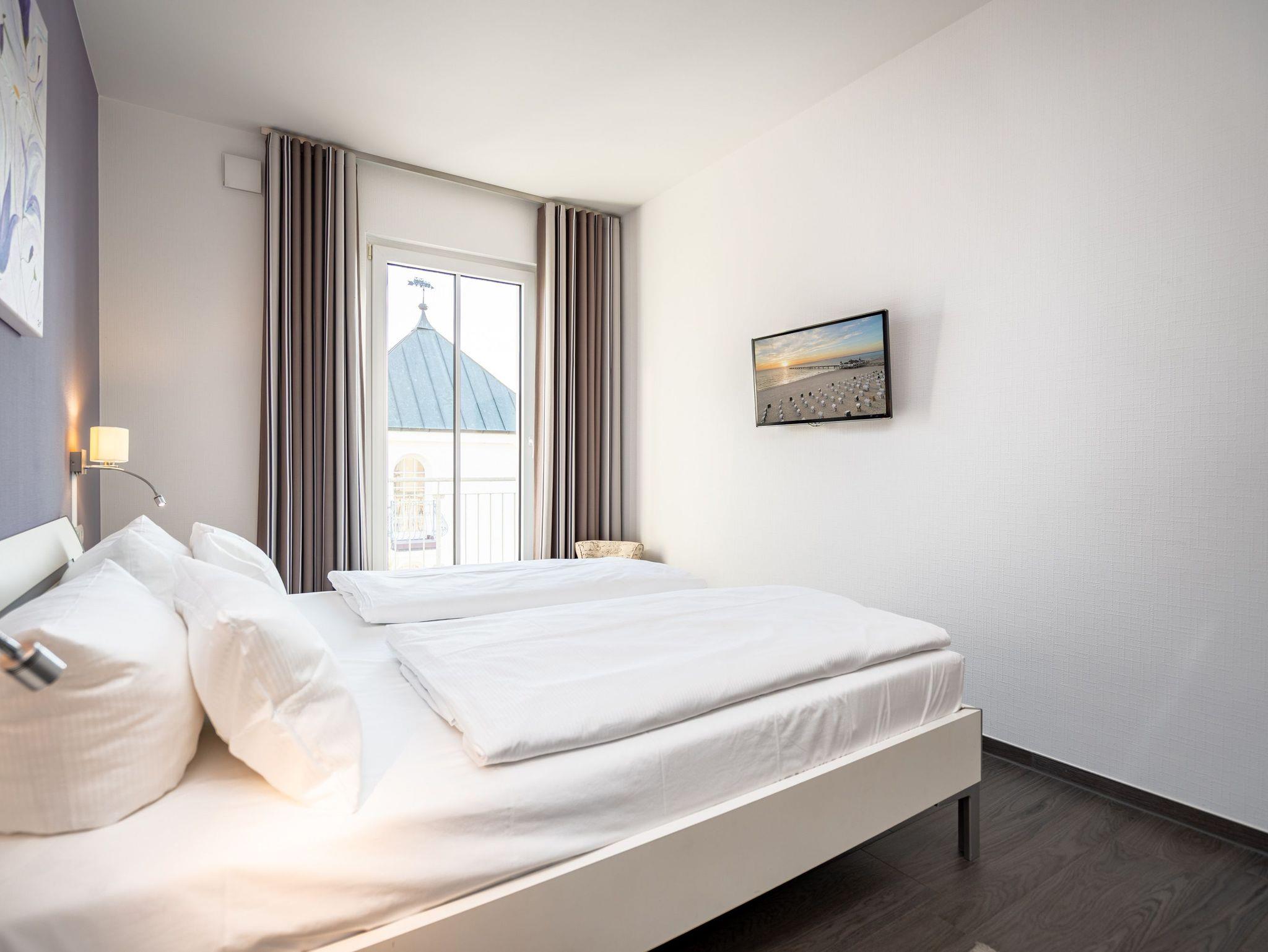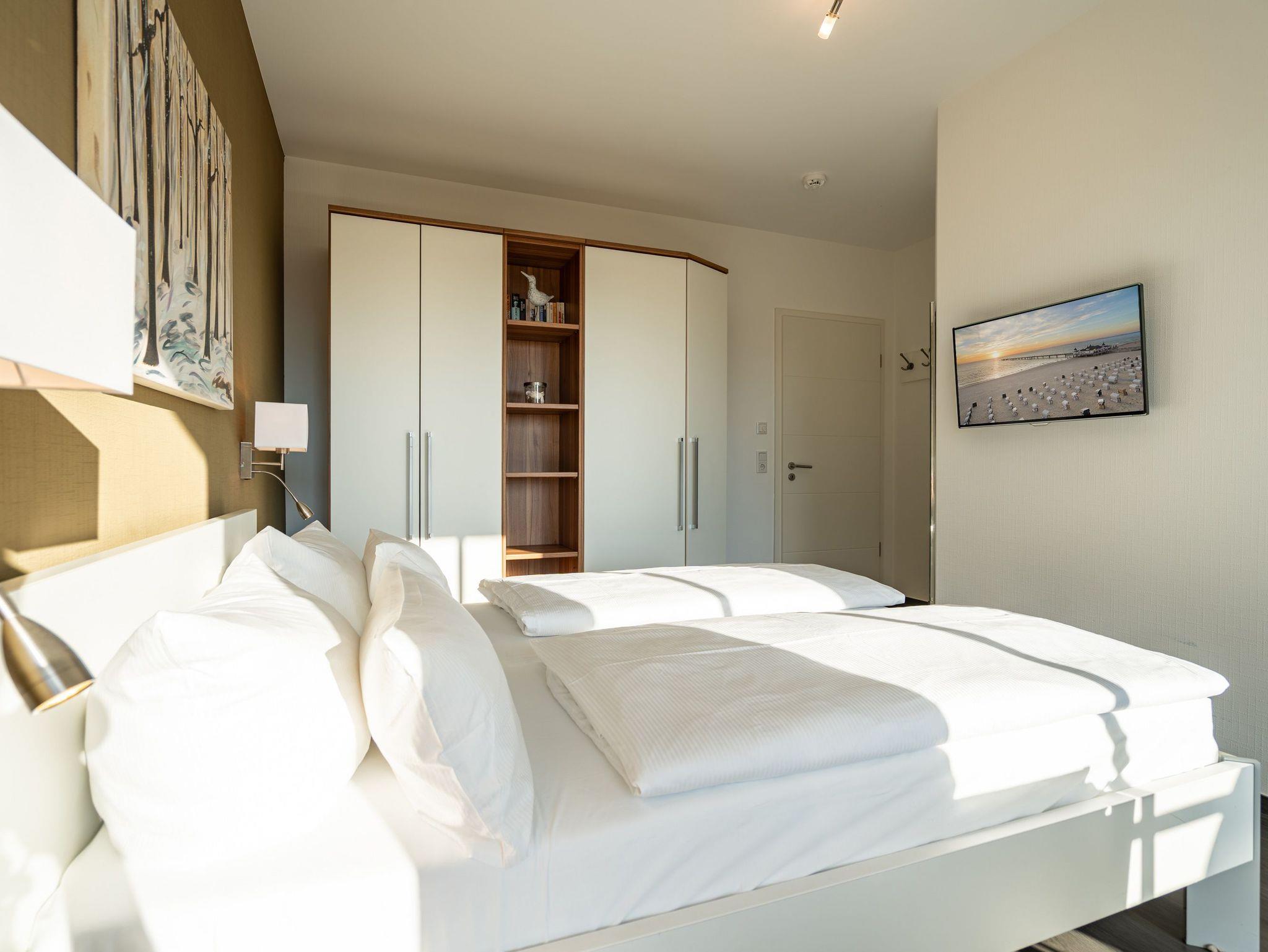 Die Ferienwohnung 20 im Dünenpalais ist einfach schön! Hochwertig und geschmackvoll gestaltet, liegt es im 2. Obergeschoss des Südhauses. Es erwarten Sie 3 Räume (buchbar für 4 Personen und 1 Kleinkind bis 3 Jahre im Kinderreisebett), aufgeteilt auf ein Wohnzimmer mit gemütlicher Sitzgruppe und Flat-TV, ergänzt durch eine komplett ausgestattete Küchenzeile und den Essbereich. Durch seine 2 Schlafzimmer mit Doppelbetten und 2 Bäder mit Dusche und WC eignet sich dieses Appartement besonders für Familien oder befreundete Pärchen. Ein besonderes Highlight ist der Gaskamin, der per Fernbedienung ganz einfach zu nutzen ist. Der großzügige Südbalkon und ein zweiter Ostbalkon bieten auch außen genug Platz zum Wohlfühlen. Auf Wunsch stellen wir ein Kinderreisebett (ohne Matratze [&] Bettzeug) und einen Kinderhochstuhl gegen einen Aufpreis zur Verfügung. Ein PKW-Stellplatz ( Nr.17) steht Ihnen in der Tiefgarage zur Verfügung. Das WLAN-Netz ist kostenfrei nutzbar.