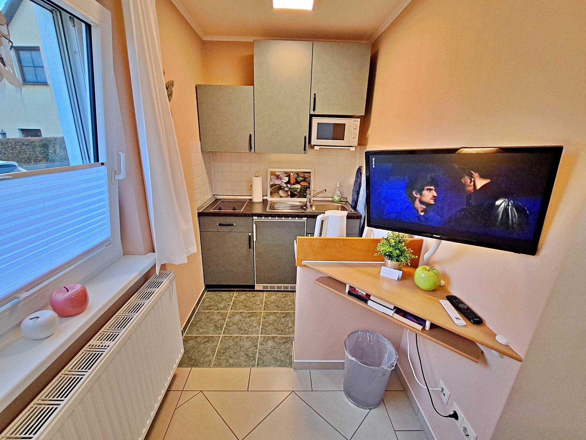 Diese ca. 30 qm große Nichtraucher-Ferienwohnung ist modern und komfortabel eingerichtet. Sie verfügt über einen Wohnbereich mit Couch, Essplatz, Flat-TV sowie einer angrenzenden Pantryküche mit 2-Platten-Herd, Mikrowelle, Kühlschrank mit Gefrierfach, Kaffeemaschine, Wasserkocher und Toaster. Das Schlafzimmer ist mit einem Doppelbett, einem Einzelbett sowie zusätzlichem Flat-TV ausgestattet. Das Badezimmer hat eine Dusche und WC. Eine möblierte Terrasse direkt an der Wohnung komplettiert die gemütliche Ausstattung der Wohnung. Hier können Sie das Frühstück genießen oder den Abend bei einem Glas Wein ausklingen lassen. W-LAN und ein Pkw-Stellplatz direkt am Haus stehen Ihnen kostenfrei zur Verfügung.