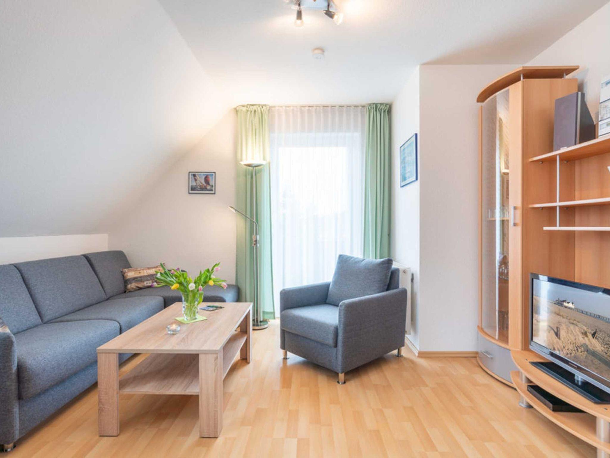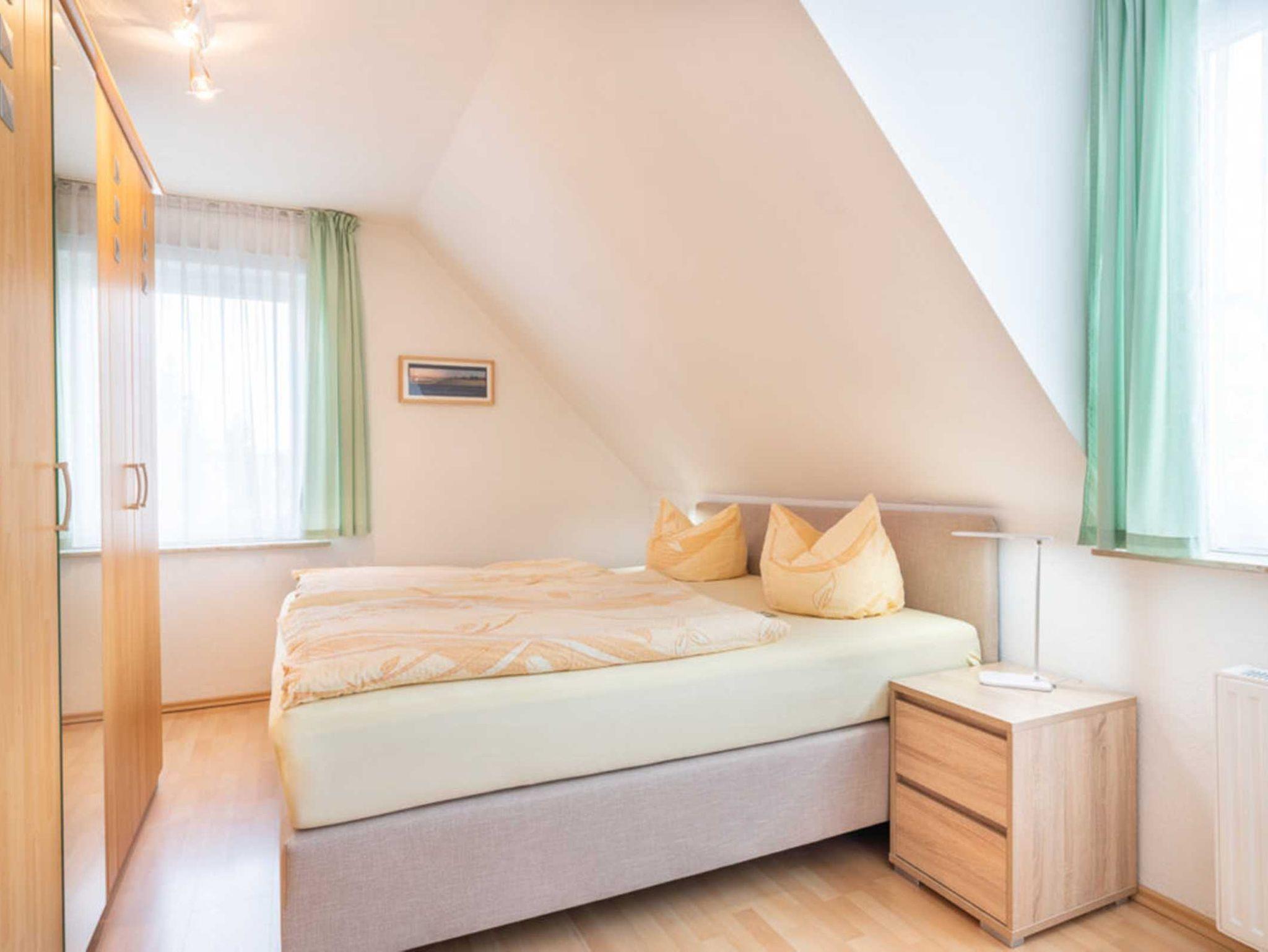 Die Wohnung Maritim erstreckt sich auf zwei Etagen und befindet sich im Ober- und Dachgeschoss des Hauses. Sie besteht aus Diele, Dusche/WC, zusätzlichem WC, kombiniertem Wohnzimmer mit Küche und zwei Schlafzimmern.