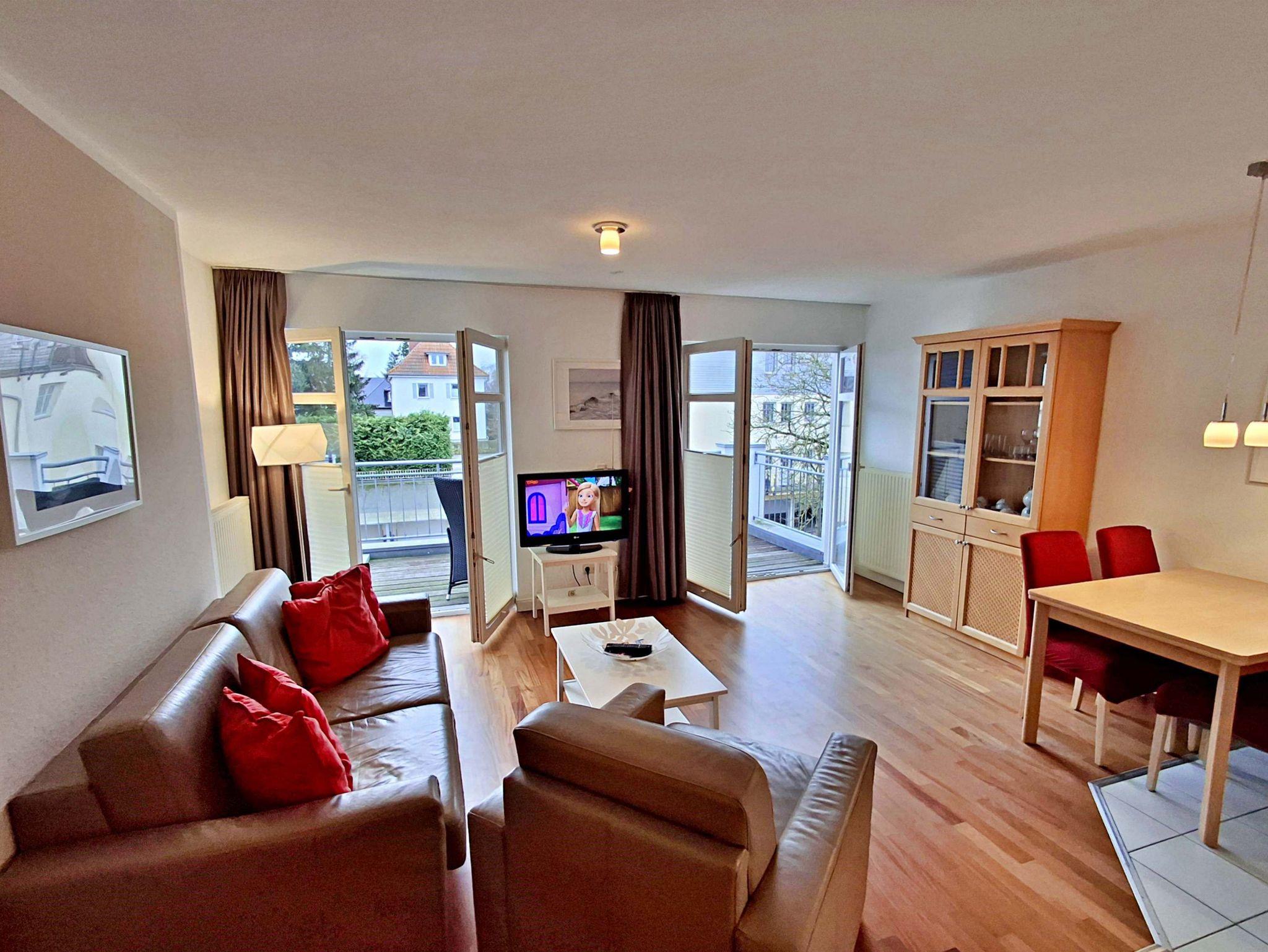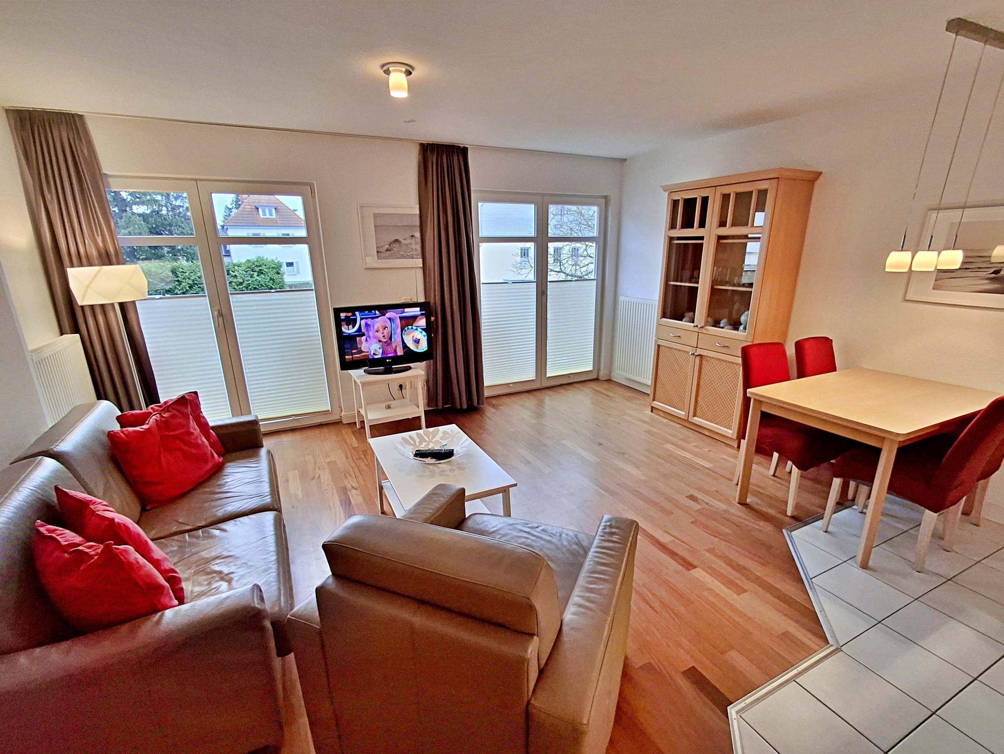 Die geräumige 3-Zimmer-Wohnung Strandkrabbe im 3. Obergeschoss mit Balkon für max. 5 Erwachsene und 1 Kleinkind bis 3 Jahre befindet im Nebengebäude der stilvoll restaurierten Villa Ahlbeck - nur wenige Schritte von der Promenade und dem Strand entfernt. Im Wohnbereich befinden sich neben der gemütlichen Couch auch ein Sessel sowie ein Esstisch mit 4 Stühlen. Das Highlight der Wohnung ist der großzügige Balkon in Süd-West-Ausrichtung, wo Sie bei schönem Wetter bereits morgens Ihren Kaffee genießen oder den Abend bei einem Glas Wein ausklingen lassen können. Die moderne Küchenzeile mit Ceranherd, Backofen, Geschirrspüler, Mikrowelle, Kaffeemaschine, Wasserkocher und Toaster lässt keine Wünsche offen. Für die Unterhaltung sorgen ein Flachbild-TV, Radio-CD-Player und kostenfreies W-LAN. Die beiden Schlafzimmer verfügen jeweils über ein Doppelbett und das Badezimmer hat DU/WC.
