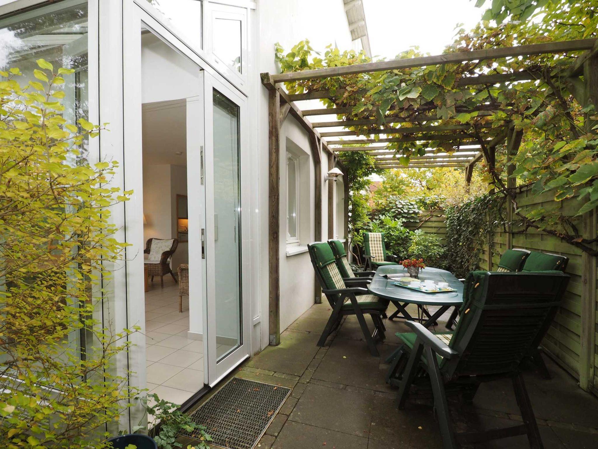 Gemütliche mit 4-DTV-Sternen zertifizierte Ferienwohnung für 2 Personen (2 Aufbettungen möglich) im Nebengebäude (56m²) mit separatem eigenen Eingang vom Hof, Gartenteil mit Liegewiese, Ausgang zur Terrasse in Südlage, Wintergarten mit Essplatz und Wohnbereich mit Doppel-Schlafcouch (140 x 190 cm) , 32'' Sat- TV, Mini-HiFi-Anlage mit CD-Player, Internet VDSL / W-LAN, Safe im Schrank, Wohnküche im Erdgeschoss, Geschirrspüler, Schlafzimmer mit Doppelbett (Liegefläche 180 x 200 cm), Bad mit Badewanne im Obergeschoss.
