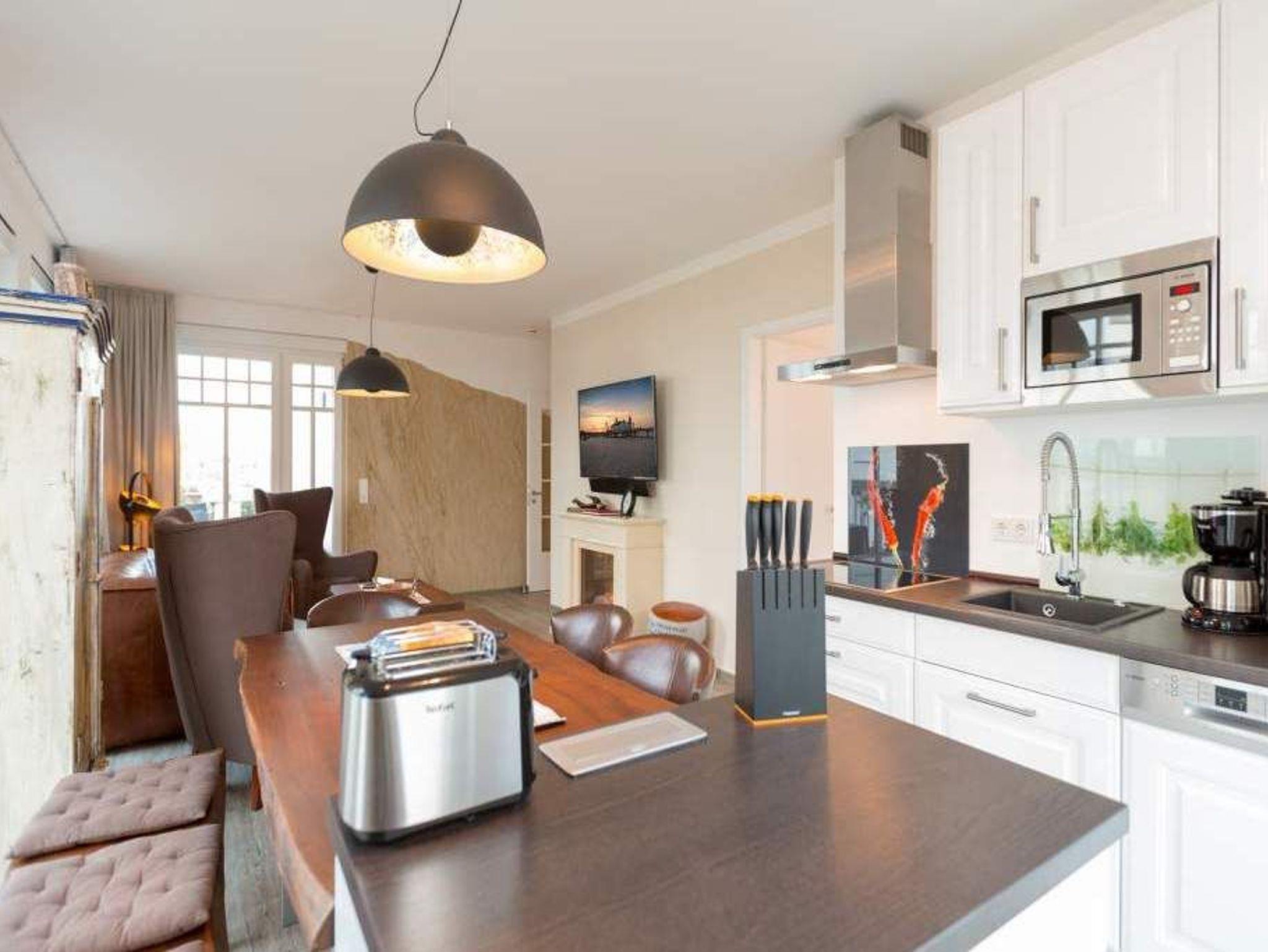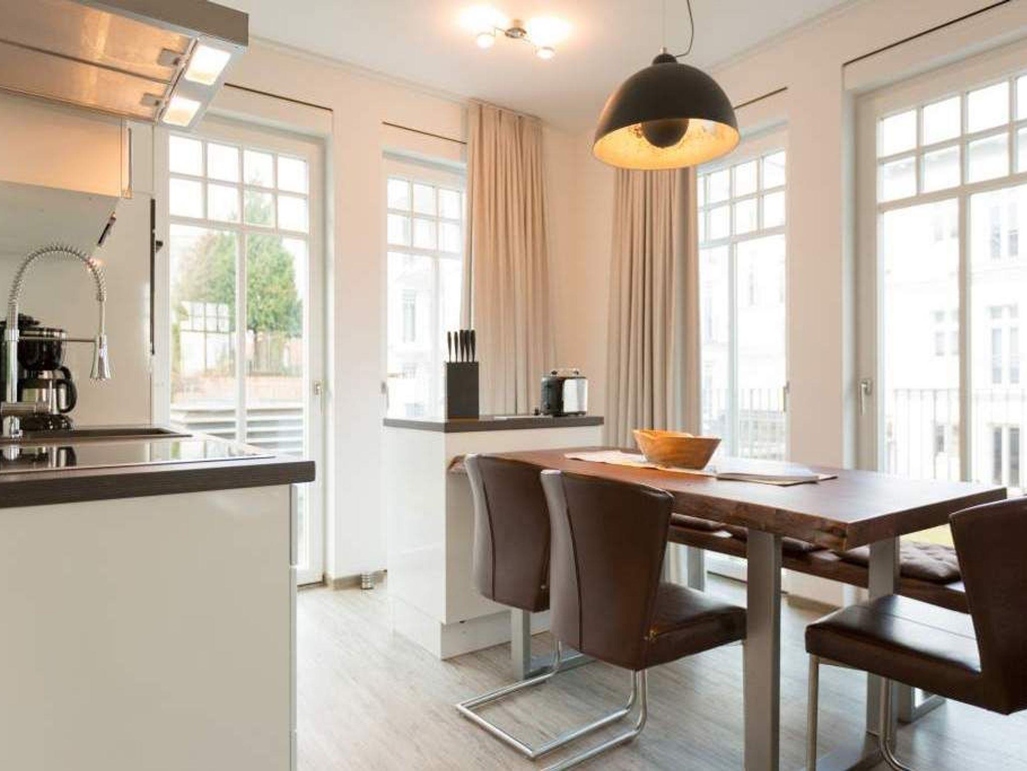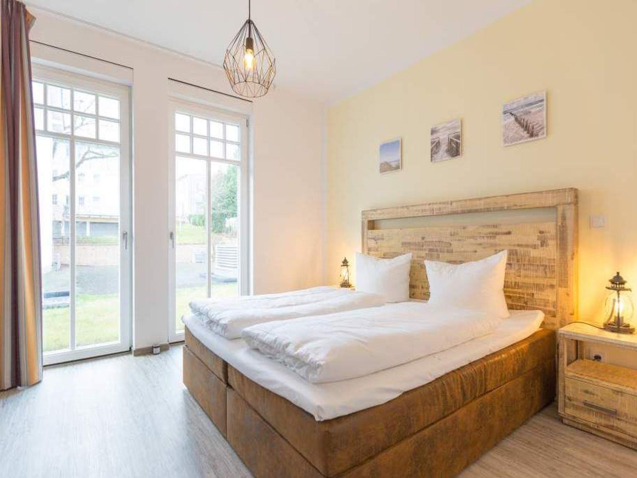 Zu spüren, wie jeder Muskel sich entspannt, wie die Seele zur Ruhe kommt und man tief durchatmet, während durch die großen, offenen Fenster die gerade einmal 20 Meter entfernte Ostsee ins Wohnzimmer rauscht ? angekommen in der Wohnung Nummer 4 im Erdgeschoss der Villa Westend sind Sie auch gleich im Urlaubshimmel. Denn die 84 Quadratmeter, die Platz für 4 Personen [&] 1 Kleinkind ( bis 2 Jahre im Kinderreisebett) bietet, ist anders, ist extravagant, stylisch und doch unglaublich einladend, behaglich und komfortabel. Hier treffen shabby Kolonialstil auf modernes Design, exotische Massivholzmöbel auf Art Deco und Industrial Chic. Ein harmonischer Stilmix, der diesem Urlaubsappartement ein ganz besonderes Flair verleiht. Die großen Ohrensessel oder die Ledercouch im luftigen und geräumigen Wohn-Esszimmer eignen sich bestens zum gemütlichen Relaxen. Ein Flat-TV mit integrierter Soundbar sorgt für Unterhaltung. Der Elektrokamin im Wohnzimmer bringt Kuschelstimmung auf Knopfdruck. Ein wunderschöner Echtholztisch ist das Verbindungsglied zur modernen und offenen Küche. Mit den hochwertigen Markengeräten macht das Kochen und Dinieren so richtig Spaß. Oder setzen Sie sich auf die Terrasse. Genießen Sie von hier aus die Sonne. Denn Dank der Süd-West-Ausrichtung können Sie hier zusätzlich zum wunderbaren Blick in den Garten auch die letzten Sonnenstrahlen des Tages noch auskosten. Auch wenn man im Urlaub möglichst keine Sekunde verschlafen möchte, verschaffen die beiden großen Doppelboxspringbetten (jeweils 1,80 m x 2,00 m) in den beiden Schlafzimmern einen erholsamen Schlaf. Viel Ablagemöglichkeit bieten hier die großen Vintage-Schränke. In jedem Schlafzimmer gibt es einen Flat-TV. Die Nichtraucher-Wohnung verfügt über zwei Bäder mit Dusche, Waschtisch und WC. Ein Highlight ist im Masterbad eine finnische Sauna, die für das ganz exklusive und eigene Spa-Gefühl sorgt. Handtücher liegen schon für Sie bereit und die Betten sind, wenn Sie ankommen, frisch bezogen. In der Tiefgarage steht für Sie ein Pkw-Stellplatz Nr. 25 zur Verfügung. WLAN gibt es kostenfrei.
