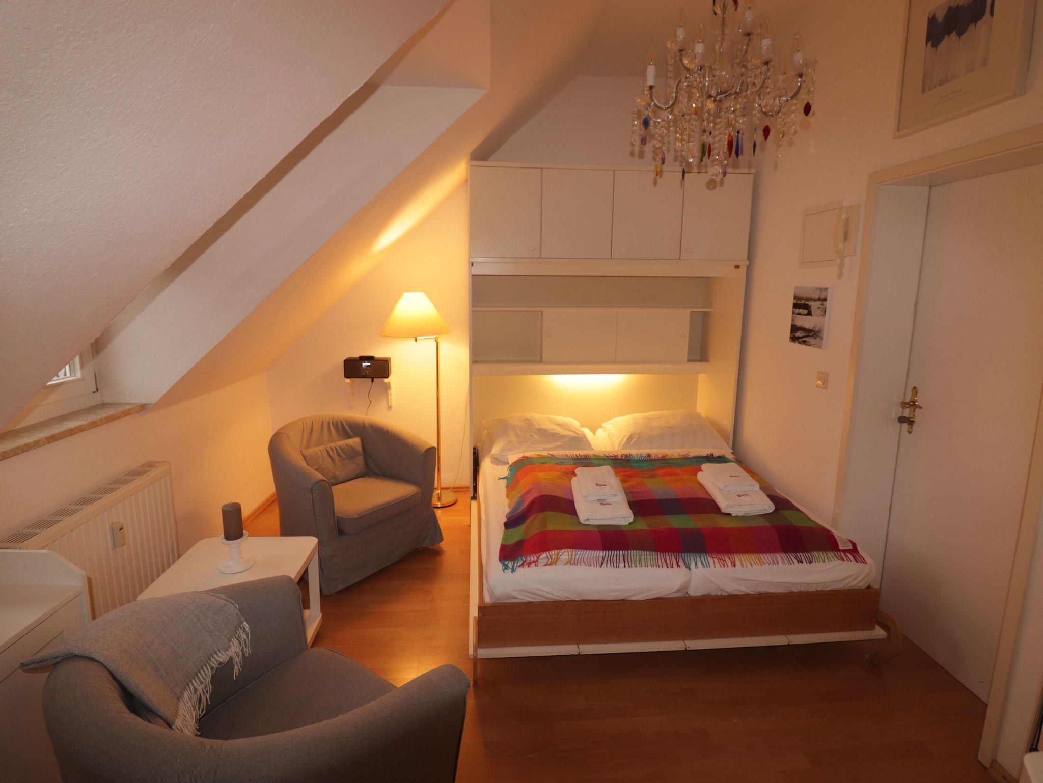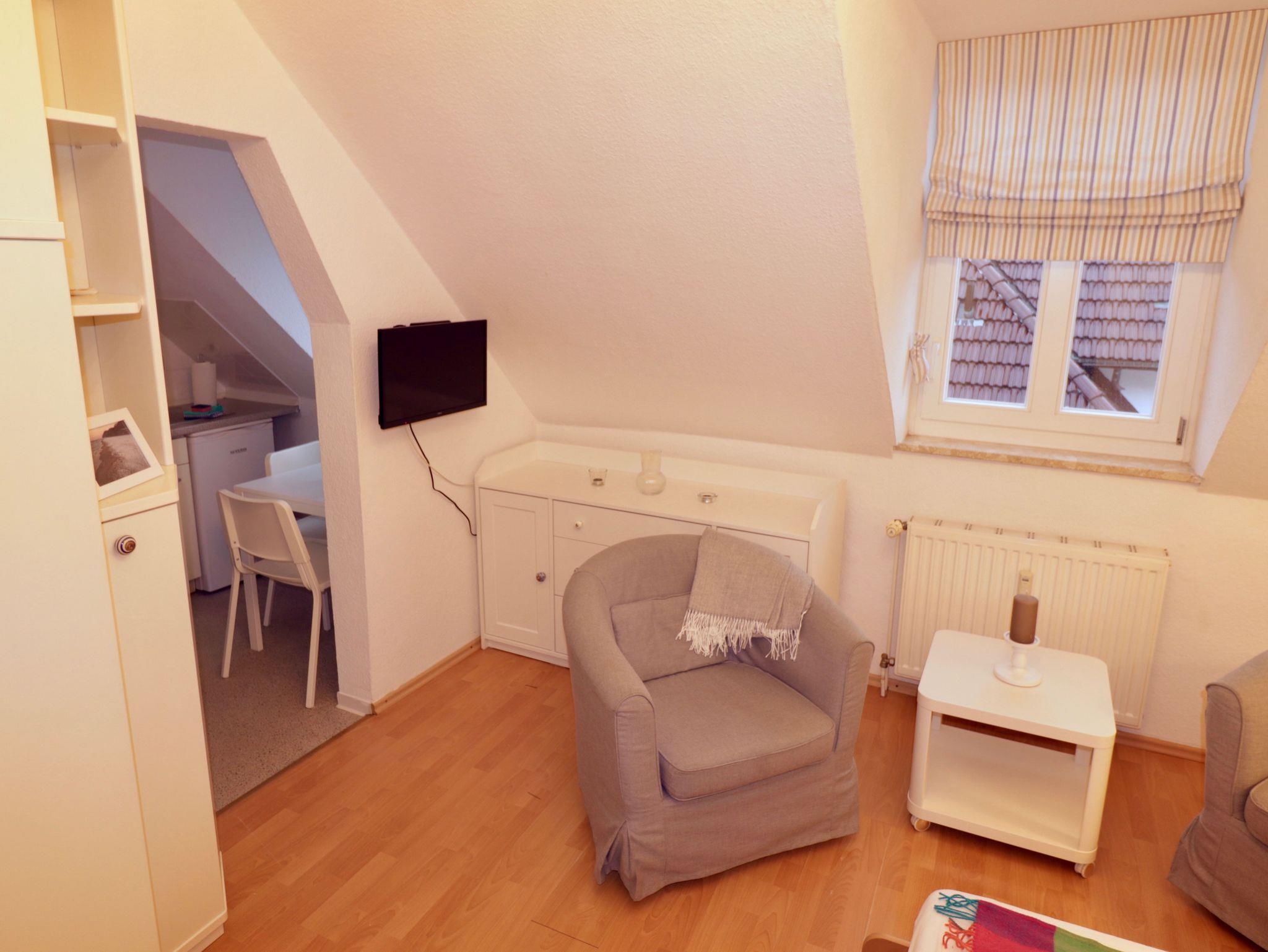 Zwei gemütliche Sessel laden zum Verweilen und Ausruhen ein. Mit dem Smart-TV Fernseher können Sie eine Vielzahl deutscher und internationaler Programme über Kabel empfangen oder ihre Lieblingsserie über Streamingdienste sehen. Sie hören Radio oder Podcasts über die kleine Hifi-Anlage mit Internetzugang oder über die Bluetooth-Schnittstelle mit ihrem Endgerät. In der Wohnung können Sie natürlich kostenfrei WLAN empfangen.