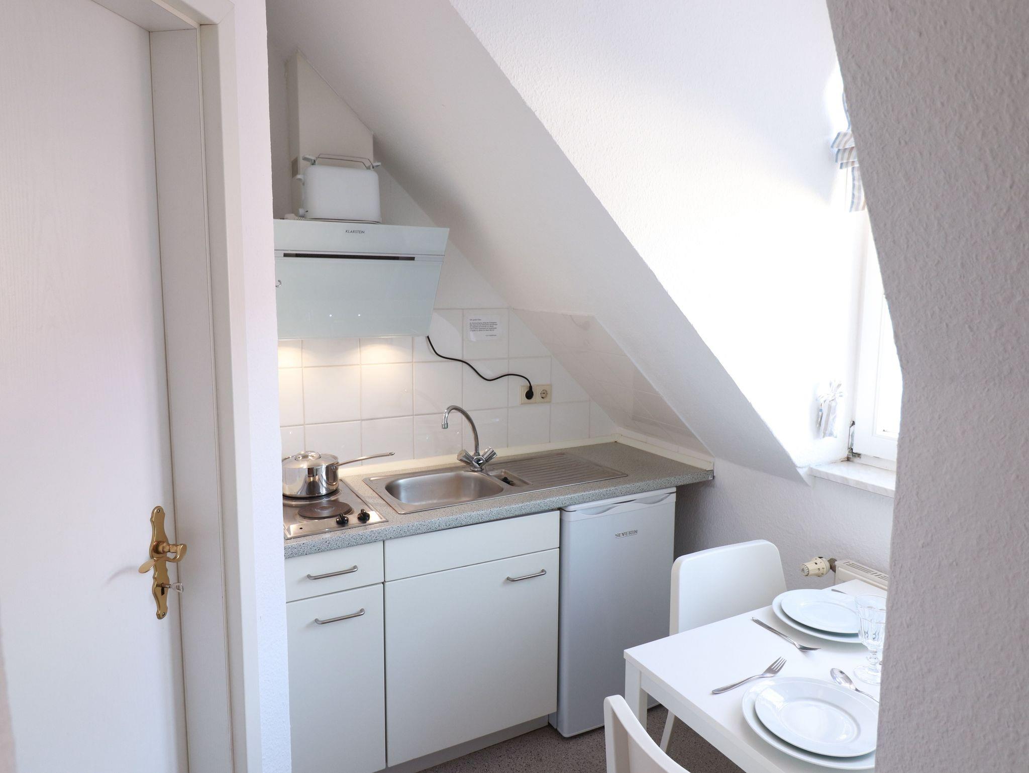 Abgetrennt vom Wohnzimmer befindet sich das moderne Duschbad (Waschbecken, Dusche, WC). Ferner finden Sie eine kleine Küchenzeile (Kochplatten, Kühlschrank, Spüle) vor, in der Sie schnell Ihr Frühstücksei und einfache Mittagsgerichte zubereiten können. Mit der Nespressomaschine können sie auch im Urlaub ihren Lieblingscafé genießen.