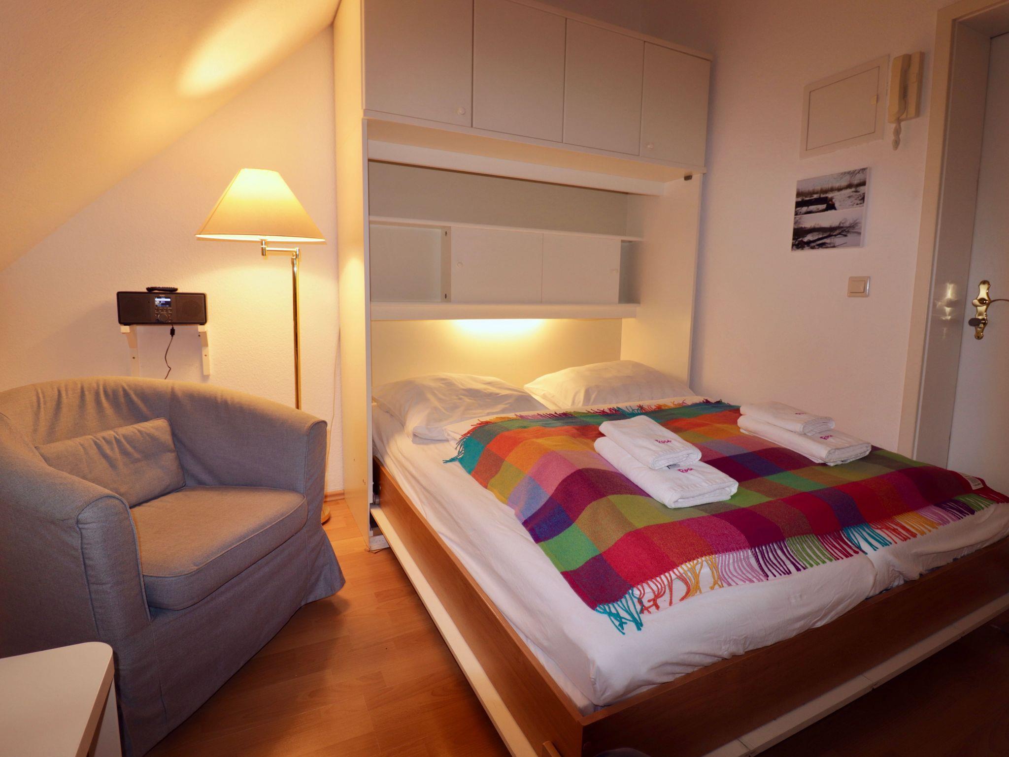 Sollten Sie die Option Bettwäsche gewählt haben, finden Sie Ihre Betten (160 x 200 cm) eines hochklappbaren Schrankbetts, bereits frisch bezogen vor. Die Kleiderschränke bieten genügend Platz, um Bekleidung und Gepäck für zwei Personen unterzubringen.