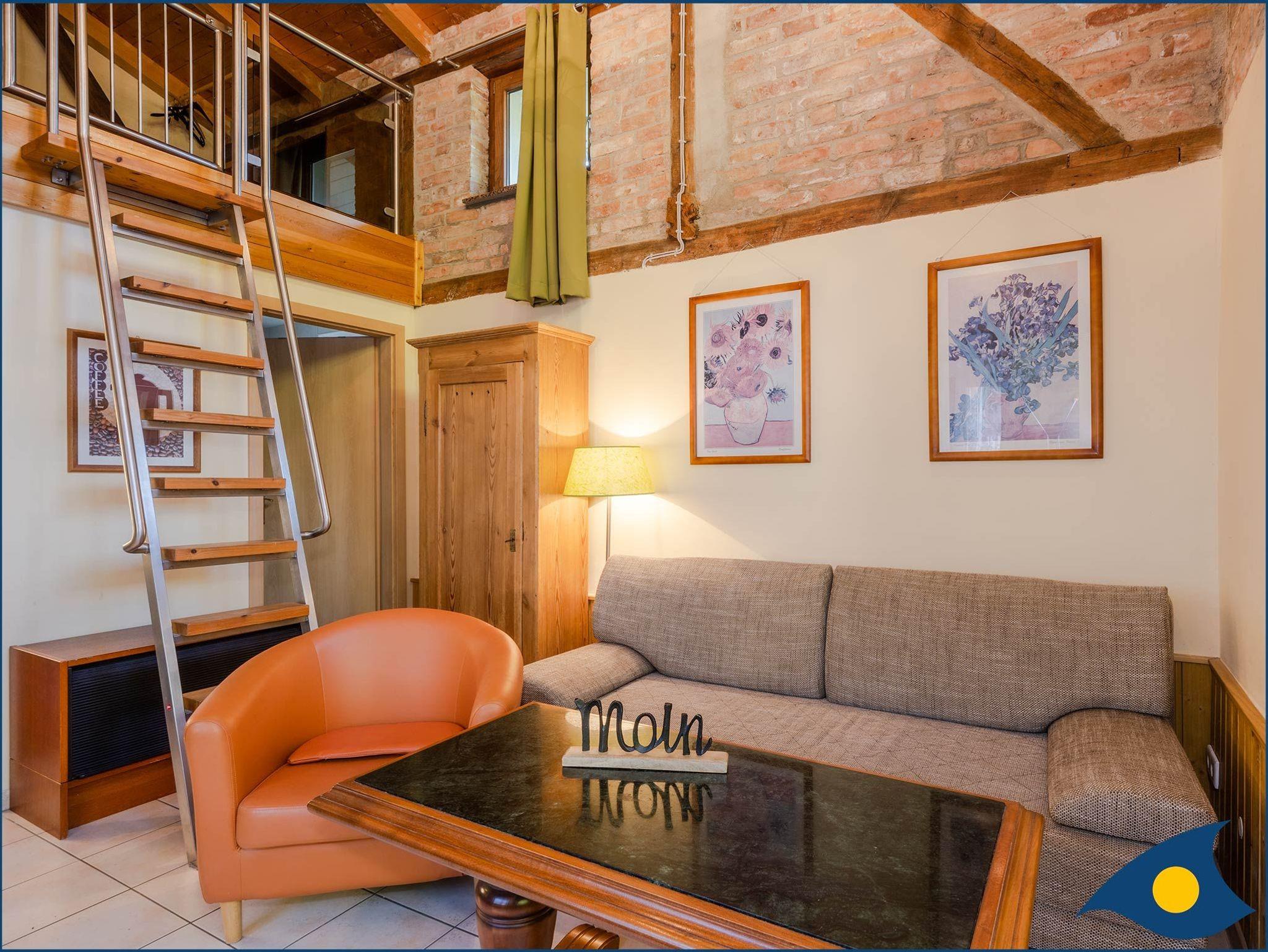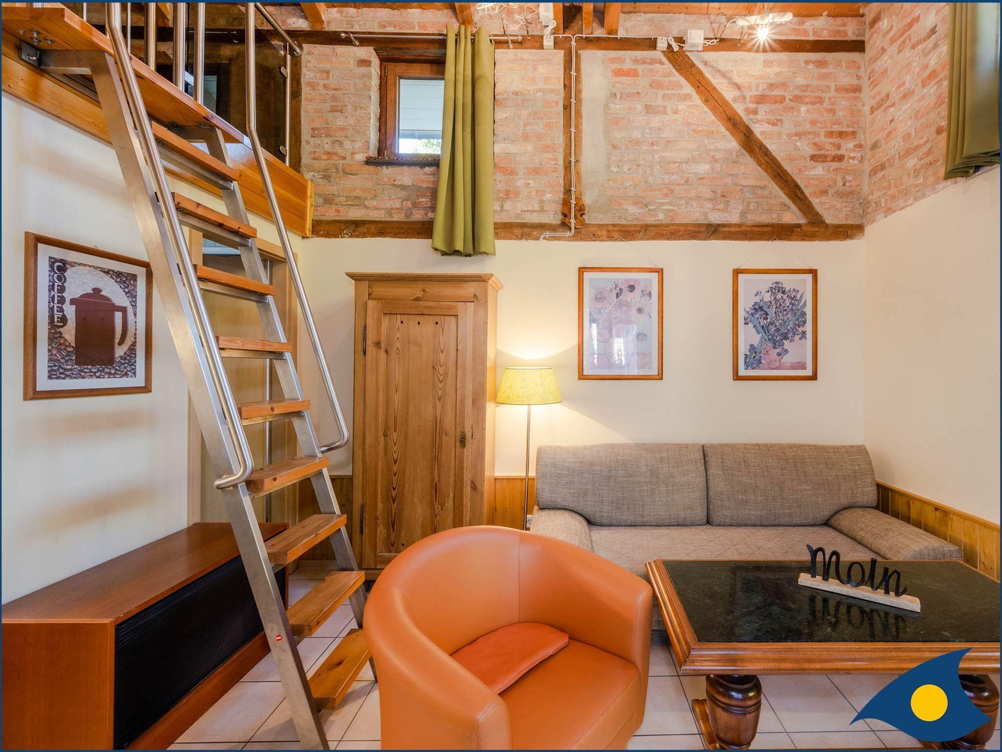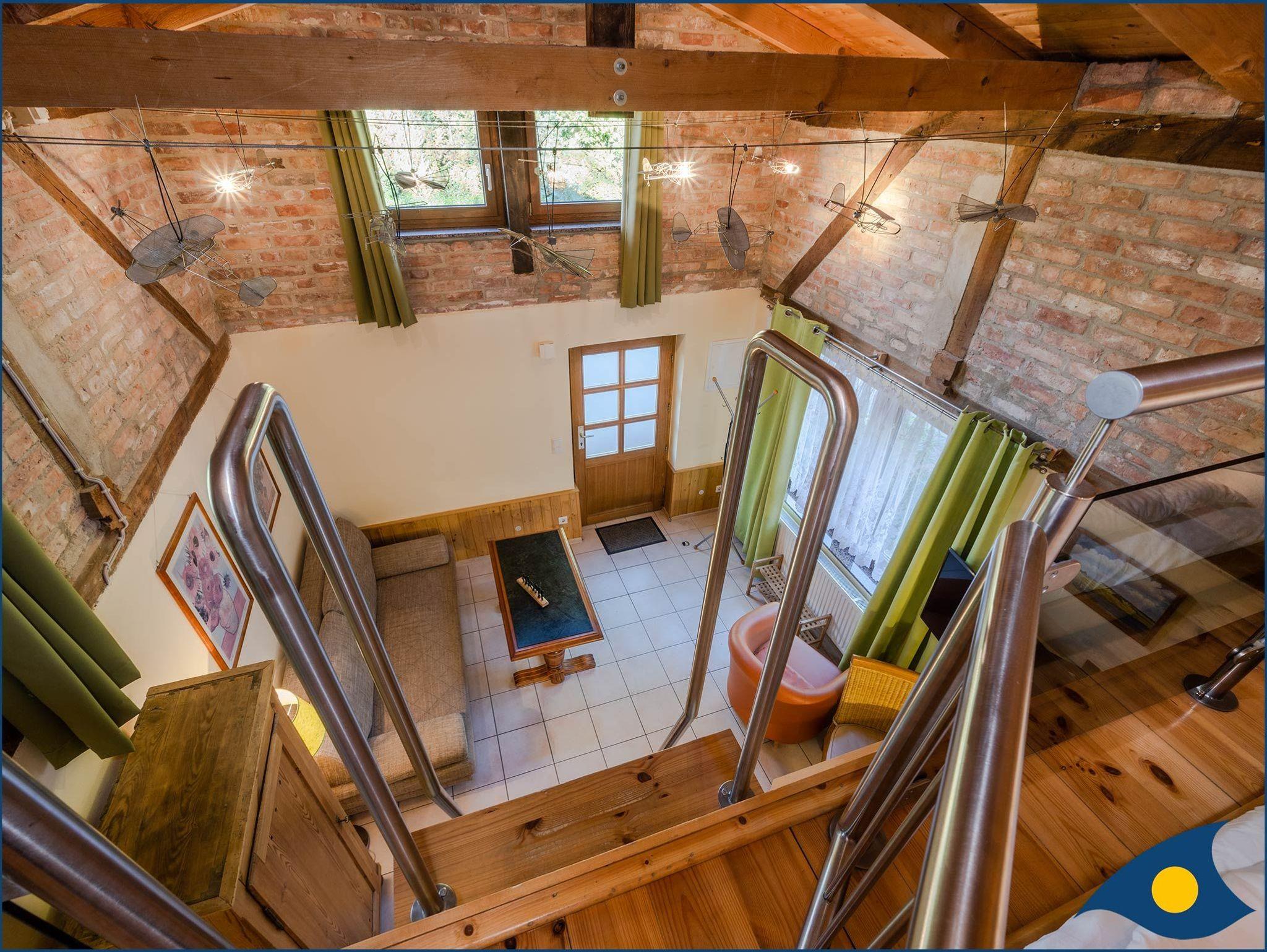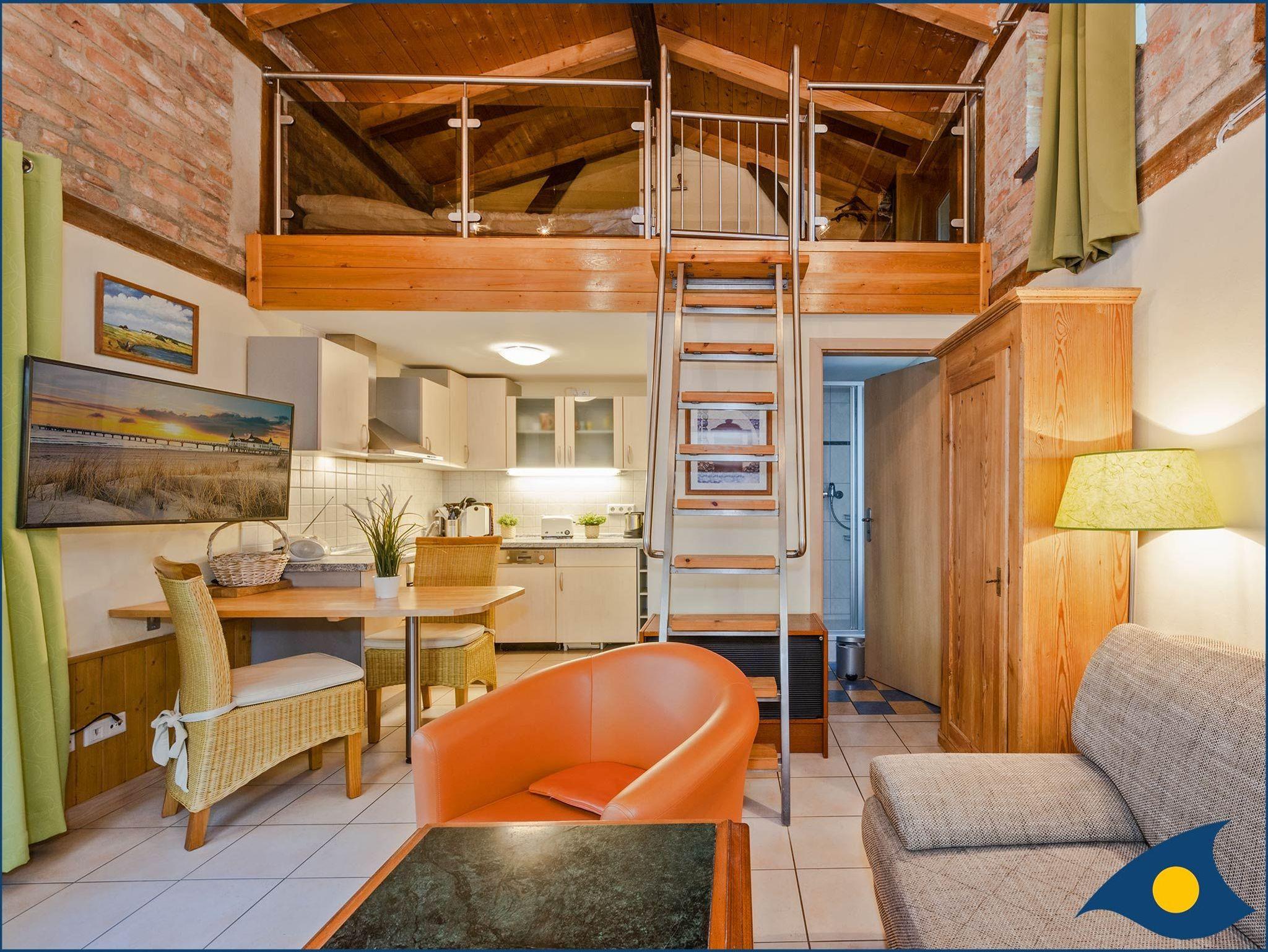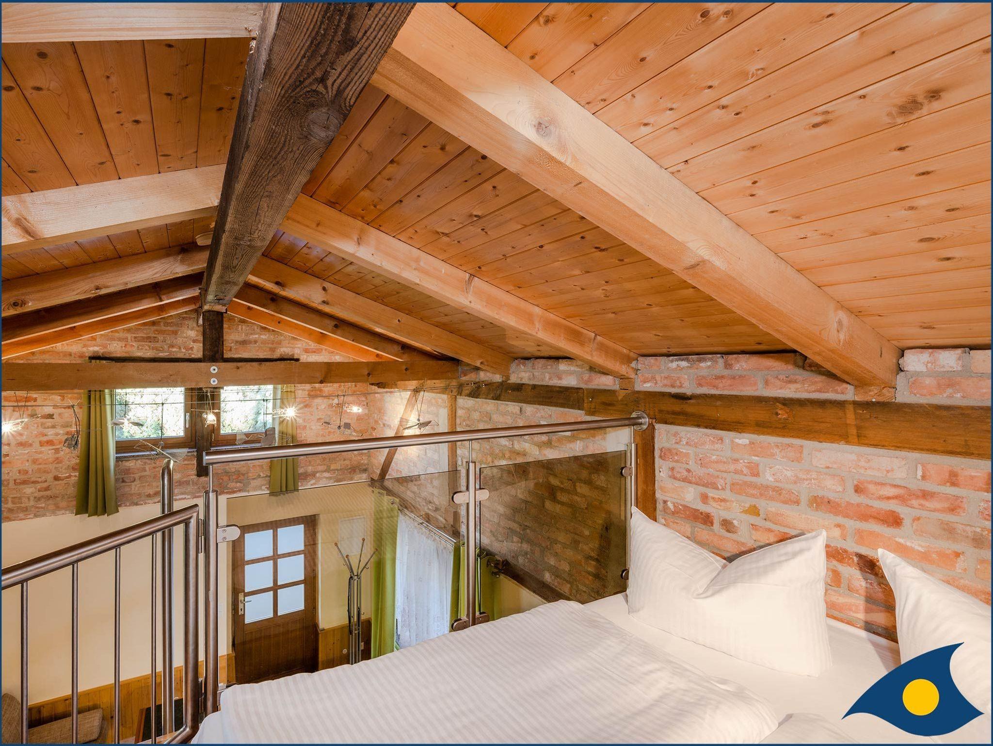 Die Wohnung 8 befindet in der ehemaligen ca. 28m² großen Remise der restaurierten Villa „Ernst“. Die Wohnung 8 besteht, bis auf ein separates Bad, aus einem einzigen Raum. Sie nimmt die gesamte Höhe, Breite und Länge der Remise ein. Die Deckenbalken liegen frei und die schönen Ziegelwände sind aufwändig rekonstruiert worden. Die Wohnung 8 verfügt über eine eingezogene Galerie mit einem Stahl-Glasgeländer auf der ein Doppelbett steht (1,40 m breit). Sie ist über eine solide holzbelegte Edelstahlleiter mit Handlauf erreichbar. Die Remise besitzt einen gemütlichen Charme und ist bei Paaren und Kindern wegen der Schlafgalerie sehr beliebt. Zu ebener Erde im Wohn-Schlafbereich befindet sich eine bequeme Schlafcouch. Die Wohnung 8 ist für 2 Personen ausgelegt. Die Wohnung 8 ist für körperbehinderte Personen nicht geeignet.