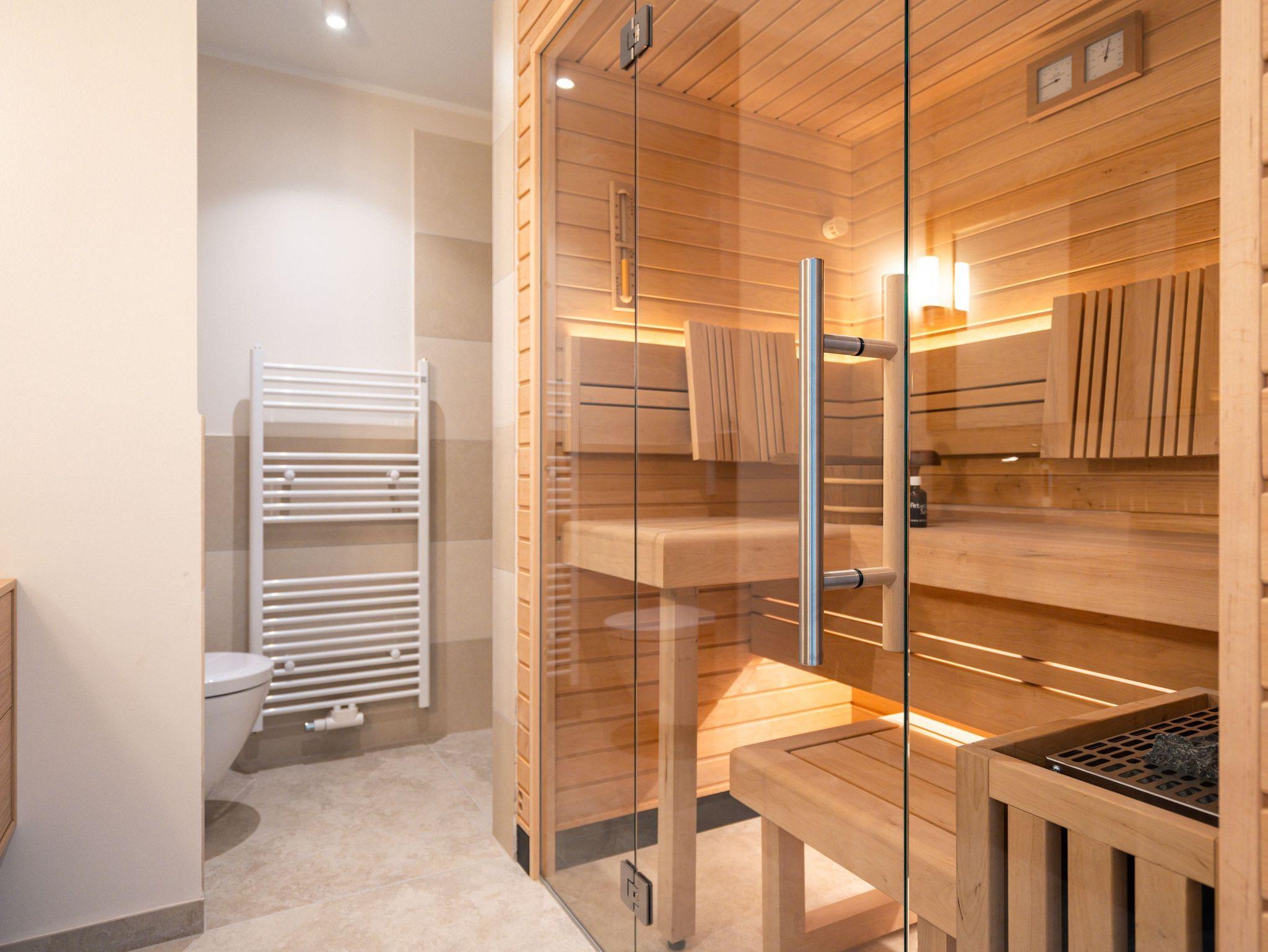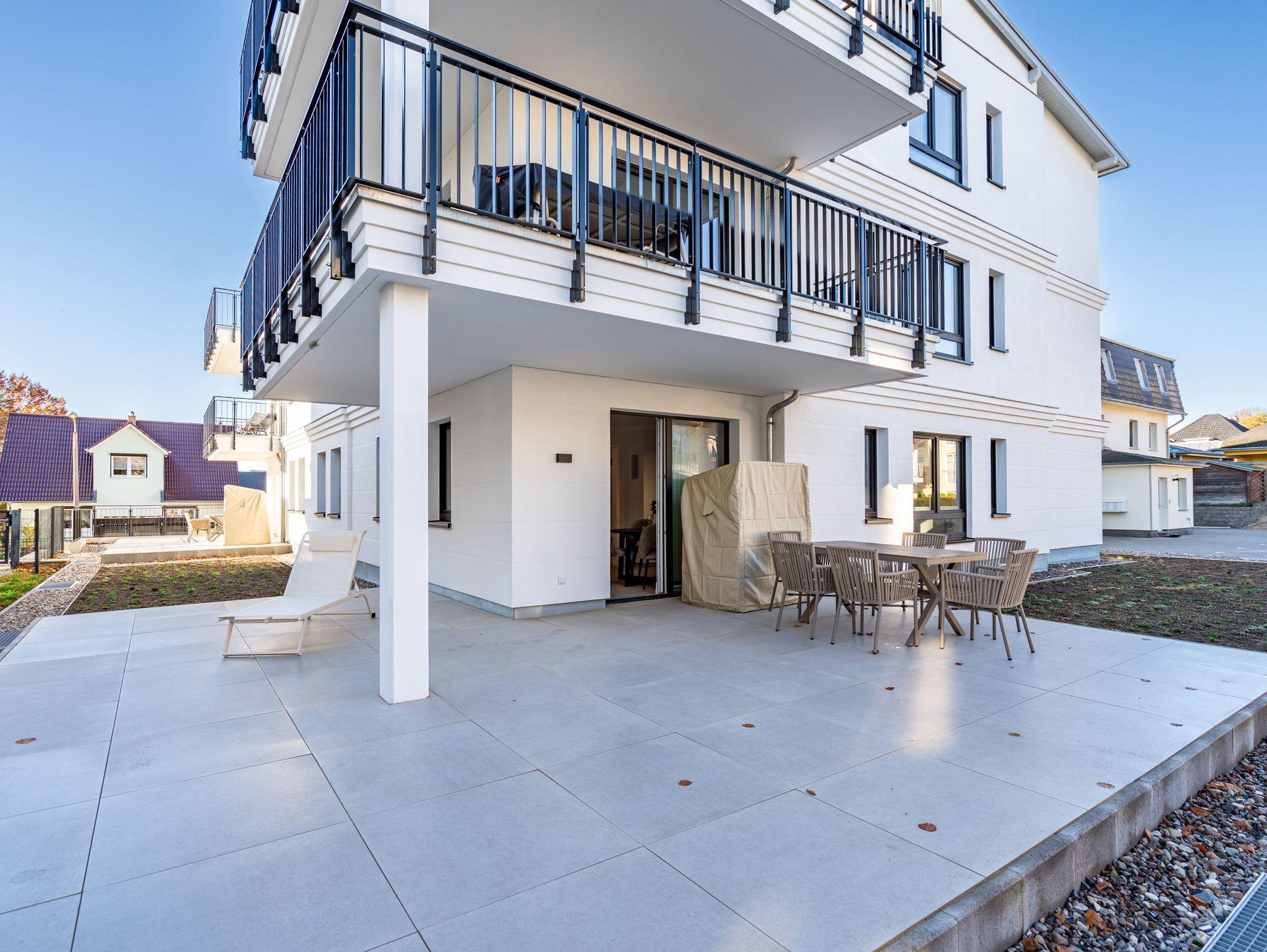 Die Wohnung bietet auf 67 Quadratmetern einen klar strukturierten Grundriss und eine angenehme Atmosphäre. Der Wohnbereich ist offen gestaltet, hell und aufgeräumt. Die Sitzgruppe, der Kamin mit Fernbedienung und der Fernseher schaffen einen Bereich, in dem man sich ohne viel Aufwand wohlfühlt. Die Küche ist vollständig ausgestattet und eignet sich auch für längere Aufenthalte. Backofen, Induktionsfeld, Mikrowelle, Spülmaschine und ein Kühlschrank mit Gefrierfach sind vorhanden. Der Essplatz schließt direkt an. Von hier aus geht es auf die große Terrasse nach Südost. Fünfzig Quadratmeter bieten genug Fläche für ein ruhiges Frühstück, ein Buch oder ein Glas Wein am Nachmittag. Gartenmöbel stehen bereit. Beide Schlafzimmer sind mit Boxspringbetten (1,80 m x 2,00 m) eingerichtet. Dazu gibt es jeweils einen Kleiderschrank und einen Fernseher. Die beiden Bäder sind modern gehalten und jeweils mit Dusche, Waschtisch und WC ausgestattet. In einem der Bäder befindet sich eine finnische Sauna für zwei Personen, die an kühleren Tagen eine echte Wohlfühloase ist. Ein Stellplatz in der Tiefgarage (Durchfahrthöhe 1,85m) gehört zur Wohnung. WLAN steht ohne Zusatzkosten zur Verfügung.