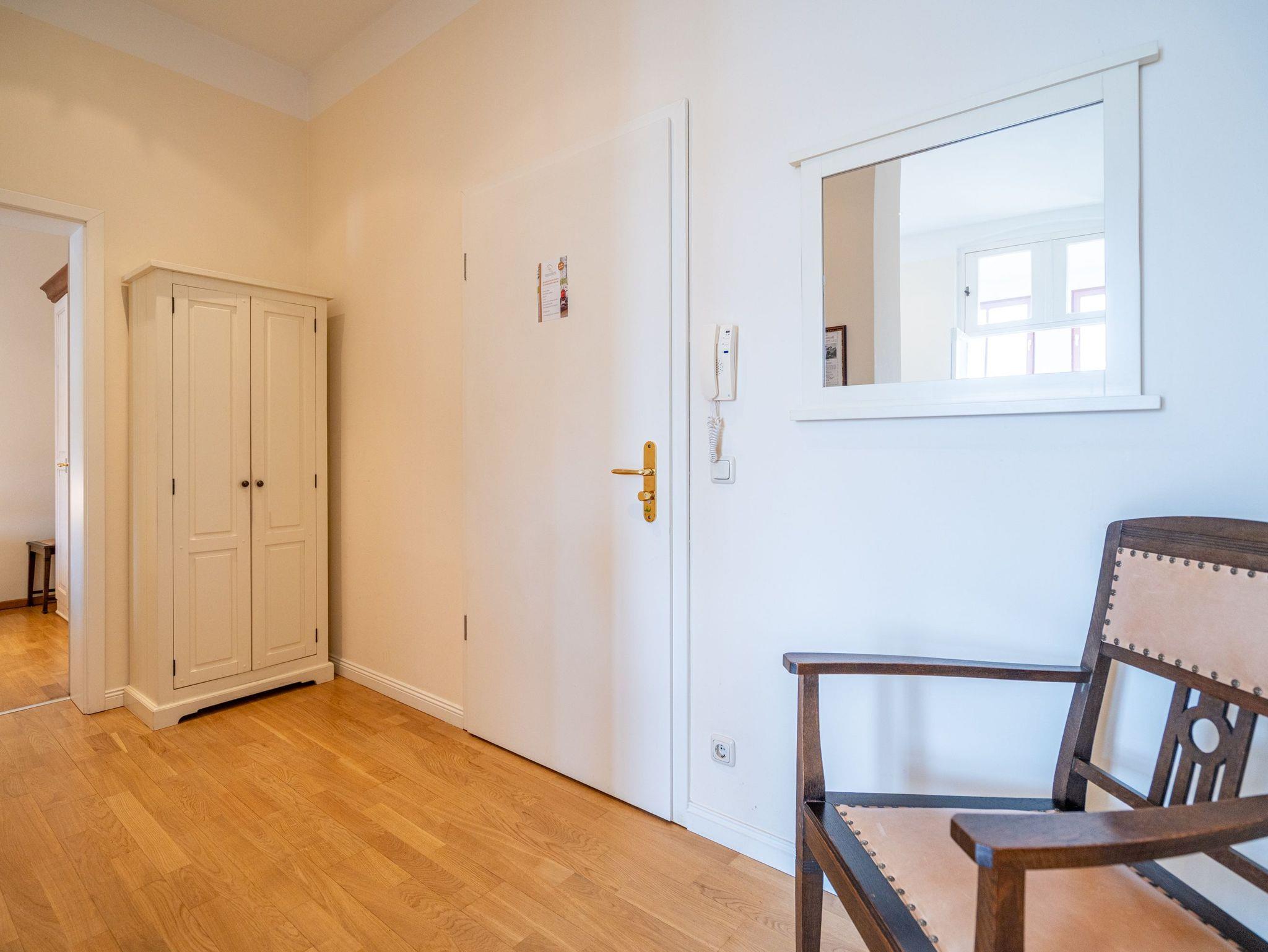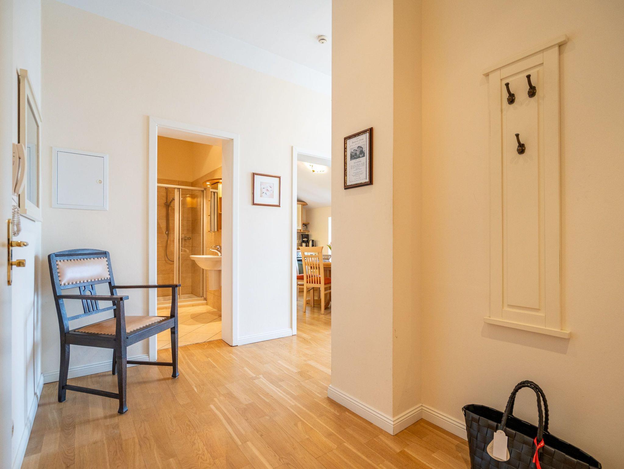 In der 2-Raum-Ferienwohnung Lasker-Schüler im Autorenhaus überzeugt nicht nur der schöne Meerblick. Angenehme Urlaubstage verspricht auch die geschmackvolle Einrichtung der Wohnung, die sich im 2. Obergeschoss der Villa befindet. Vom kleinen Wohnbereich mit Kaminofen hat man Zugang zur verglasten Loggia. Hier lässt es sich besonders schön relaxen und wer genießt dabei nicht gerne den Blick auf die Ostsee? Die separate Küche ist komplett ausgestattet und wird durch den Essplatz vervollständigt. Ein Schlafzimmer mit Doppelbett für 2 Erwachsene bietet auch für ein Kleinkind im Kinderreisebett Platz. Ein Kind (bis 15 Jahre) kann im Wohnbereich die Schlafcouch nutzen. Ergänzt wird die Wohnung durch ein modernes Bad mit Dusche. Im Keller des Hauses stehen eine Waschmaschine und ein Trockner gegen Gebühr zur Verfügung. Das WLAN-Netz ist kostenfrei nutzbar.