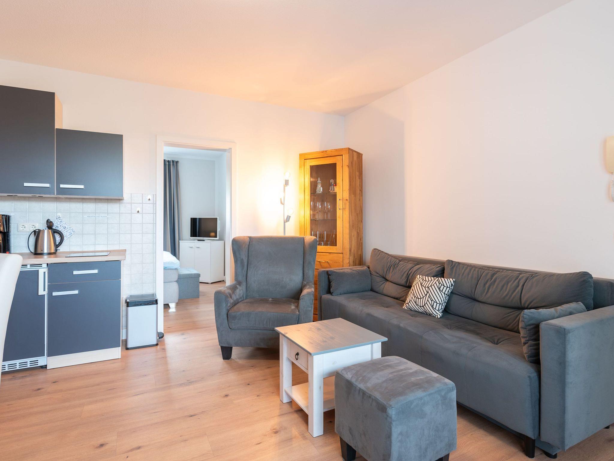 Die FEWO 1 befindet sich im Erdgeschoß unseres Hauses. Unsere komfortabele 2-Raum-Fewo ist eine Nichtraucherwohnung. Die Küche ist zum Wohnraum hin offen und mit einer kleinen Küchenzeile ausgestattet. Hier finden Sie einen Kühlschrank, eine Kaffeemaschine, einen Wasserkocher und Geschirr/Besteck. Alles was Sie für einen erholsamen Urlaub benötigen. Die Fewo ist für max. 3 Personen geeignet. Die Schlafmöglichkeiten verteilen sich wie folgt. Es gibt ein Schlafzimmer mit einem Doppelbett, die Couch im Wohnzimmer kann zu einem Bett umfunktioniert werden.