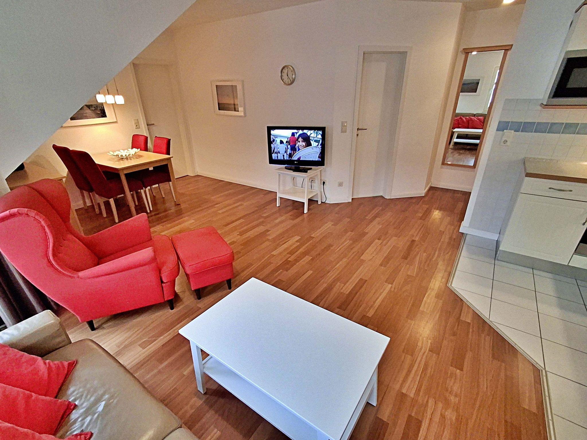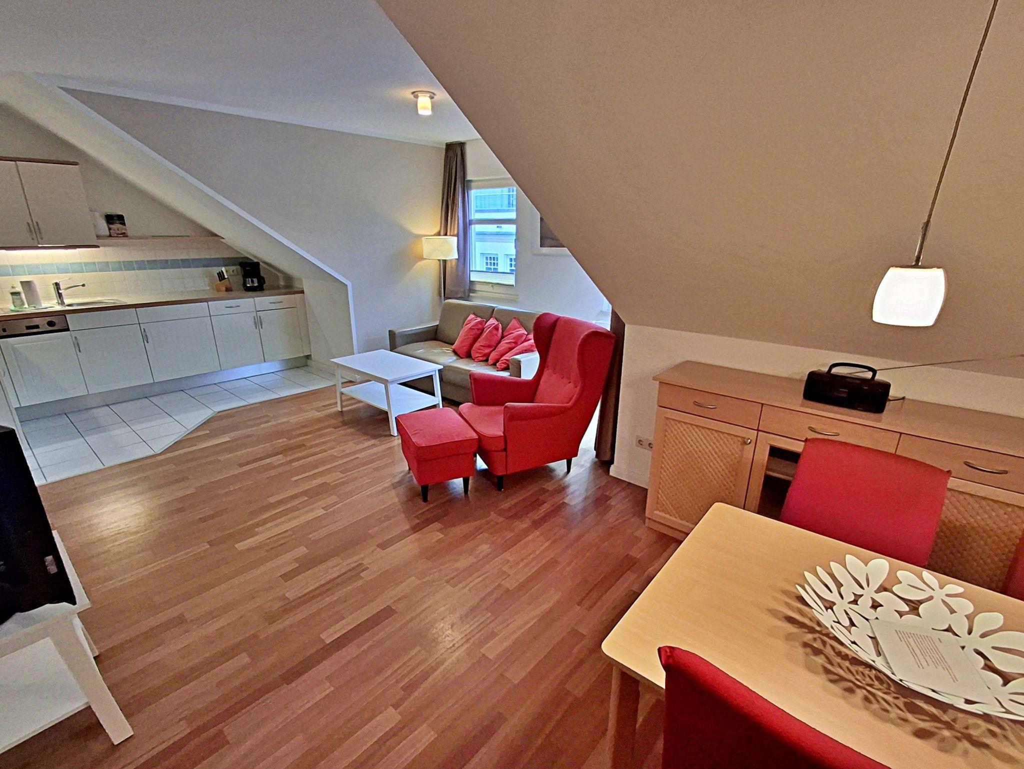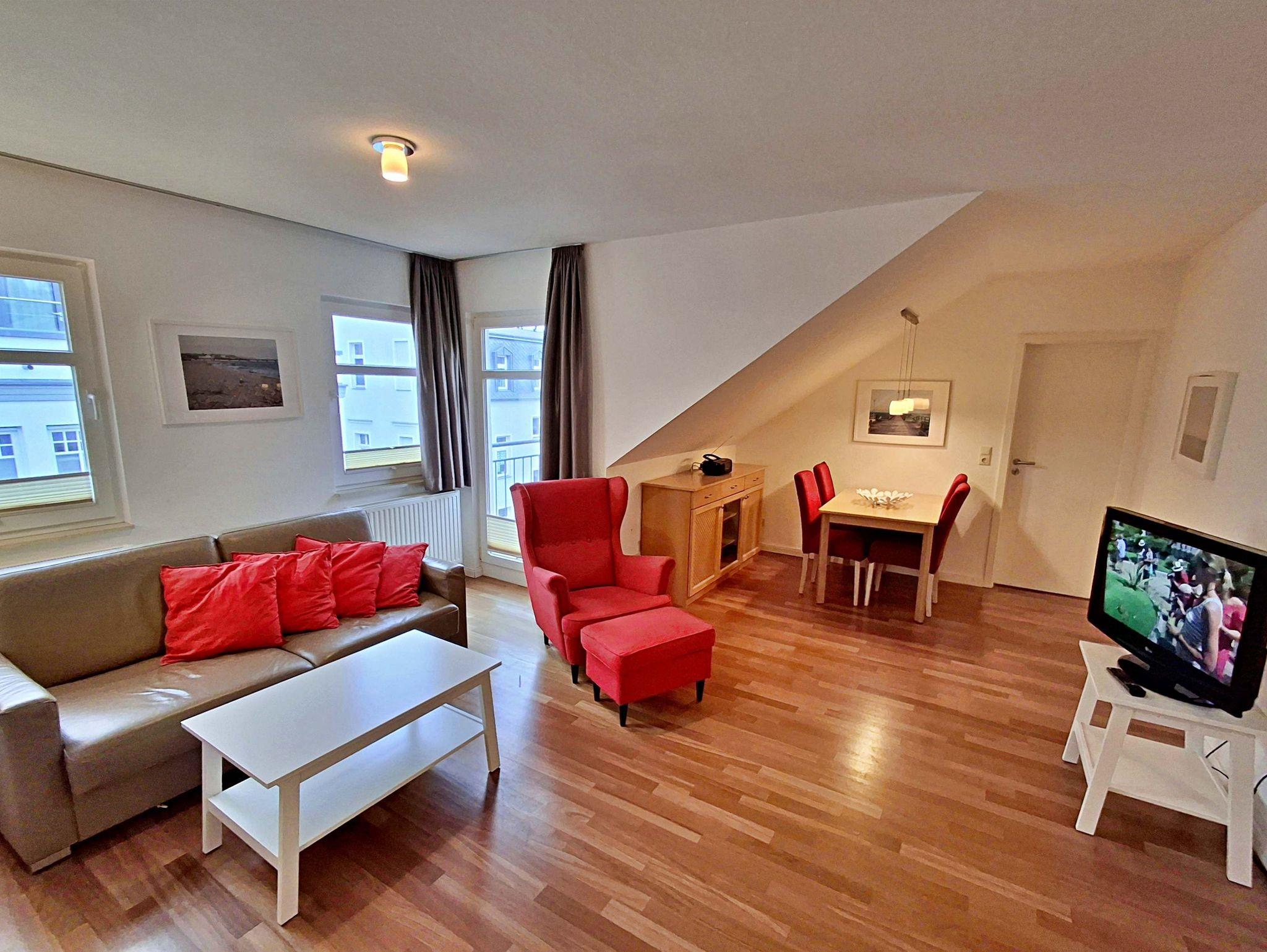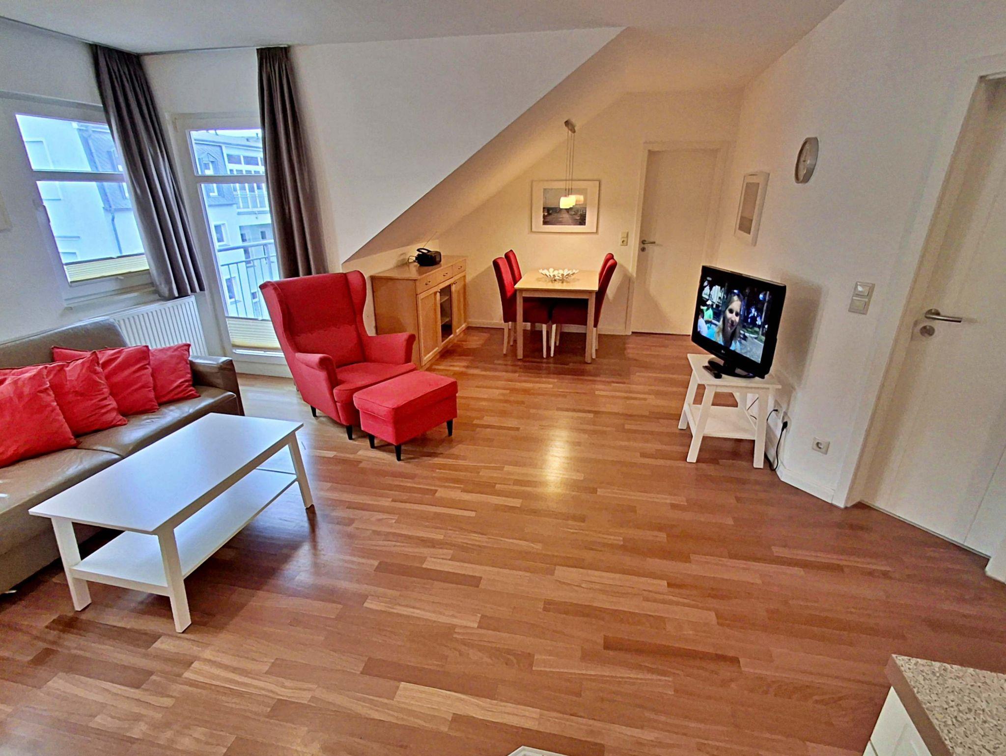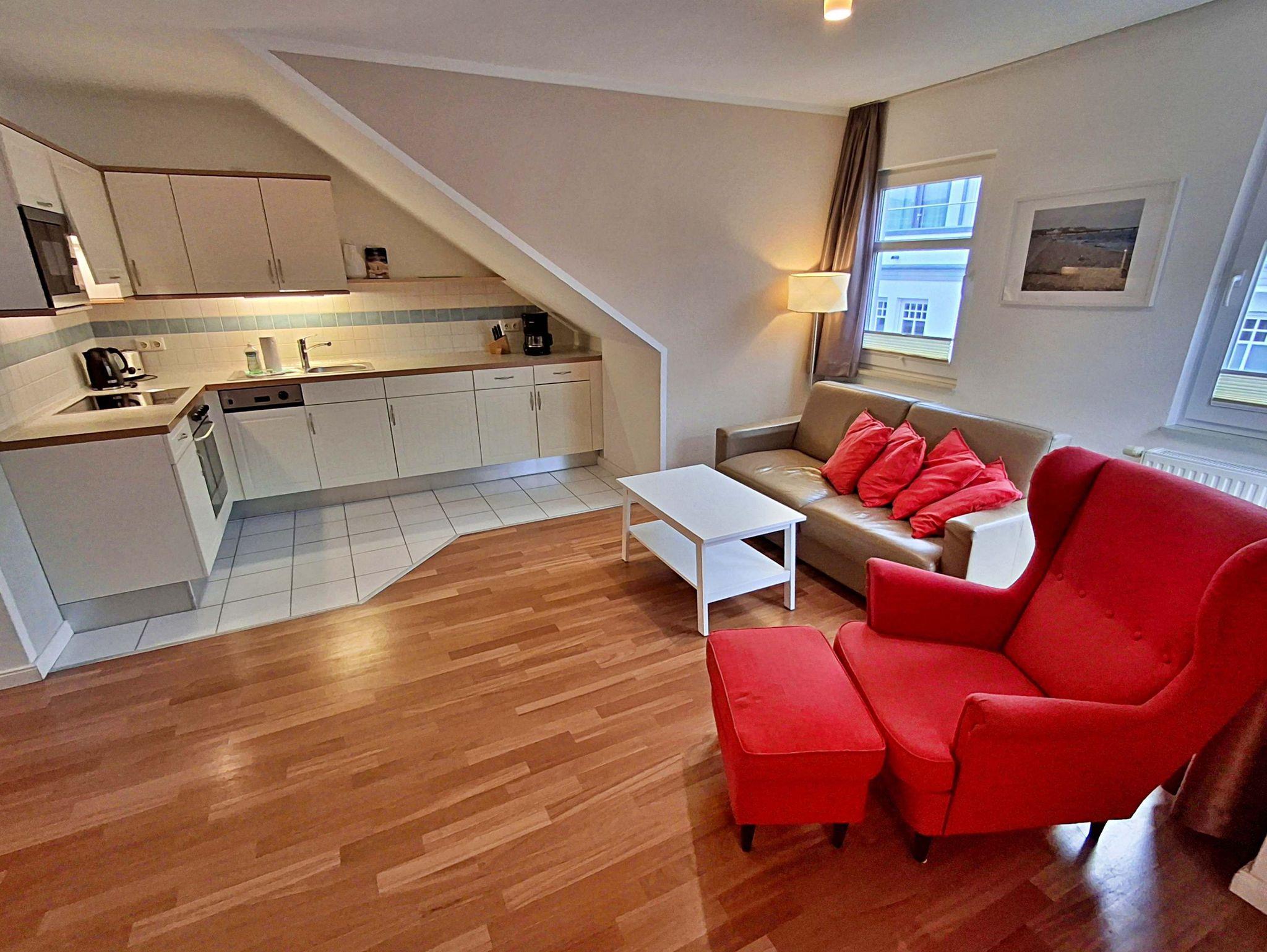 Die helle 2-Zimmer-Wohnung Rotschenkel im 3. Obergeschoss mit Balkon für max. 3 Erwachsene und 1 Kind bis 14 Jahre befindet im Nebengebäude der stilvoll restaurierten Villa Ahlbeck - nur wenige Schritte von der Promenade und dem Strand entfernt. Im Wohnbereich befinden sich neben der Couch auch ein Sessel mit passendem Fußhocker sowie ein Esstisch mit 4 Stühlen, der genügend Platz für 4 Personen bietet. Das Highlight der Wohnung ist der Balkon in Nord-Ost-Ausrichtung, wo Sie bei schönem Wetter bereits morgens Ihren Kaffee genießen oder den Abend bei einem Glas Wein ausklingen lassen können. Die moderne Küchenzeile mit Ceranherd, Backofen, Geschirrspüler, Mikrowelle, Kaffeemaschine, Wasserkocher und Toaster lässt keine Wünsche offen. Für die Unterhaltung sorgen ein Flachbild-TV, Radio-CD-Player und kostenfreies W-LAN. Das Schlafzimmer verfügt über ein Doppelbett und das Badezimmer hat DU/WC. Vom Schlafzimmer aus können Sie auch einen Blick auf die Ostsee erhaschen.