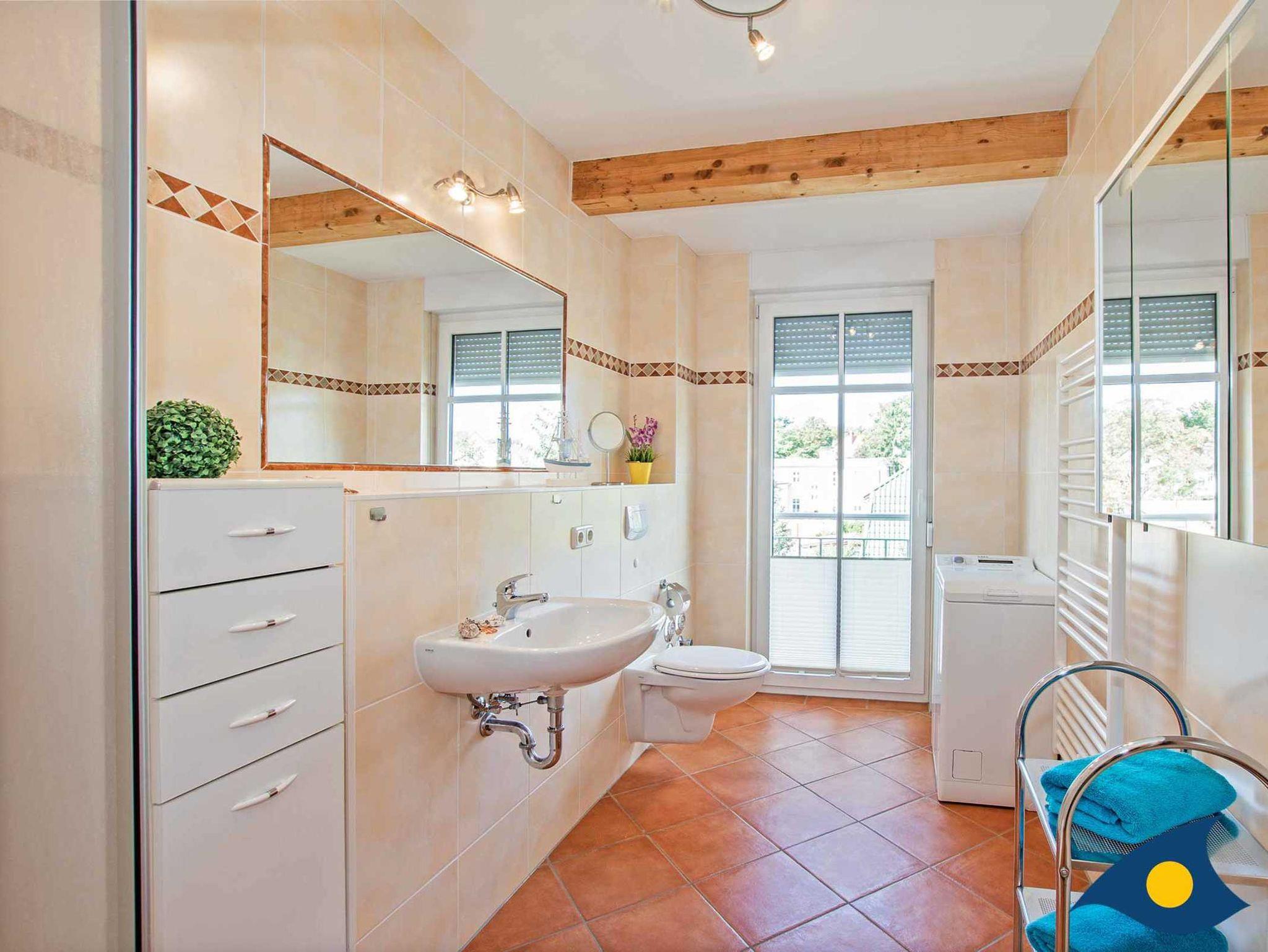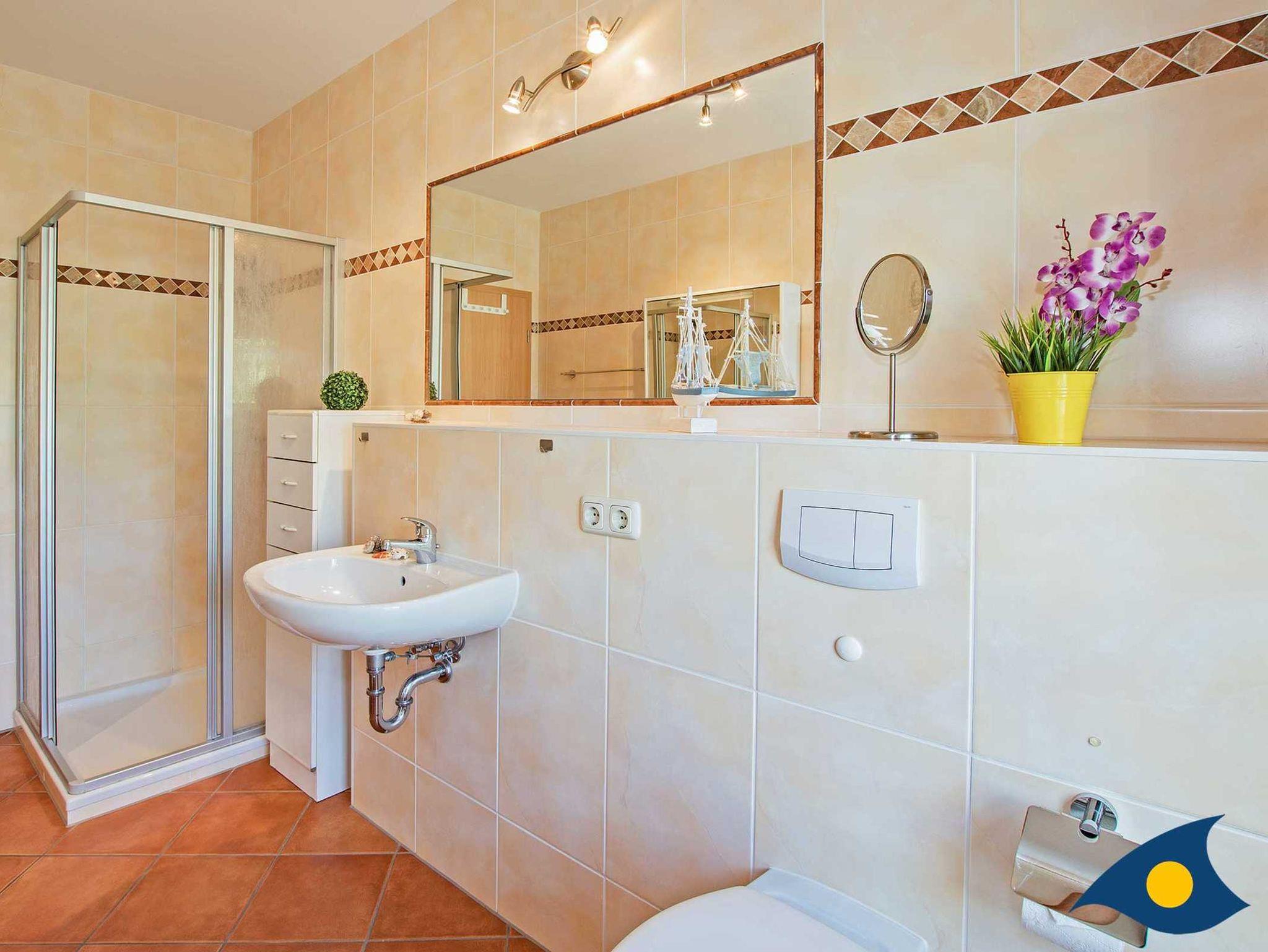 Das geräumige Bad mit Dusche bietet ausreichend Raum, um gemeinsam gut in den erlebnisreichen Tag zu starten.
