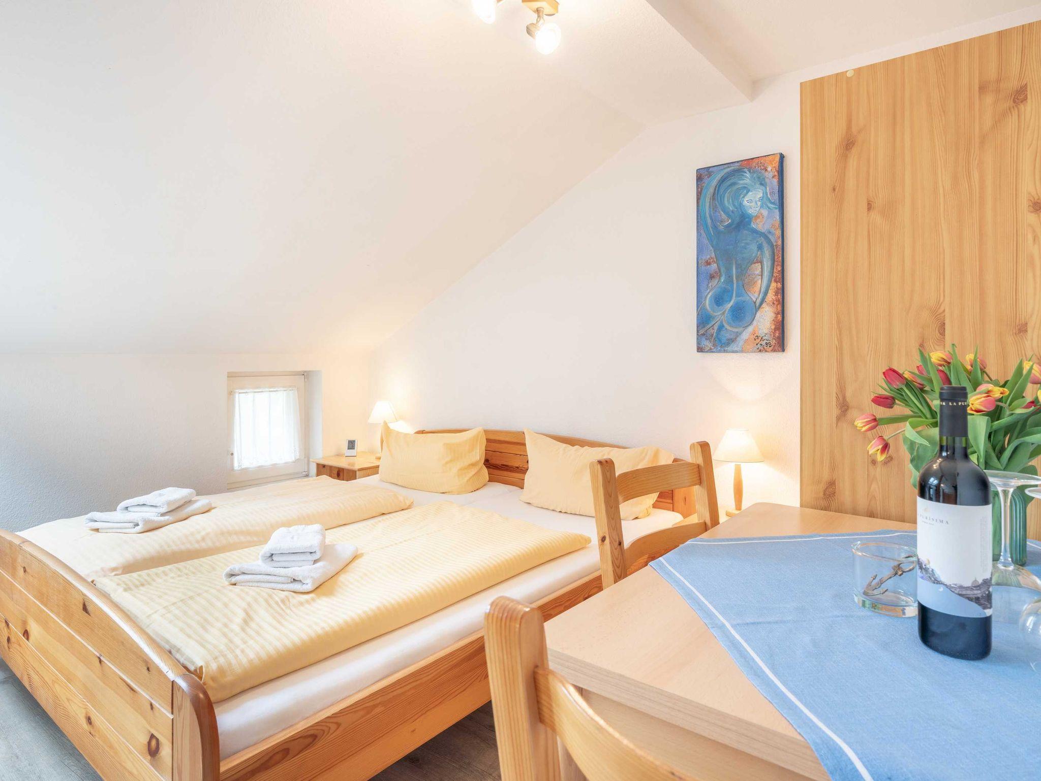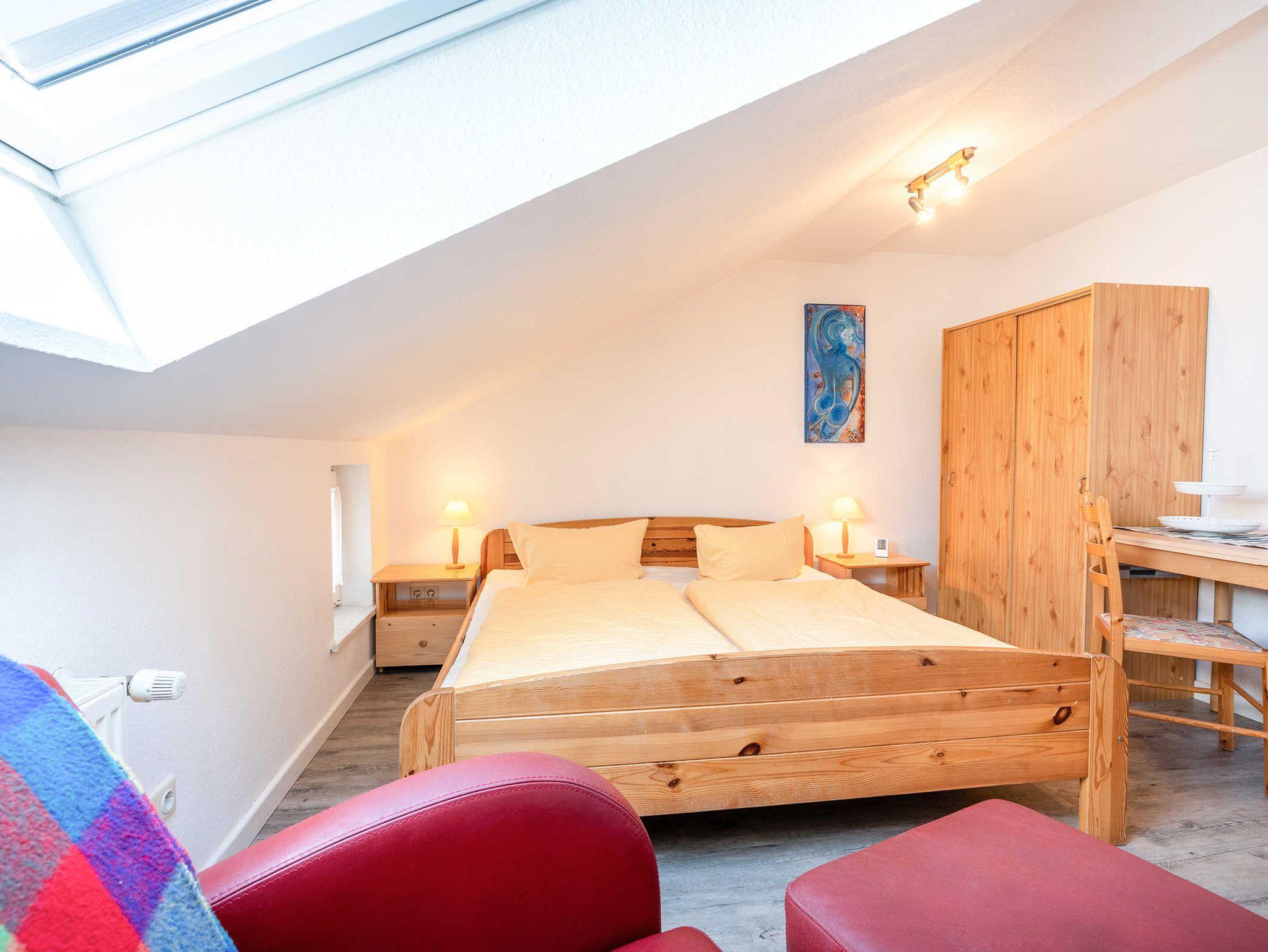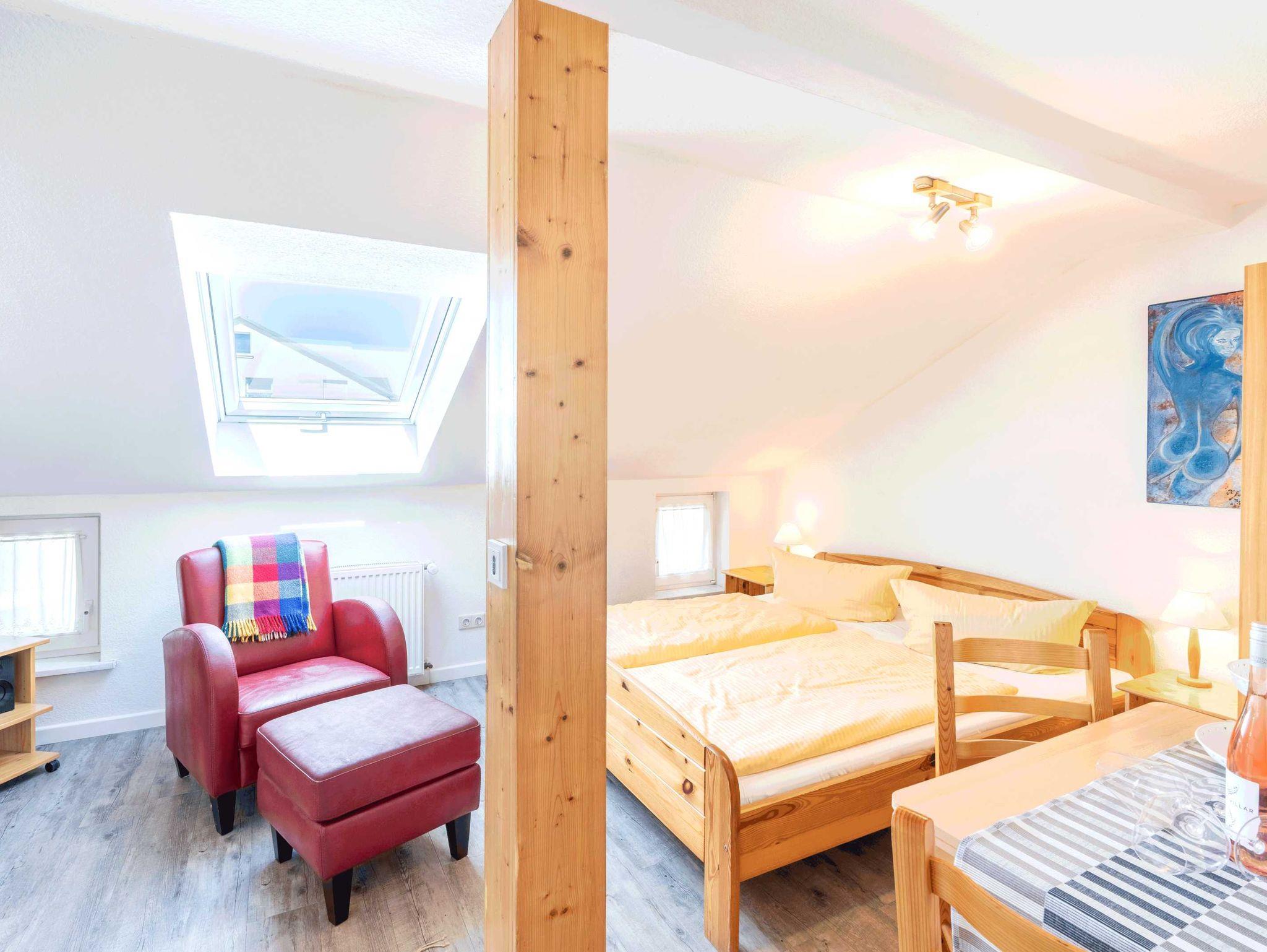 Die 17 qm große Ferienwohnung 2 für maximal 2 Personen befindet sich im Dachgeschoss auf der Südwestseite. Das kombinierte Wohn-, Schlaf- und Esszimmer mit Kochnische verfügt über ein 180 cm breites Doppelbett; durch das großzügige Dachfenster fällt tagsüber viel Licht herein. Die Pantryküche ist funktional ausgestattet. Das kuschelige Apartment bietet sich an als praktischer Ausgangspunkt für lange Strandtage, Ausflüge oder Aktivitäten auf der Insel. Ideal ist die Ferienwohnung für zwei Personen, Alleinreisende oder Alleinerziehende mit Kind.
