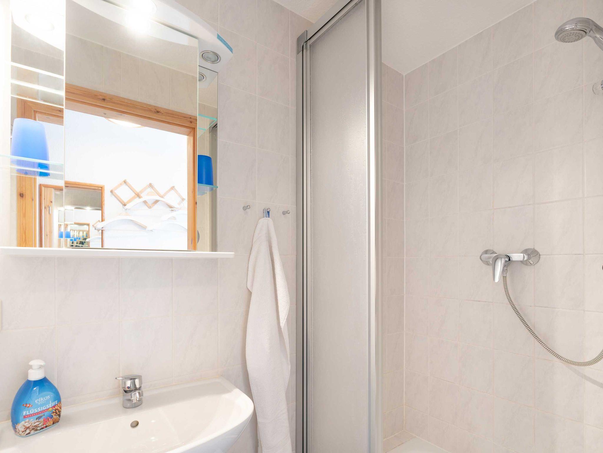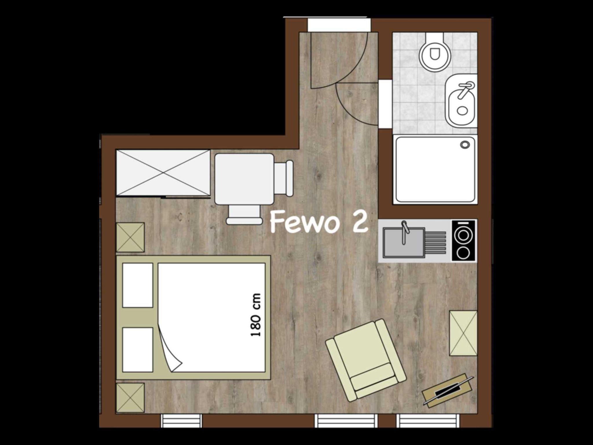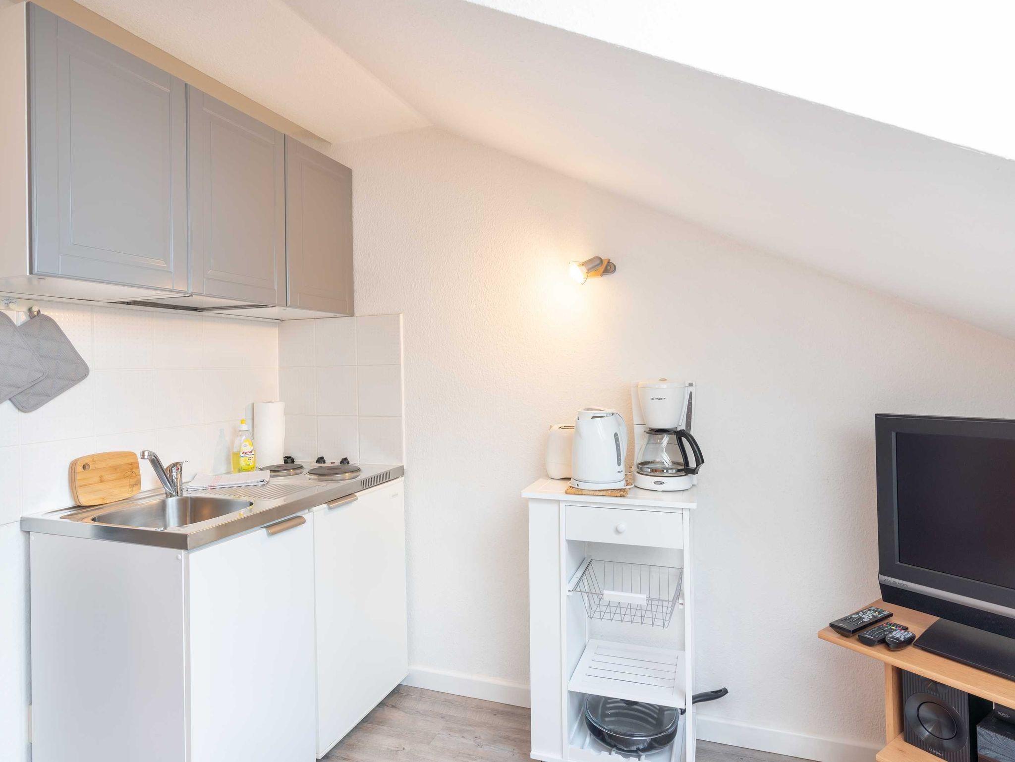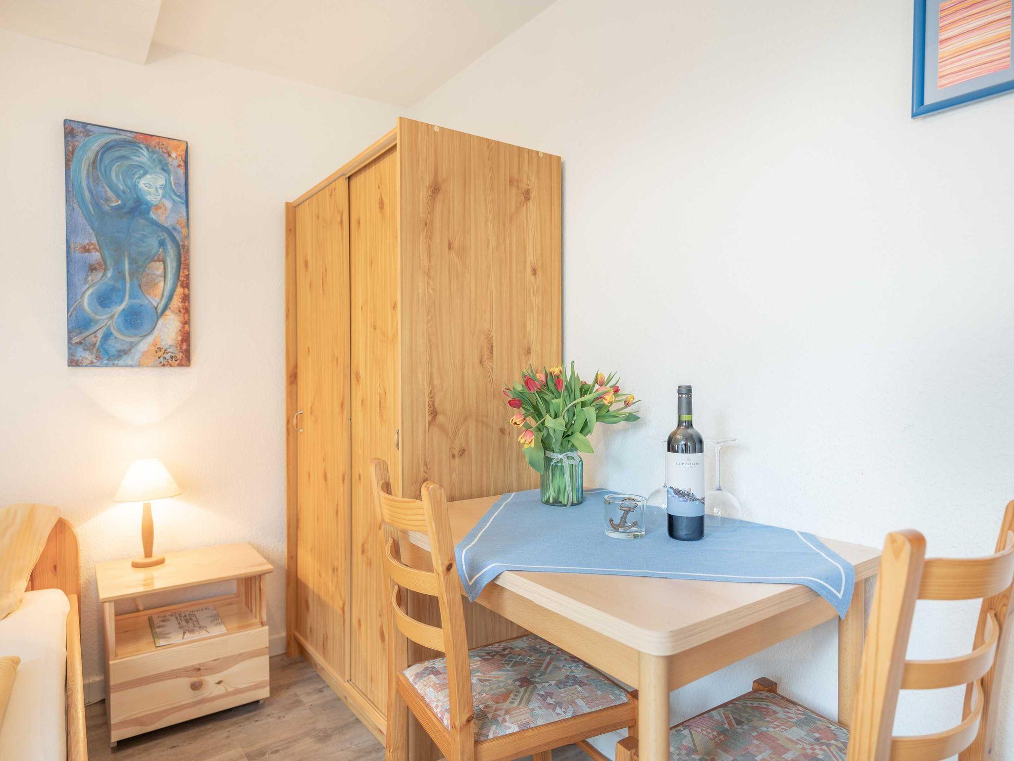Die 17 qm große Ferienwohnung 2 für maximal 2 Personen befindet sich im Dachgeschoss auf der Südwestseite. Das kombinierte Wohn-, Schlaf- und Esszimmer mit Kochnische verfügt über ein 180 cm breites Doppelbett; durch das großzügige Dachfenster fällt tagsüber viel Licht herein. Die Pantryküche ist funktional ausgestattet. Das kuschelige Apartment bietet sich an als praktischer Ausgangspunkt für lange Strandtage, Ausflüge oder Aktivitäten auf der Insel. Ideal ist die Ferienwohnung für zwei Personen, Alleinreisende oder Alleinerziehende mit Kind.