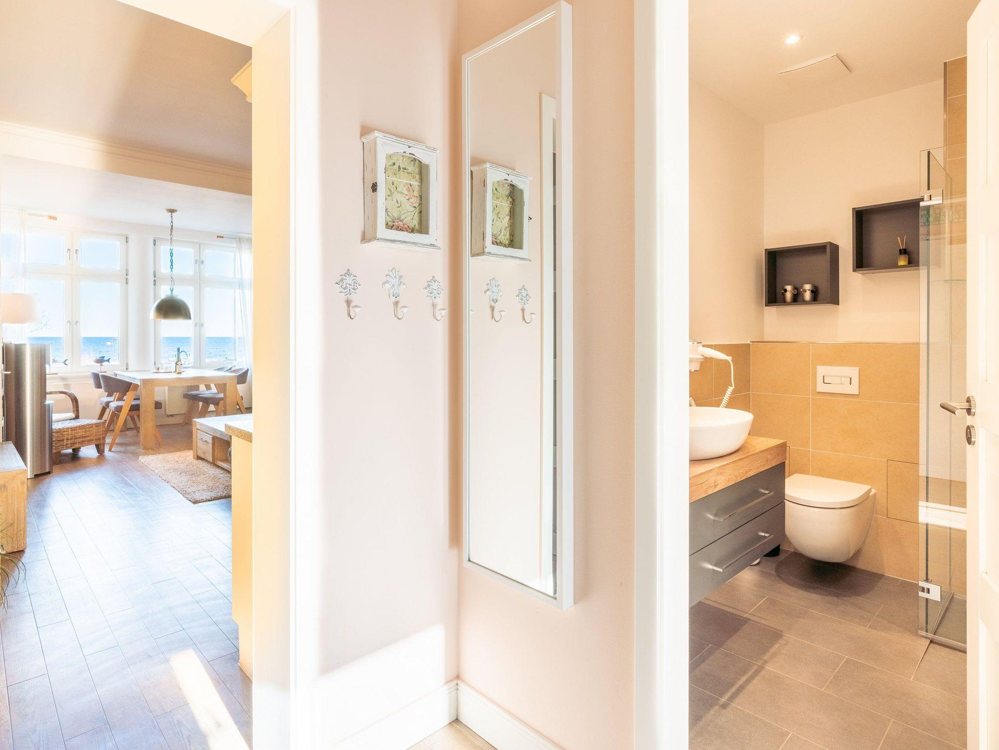 Damit Sie Ihre wohlverdiente Urlaubszeit bereits am Anreisetag in vollen Zügen genießen können, haben wir das Bett für Sie und das für Ihre lieben Mitreisenden bereits bezogen und ein Duschtuch sowie ein kleines Handtuch bereitgelegt. Das moderne Bad mit Echtglas-Dusche und ebenerdiger Duschtasse, WC und Haartrockner ergänzt die Wohnung perfekt.