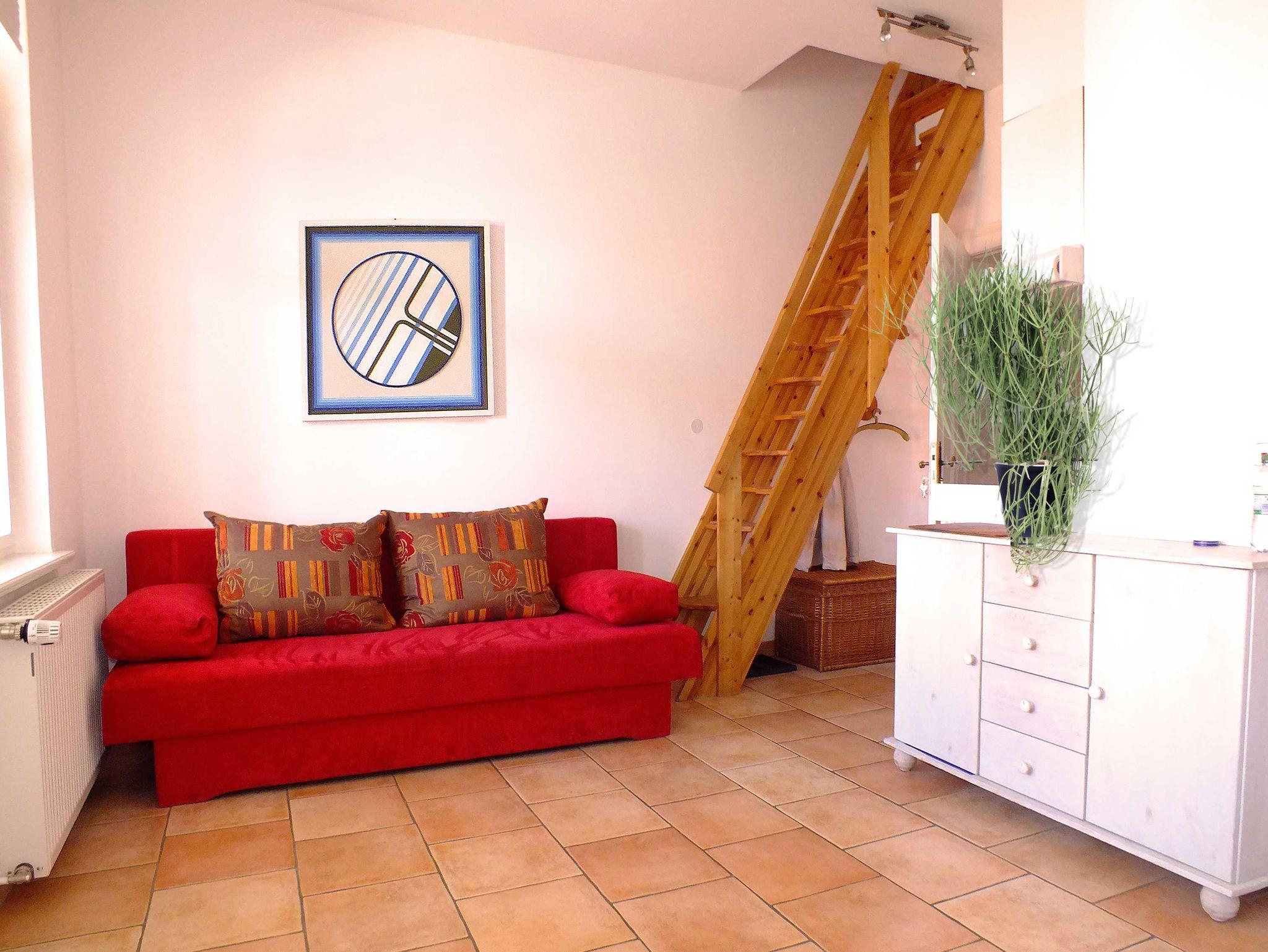Das freundliche 25 qm große vollständig geflieste Appartement im 1. OG ist mit einem kombinierten Wohn- und Schlafraum mit Esstisch und Stühlen, Kleiderschrank, einem qualitativem Bali-Sofa-Bett mit einer Liegefläche von 1,60 x 2,00 m, einer Küchenzeile mit 2-Platten-Herd, Minibackofen, Spüle, Kühlschrank, Kaffeemaschine, Toaster, Geschirr etc., TV sowie einer Veranda mit einem Einzelbett 0,80 m x 1,90 m ausgestattet. Das Bad verfügt über DU/WC. Vom kombinierten Wohn- und Schlafraum gelangt man über eine Leiter zum Schlafboden, welcher über zwei Einzelbetten á 0,90 x 2,00 m verfügt. Der Schlafboden ist mit einer Raumhöhe von ca. 1 m nur bedingt für Erwachsene geeignet.