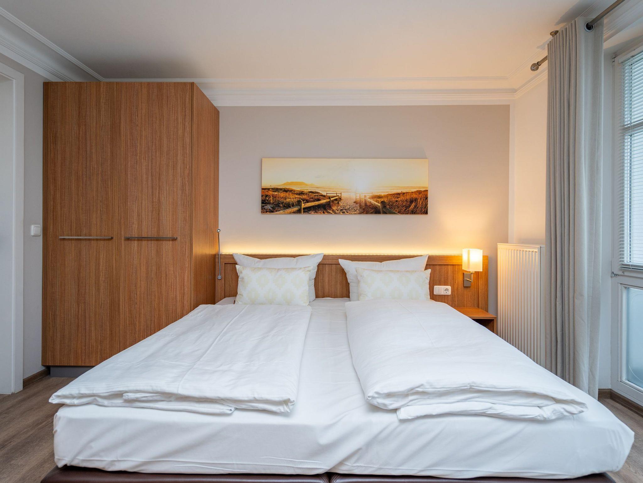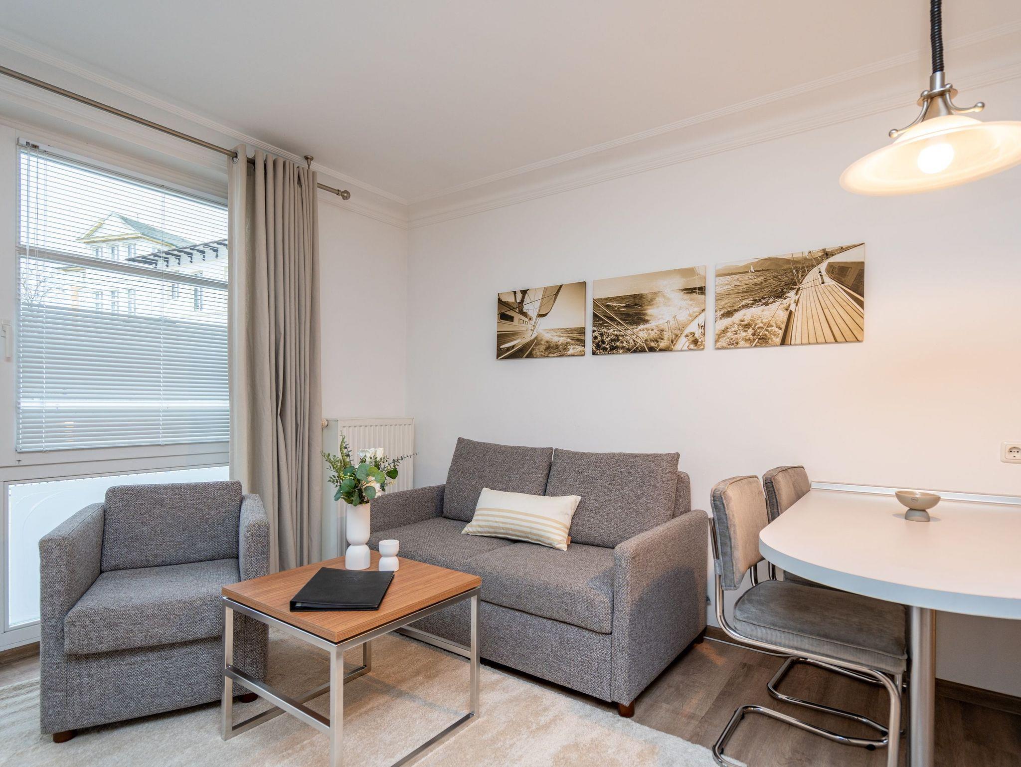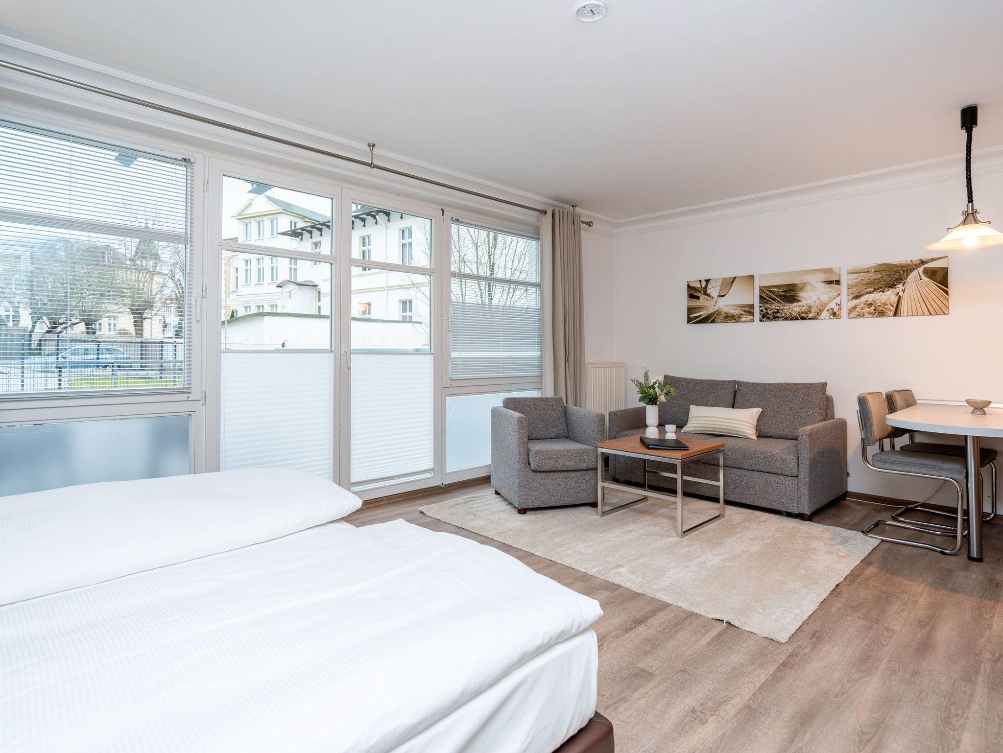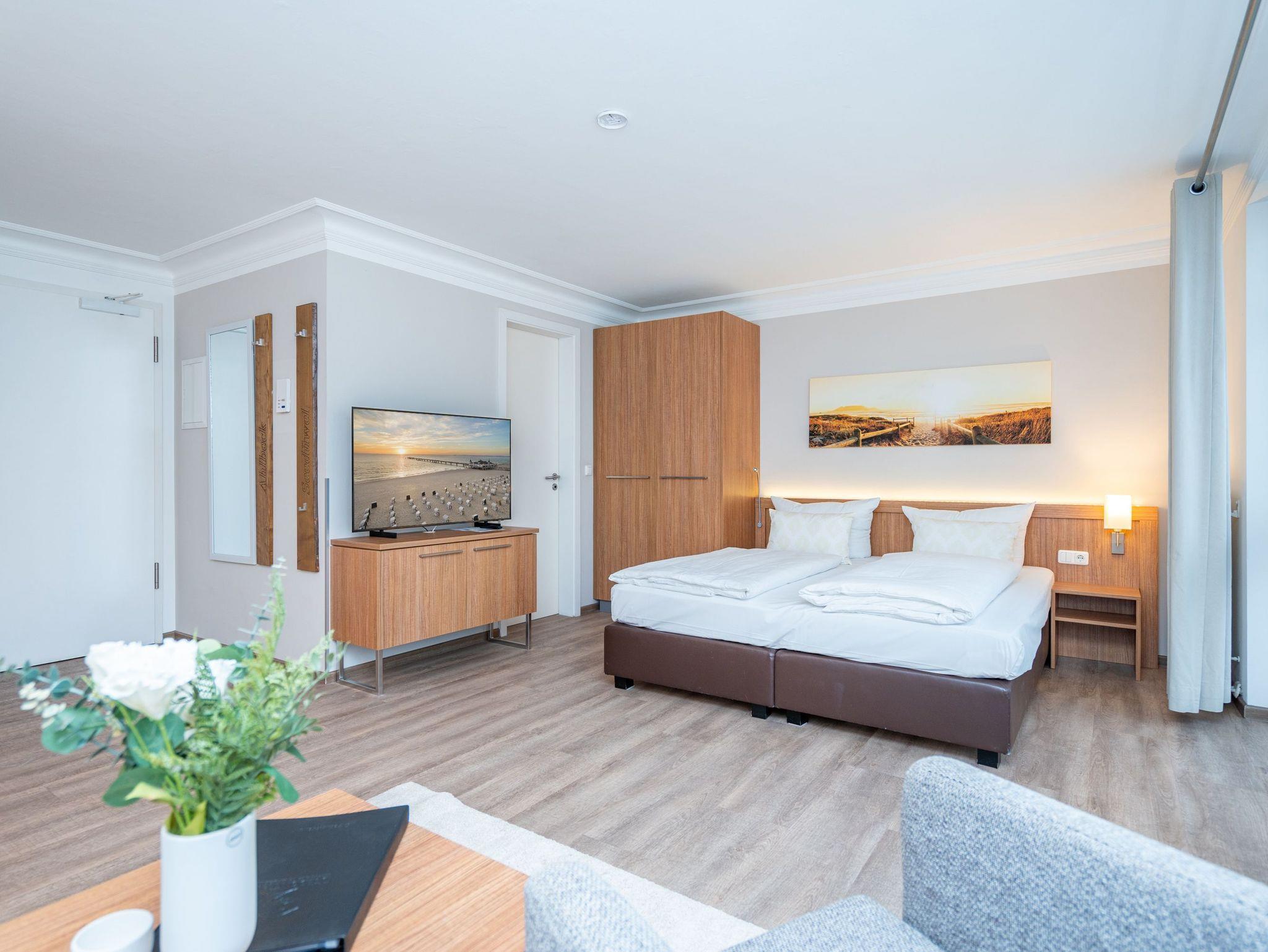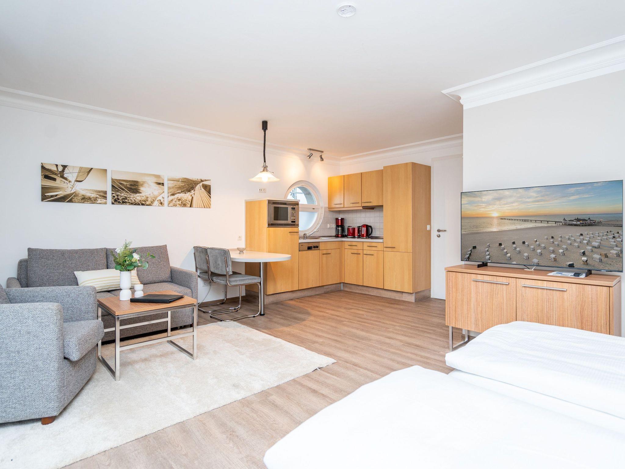 Die 1-Raum-Ferienwohnung Nr. C02 in der Villa Seedüwel bietet auf 44 qm komfortablen Platz für zwei Personen und befindet sich im Erdgeschoss. Der offene Wohnbereich ist mit einer Küchenzeile ausgestattet, die ein 2-Platten-Cerankochfeld, eine Mikrowelle und einen Kühlschrank mit Gefrierfach umfasst. Ein Essplatz für zwei Personen, eine gemütliche Sitzgruppe und ein Flat-TV sorgen für Komfort. Das Doppelbett (1,80 m x 2,00 m) befindet sich ebenfalls im Wohnbereich und wird durch eine Kommode sowie einen Kleiderschrank ergänzt. Von hier aus gelangen Sie auf die großzügige und sonnige Süd-West-Terrasse (44qm). Das innenliegende Bad verfügt über eine Dusche, ein Waschbecken und ein WC. Ein Stellplatz in der Tiefgarage ( Einfahrthöhe 2,03m) des benachbarten Hauses „Strandterrasse“ ist für Sie reserviert. WLAN steht Ihnen kostenfrei zur Verfügung.