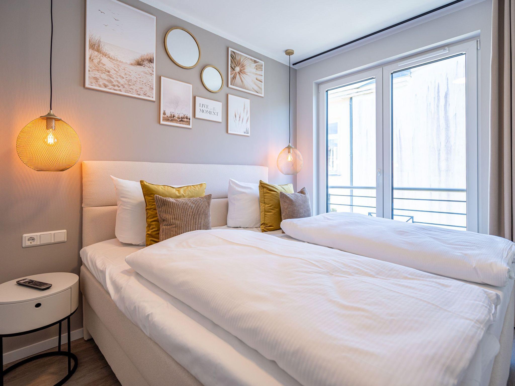 Willkommen in diesem stilvollen 3-Raum-Appartement Nr. 06 im exklusiven Quartier 6, das Ihnen auf großzügigen 70 Quadratmetern alles bietet, was Sie für einen unvergesslichen Urlaub benötigen. Das Appartement in der 1. Etage bietet Platz für bis zu 4 Personen und ein Kleinkind im Kinderreisebett. Der helle, offene Wohnbereich lädt mit einer gemütlichen Sitzgruppe, einem Flat-TV und einem per Fernbedienung gesteuerten Gas-Kamin zu entspannten Abenden ein. Die voll ausgestattete Küchenzeile lässt mit modernem Induktionskochfeld, Kühlschrank, Gefrierschrank und einem Esstisch für 4 Personen keine Wünsche offen. Von hier aus gelangen Sie auf den sonnigen Süd-West-Balkon, der mit bequemer Gartenbestuhlung zum Verweilen einlädt. Die zwei komfortablen Schlafzimmer sind jeweils mit Boxspringdoppelbetten (1,80m x 2,00m), einem Kleiderschrank und einem weiteren Flat-TV ausgestattet ? ideal für erholsame Nächte. Die zwei eleganten Duschbäder bieten Ihnen modernen Komfort, das Hauptbad verwöhnt Sie zusätzlich mit einer finnischen Sauna, in der Sie nach einem erlebnisreichen Tag wunderbar entspannen können. Ein Hauswirtschaftsraum mit Waschmaschine, kostenfreies WLAN sowie ein wohnungseigener Abstellraum für Fahrräder mit Lademöglichkeit für E-Bikes runden das Angebot ab. Ein Stellplatz in der Tiefgarage ist ebenfalls für Sie reserviert. Lassen Sie sich von der modernen und zugleich gemütlichen Atmosphäre verzaubern und genießen Sie Ihren Urlaub in vollen Zügen!