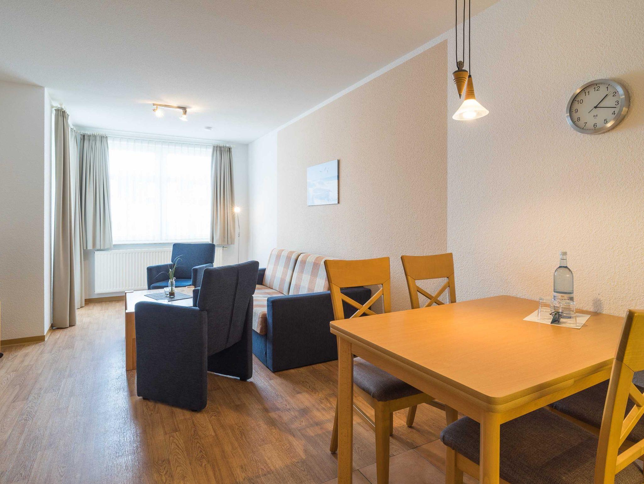 Die gemütliche 2-Zimmer-Wohnung Zepmin im ersten Obergeschoss für max. 3 Erwachsene und 1 Kleinkind bis 3 Jahre befindet im Haus am Kurpark - nur wenige Schritte von der Promenade und dem Strand entfernt. Im Wohnbereich befinden sich neben der gemütlichen Couch (Aufbettungsmöglichkeit für 2 Personen) auch zwei Sessel sowie ein Esstisch mit 4 Stühlen, der genügend Platz für 4 Personen bietet. Vom Wohnbereich aus gelangen Sie auf den Balkon, welche sich zur Hofseite gelegen befindet. Hier können Sie bei schönem Wetter bereits morgens Ihren Kaffee genießen oder den Abend bei einem Glas Wein ausklingen lassen können. Die moderne Küchenzeile mit Ceranherd, Backofen, Geschirrspüler, Mikrowelle, Kaffeemaschine, Wasserkocher und Toaster lässt keine Wünsche offen. Für die Unterhaltung sorgen ein Flachbild-TV, Radio-CD-Player und kostenfreies W-LAN. Das Schlafzimmer verfügt über ein Doppelbett und TV und das Badezimmer hat Badewanne/WC.