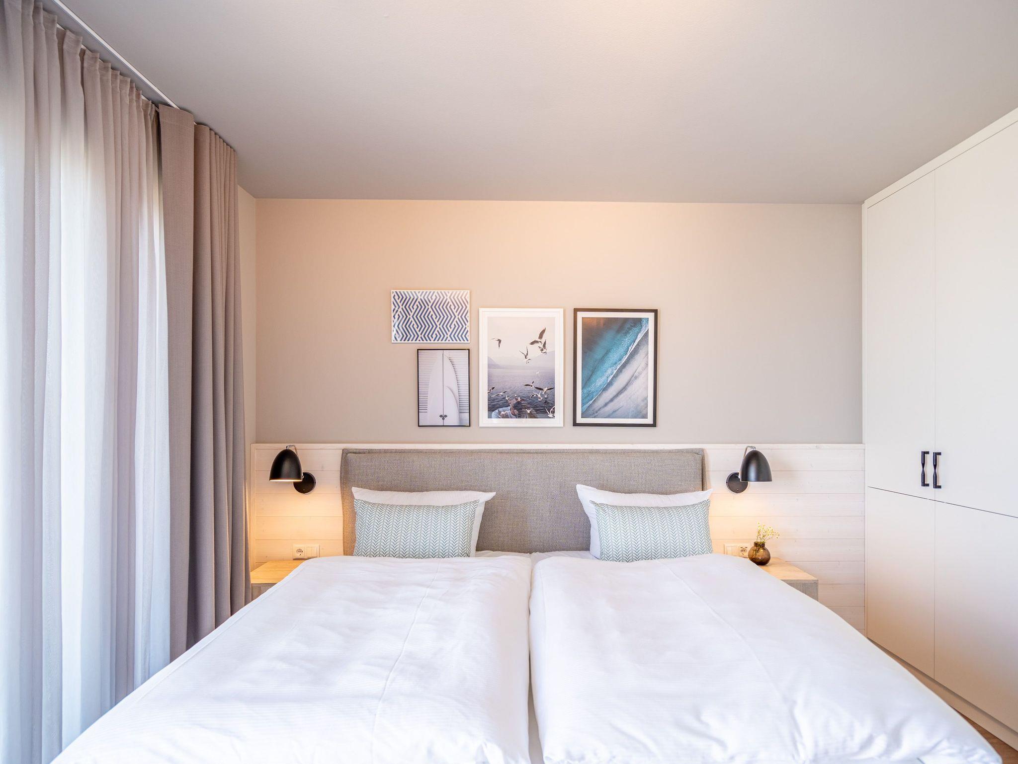 Willkommen im Strandterrasse 2-Raum-Appartement Nr. B4.2 (Haus B), einem bezaubernden Rückzugsort hoch oben in der 4. Etage mit einem spektakulären Blick auf das Meer und einer Vielzahl von Annehmlichkeiten, die Ihren Aufenthalt unvergesslich machen. Dieses geräumige 75 Quadratmeter große Appartement bietet Platz für 2 Personen[nbsp] [&] 1 Kleinkind (im Babybett). Der offene Wohn- und Essbereich ist einladend gestaltet und verfügt über eine moderne Küchenzeile mit allem, was Sie benötigen, einschließlich einer Backofen-Mikrowellen-Kombi, einem 3-Platten-Induktionsherd und einer Nespresso-Kapselmaschine. Ein gemütlicher Essplatz für 4 Personen und eine Working Station bieten den perfekten Raum für Mahlzeiten und produktives Arbeiten. Der Elektrokamin (ohne Wärmeabgabe) schafft eine gemütliche Atmosphäre, während eine komfortable Sitzgruppe und ein Flat-TV (50 Zoll) für Unterhaltung sorgen. Der Süd-Ost-Balkon lädt dazu ein, die frische Meeresluft zu genießen. Ausgestattet mit einem Gartentisch und zwei Stühlen ist er der perfekte Ort für ein gemütliches Frühstück oder einen romantischen Abend zu zweit. Das angrenzende Schlafzimmer bietet ein luxuriöses Boxspringdoppelbett (2,00m x 2,00m), ein festes Babybett, einen geräumigen Kleiderschrank und einen Flat-TV (43 Zoll). Ein weiterer Zugang zum Balkon mit einer entspannenden Gartenliege ermöglicht es Ihnen, die Sonne zu genießen und den Blick auf das Meer zu bewundern. Genießen Sie den atemberaubenden Meerblick vom Wohnzimmer und Schlafzimmer aus, während Sie sich entspannen und die Schönheit der Umgebung auf sich wirken lassen. Das moderne Badezimmer ist mit einer erfrischenden Dusche, einem Waschtisch, einem WC und sogar einer Infrarotsaunakabine ausgestattet, um Ihnen maximale Entspannung zu bieten. Ein PKW-Stellplatz in der Tiefgarage steht Ihnen zur Verfügung, um Ihr Fahrzeug sicher und bequem abzustellen. Erleben Sie einen unvergesslichen Aufenthalt in dieser stilvollen und komfortablen Ferienwohnung.