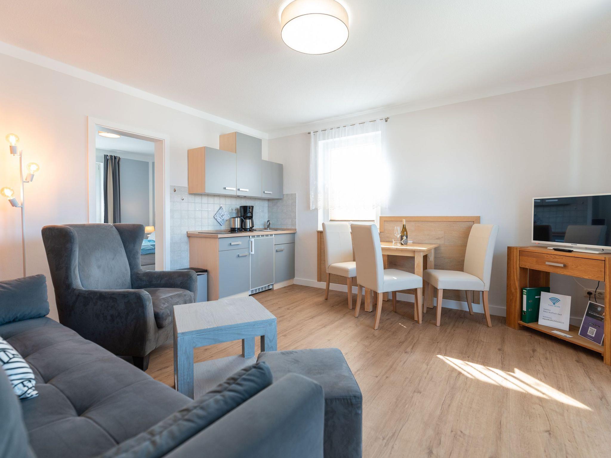 Die offene Küche ist ideal in den Wohnbereich integriert und bietet Ihnen eine kleine Küchenzeile mit Kühlschrank, Kaffeemaschine, Wasserkocher und Geschirr/Besteck ? alles, was Sie für Ihre Selbstversorgung brauchen. Die Ferienwohnung ist für bis zu 3 Personen perfekt geeignet.