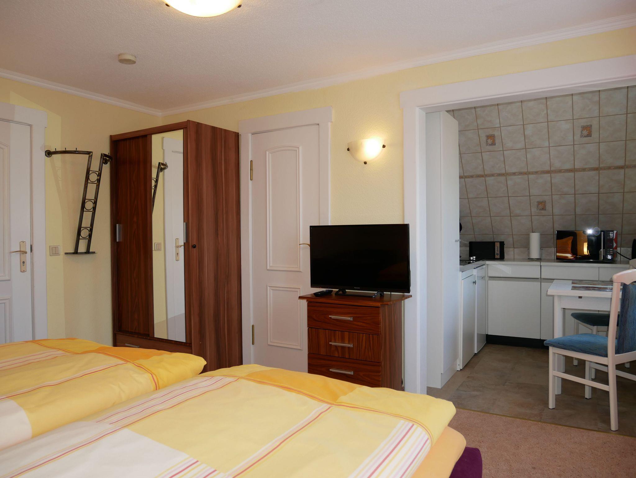 Die kleine gemütliche Ferienwohnung befindet sich im ersten Obergeschoss des Hauses und ist ca. 26m² groß. Der kombinierte Wohn- und Schlafraum ist ausgestattet mit einem großen Doppelbett, 2 Sesseln, Tisch, einem Kleiderschrank, Flachbild-TV und mit einem Radio. Die kleine Pantry-Küche ist optisch vom Wohnbereich abgeschlossen. Sie verfügt über einen Kühlschrank, 2-Platten-Herd, Mikrowelle, Toaster, Wasserkocher und Kaffeemaschine. Ein Esstisch mit zwei Stühlen befindet sich ebenfalls in der Küche. Das Badezimmer ist mit einer Dusche/WC und einer Handtuchheizung ausgestattet. Ein Parkplatz ist auf dem Grundstück vorhanden. Endreinigung, Bettwäsche und Handtücher sind inklusive. W-LAN ist kostenfrei vorhanden.