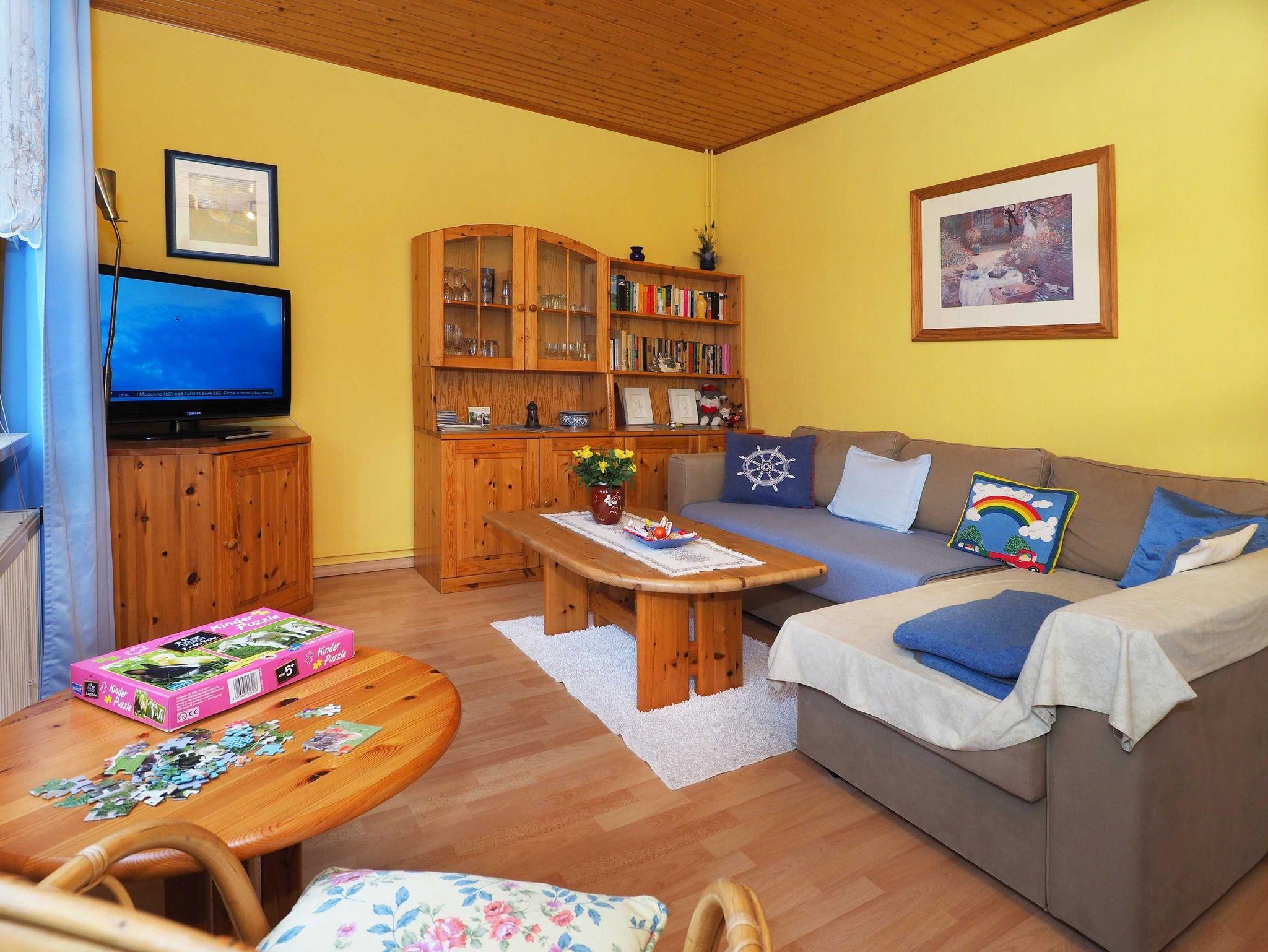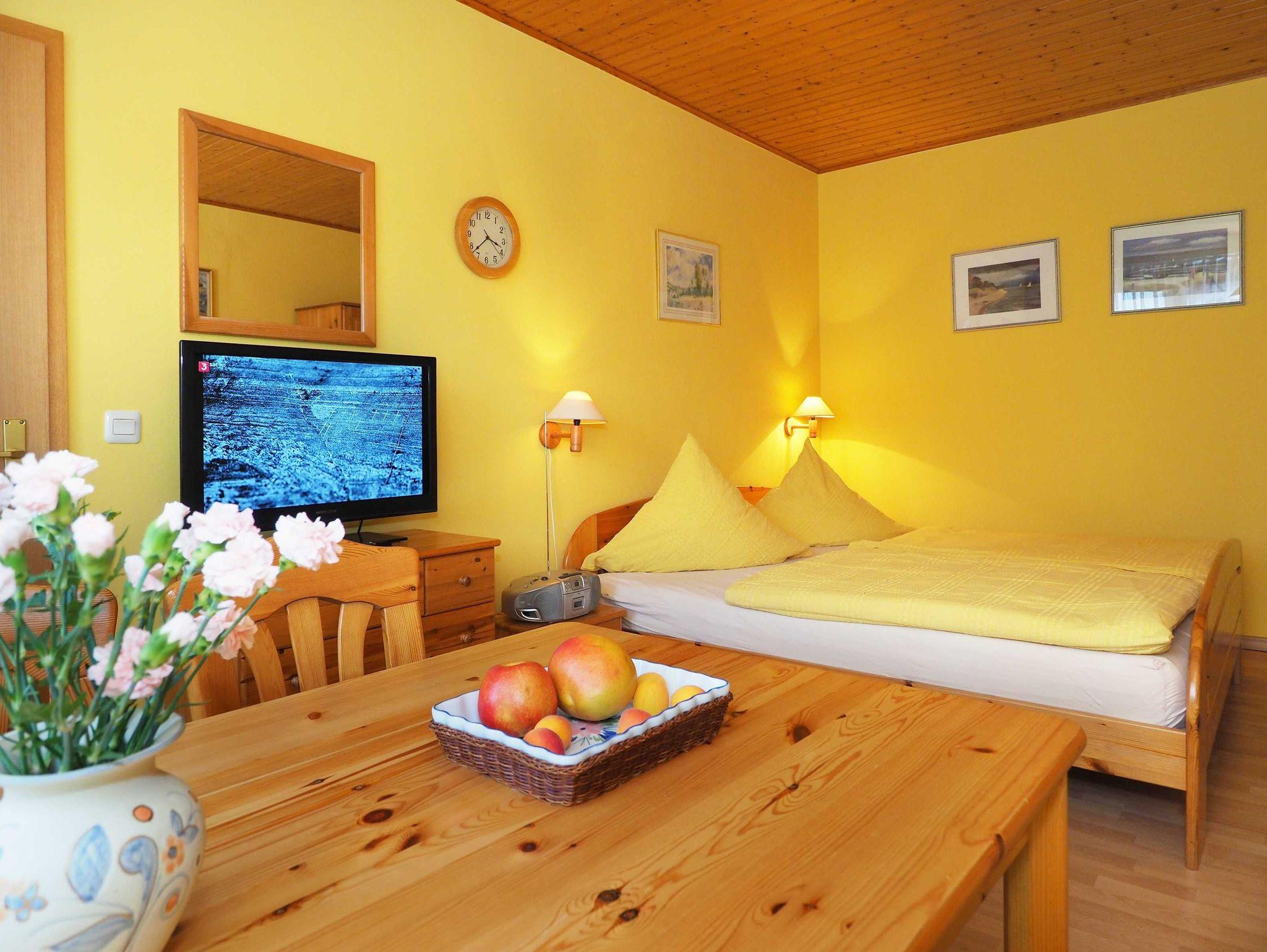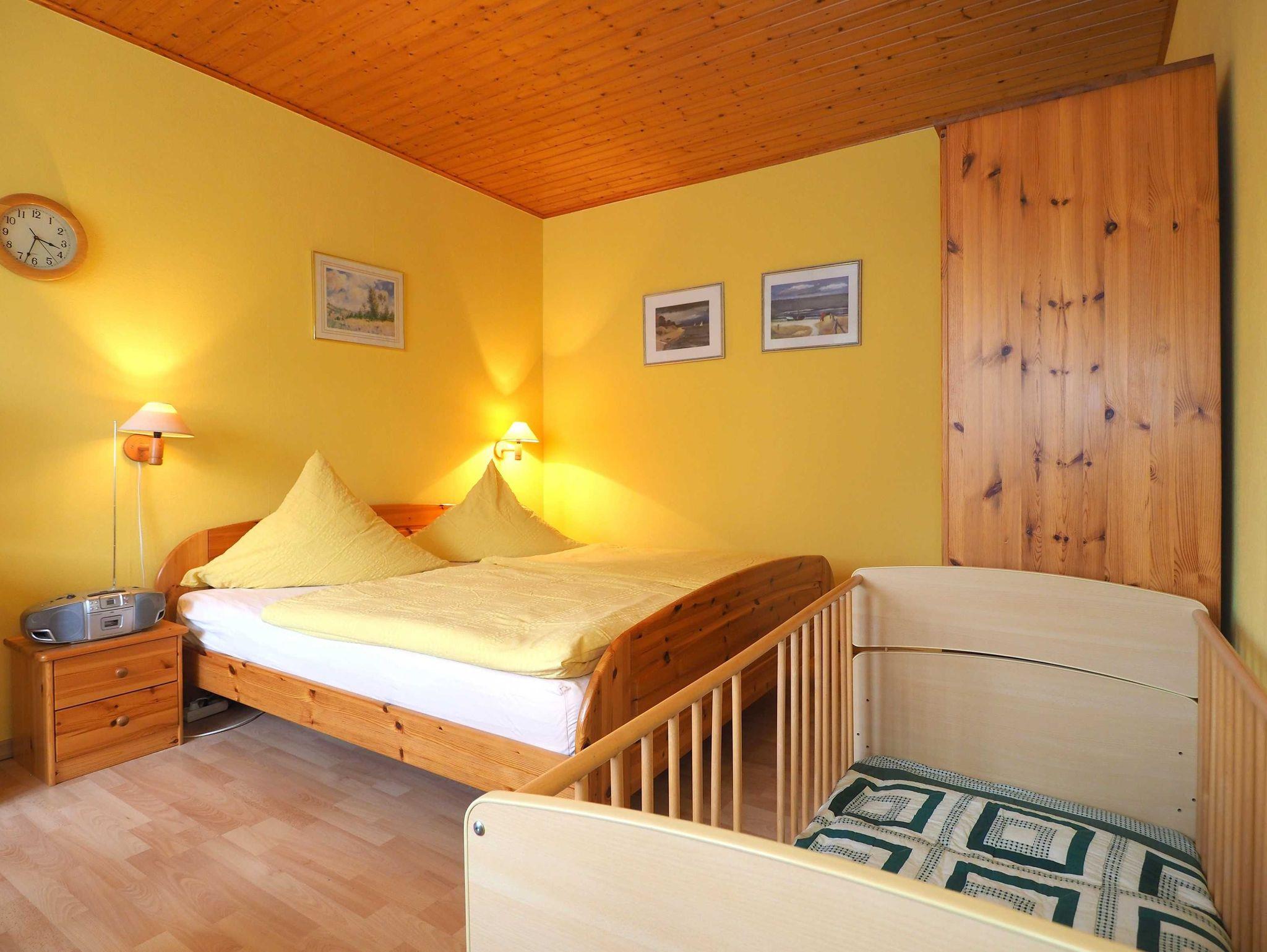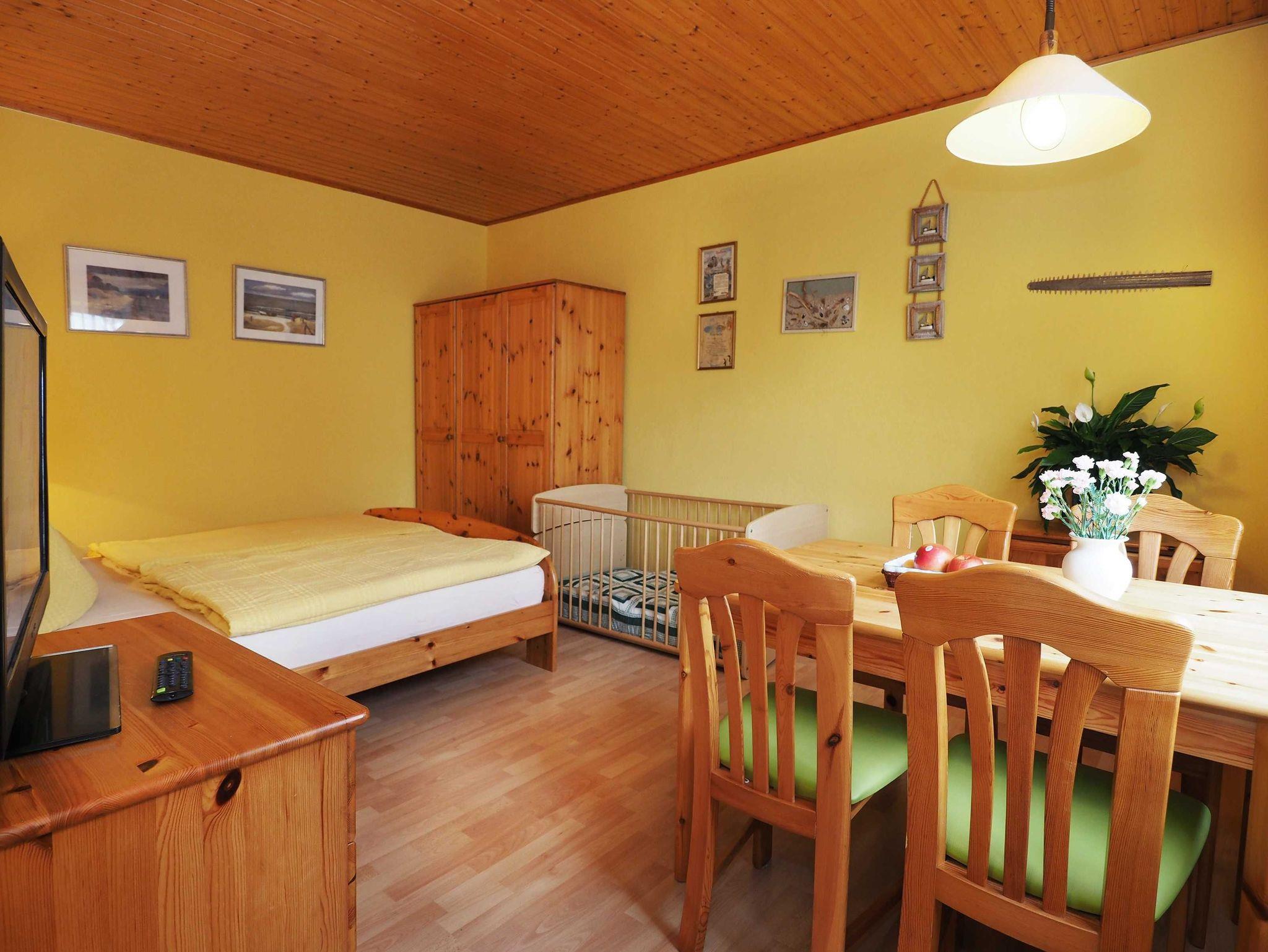 In dieser, unserer größten Ferienwohnung, finden 4 Personen eine Unterkunft. 1 Wohn-Schlafraum mit Doppelbett (Aufbettung möglich) und 1 Wohn-Schlafraum mit Doppelstockbett. Das Bad ist mit Dusche, WC & Fön ausgestattet. Die Wohnung verfügt über 2 Flachbild- TV Geräte, CD- Player + Radio, ebenfalls steht Ihnen W-LAN kostenfrei zur Verfügung. Sie ist komfortabel und kindgerecht eingerichtet (Kinderbett, Kindertisch, -stuhl, -wäsche, Spielzeug und Kinderhochstuhl). Die Küchen sind komplett ausgestattet, so dass Sie sich zu jeder Mahlzeit auch selbst verpflegen können. Eine Waschmaschine kann gegen eine Gebühr in Höhe von 4,00 Euro pro Waschgang (inklusive Waschmittel) genutzt werden. Die Benutzung des Trockners beträgt 3,00 Euro.