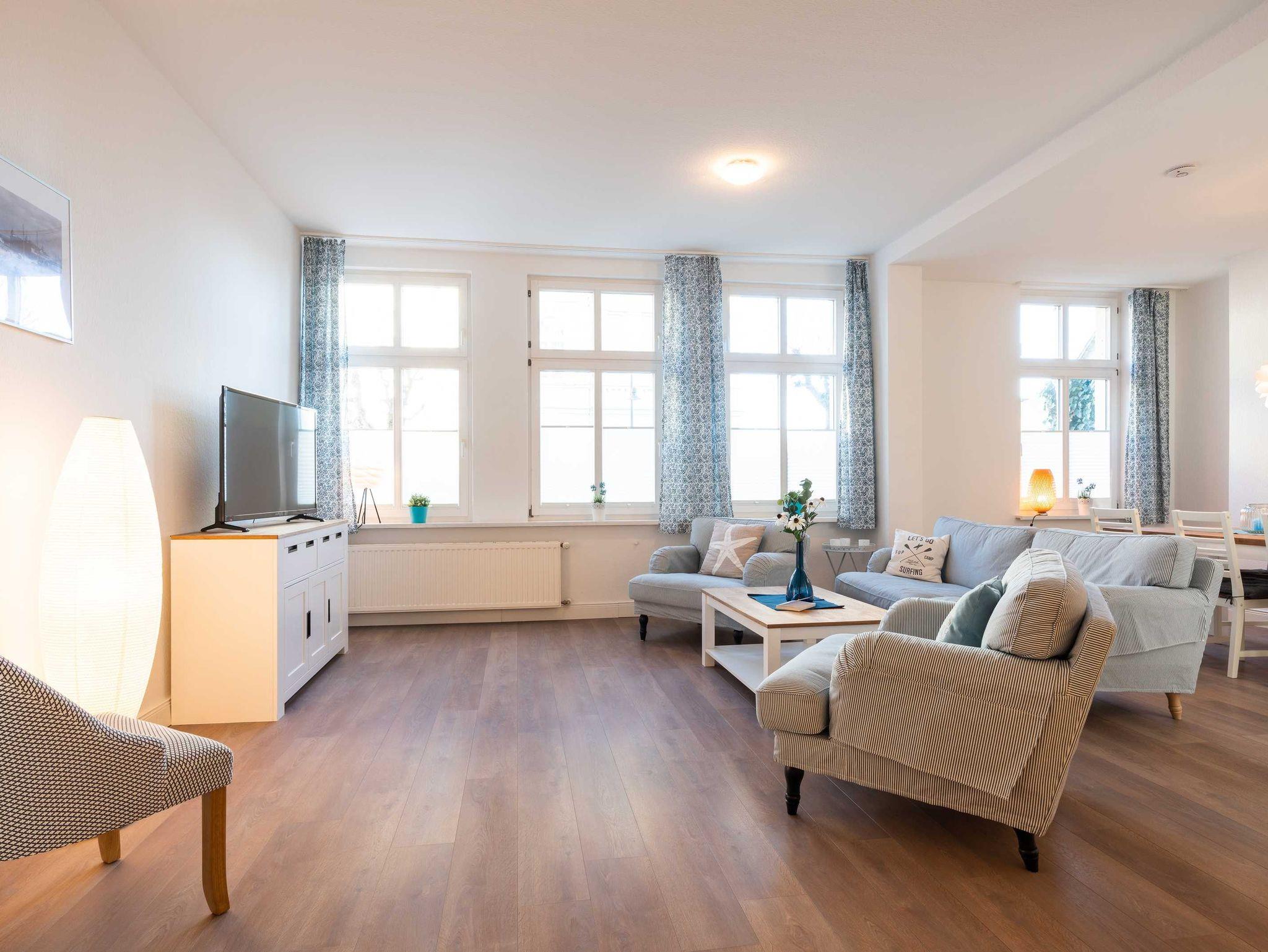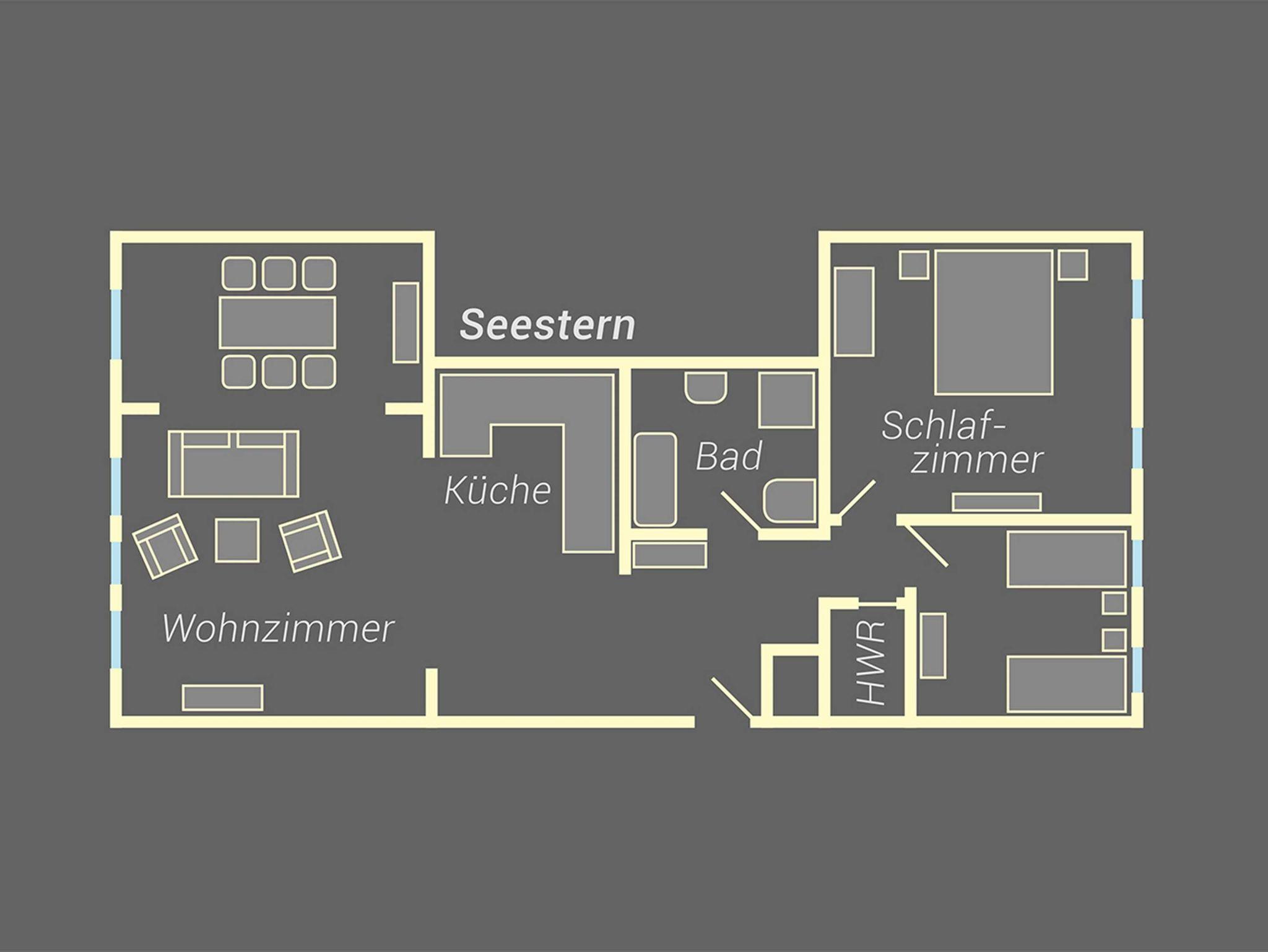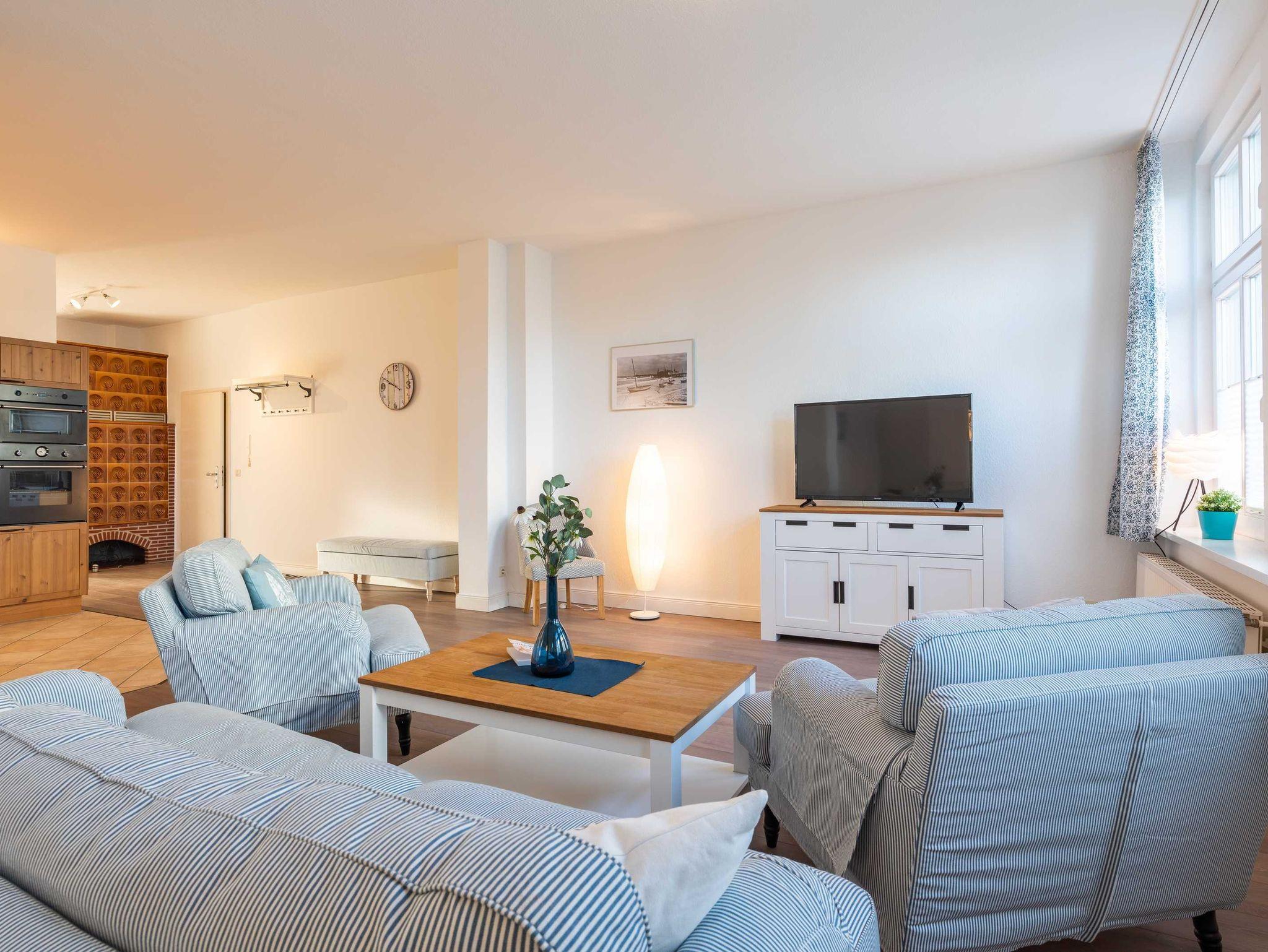 Das 85 qm große Appartement Seestern verfügt über geräumiges Wohnzimmer mitgemütlicher Wohnlandschaft und einen großen Essplatz. Die offene Küche ist komplett mit Spülmaschine, Mikrowelle, Herd und Backofen ausgestattet und lässt keine Wünsche offen, um eine tolle Mahlzeit zuzubereiten.