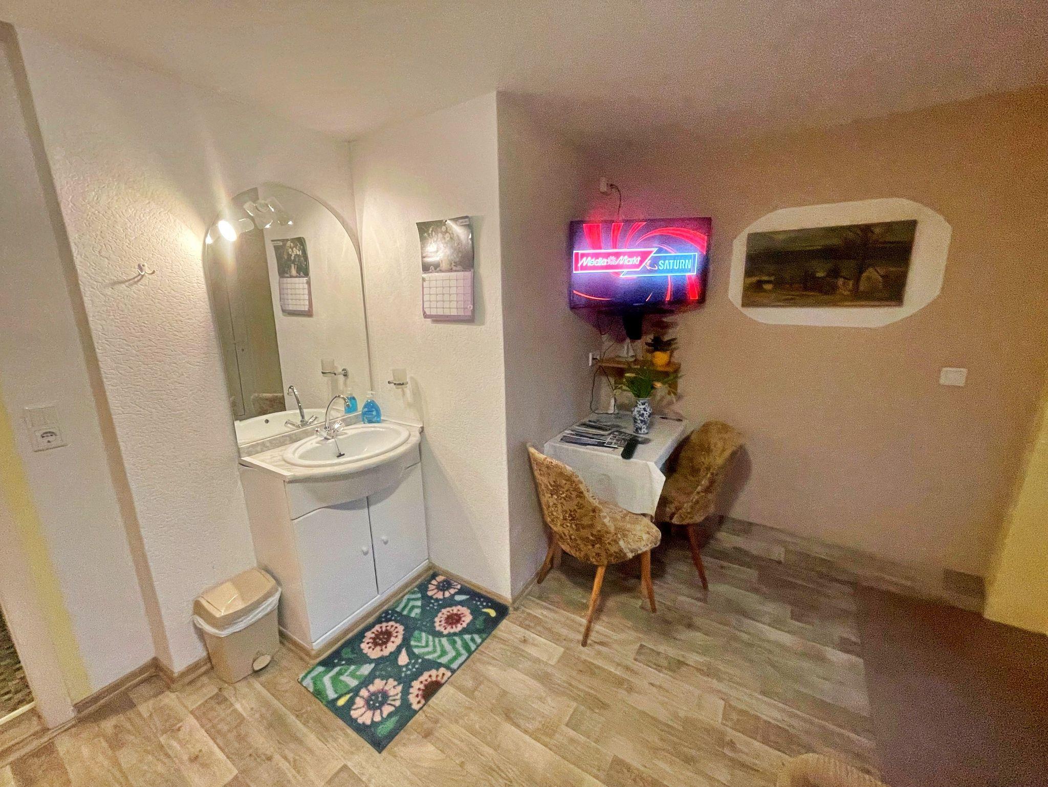 Das gemütlich eingerichtete Einzelzimmer befindet sich im Souterrain im Wohnhaus des Vermieters und verfügt über einen separaten Eingang. Das Zimmer ist mit einem Einzelbett, Sitzecke mit 2 Stühlen, Fernsehsessel und Flat-TV ausgestattet. Das Waschbecken befindet sich mit im Zimmer. Eine Kaffeemaschine befindet sich mit im Zimmer. Das Bad ist mit Dusche und WC. Eine kleine Gemeinschaftsküche befindet sich direkt neben dem Zimmer. Diese ist ausgestattet mit Kühlschrank u. Toaster sowie einer Pantryküche. Die Erstausstattung Bettwäsche und Handtücher, Endreinigung sowie der Parkplatz sind im Preis inklusive.