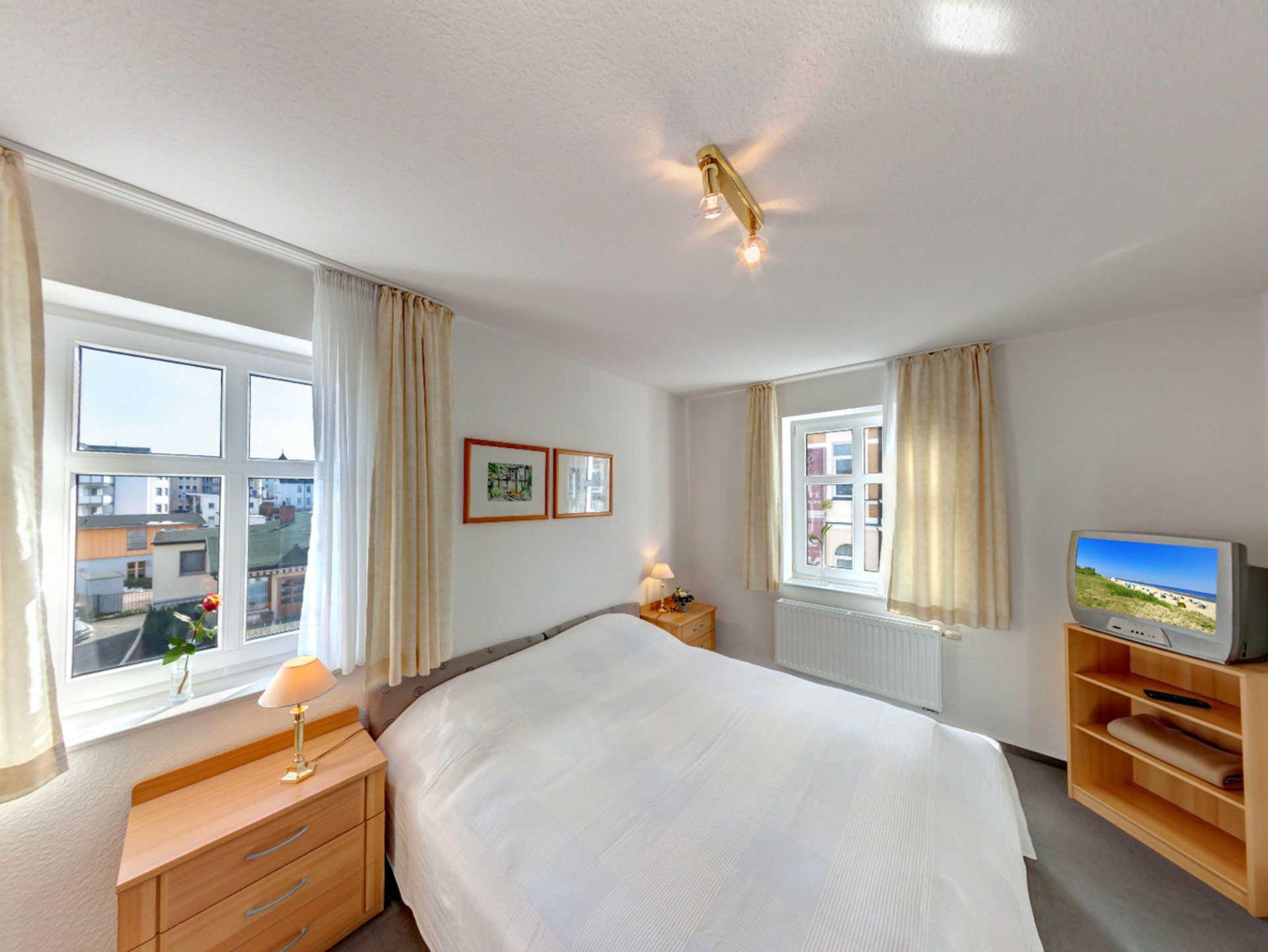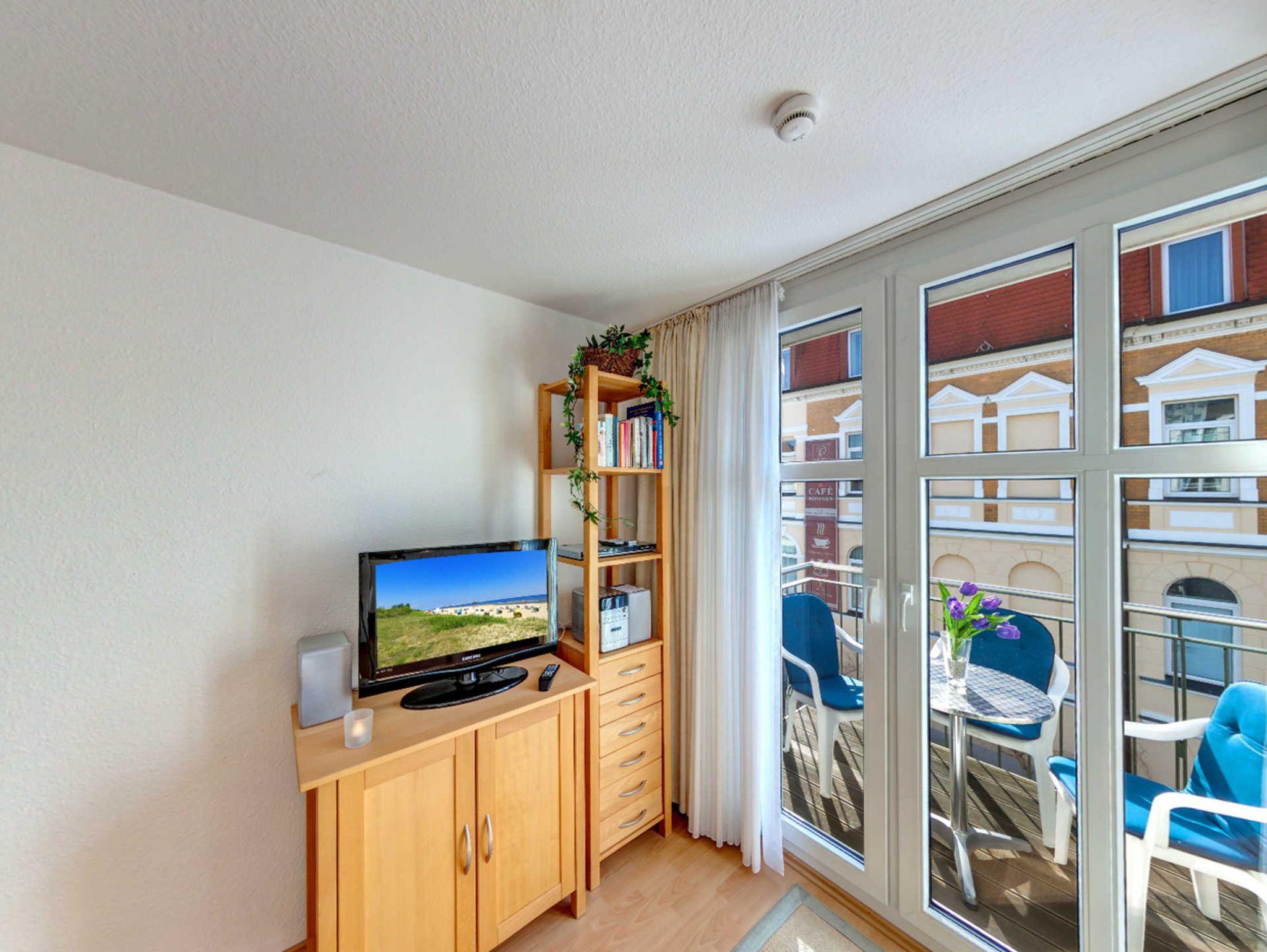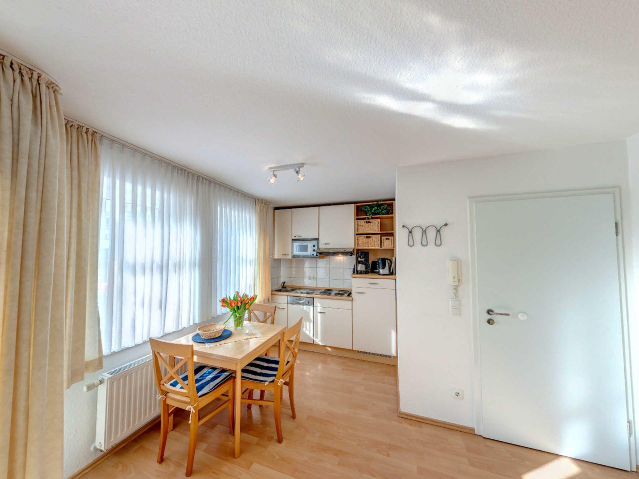 Das Appartement verfügt über ein separates Schlafzimmer mit einem Doppelbett. In den Wohnbereich mit gemütlicher Sitzgruppe und einem Essbereich ist eine offene und mit Kaffemaschine, Wasserkocher, Toaster, Mikrowelle und Geschirrspüler voll ausgestattete Küchenzeile integriert. Vom Wohnbereich aus gelangen Sie auch auf den Südbalkon, auf dem Sie bis Abends die Sonne genießen können. Das Bad ist mit Dusche und WC ausgestattet. Zum Appartement gehört ein kostenfreier Stellplatz in der hauseigenen Tiefgarage.