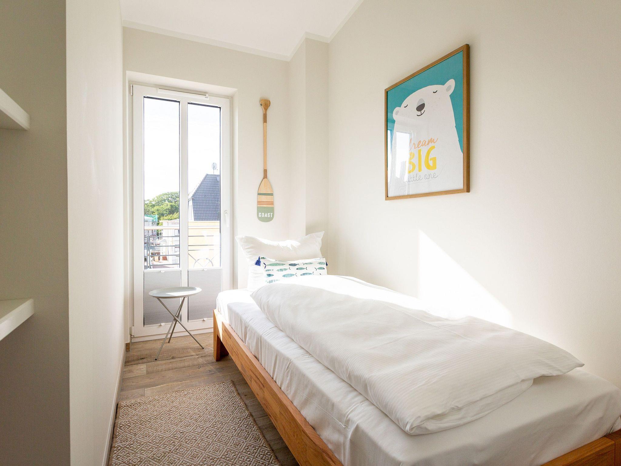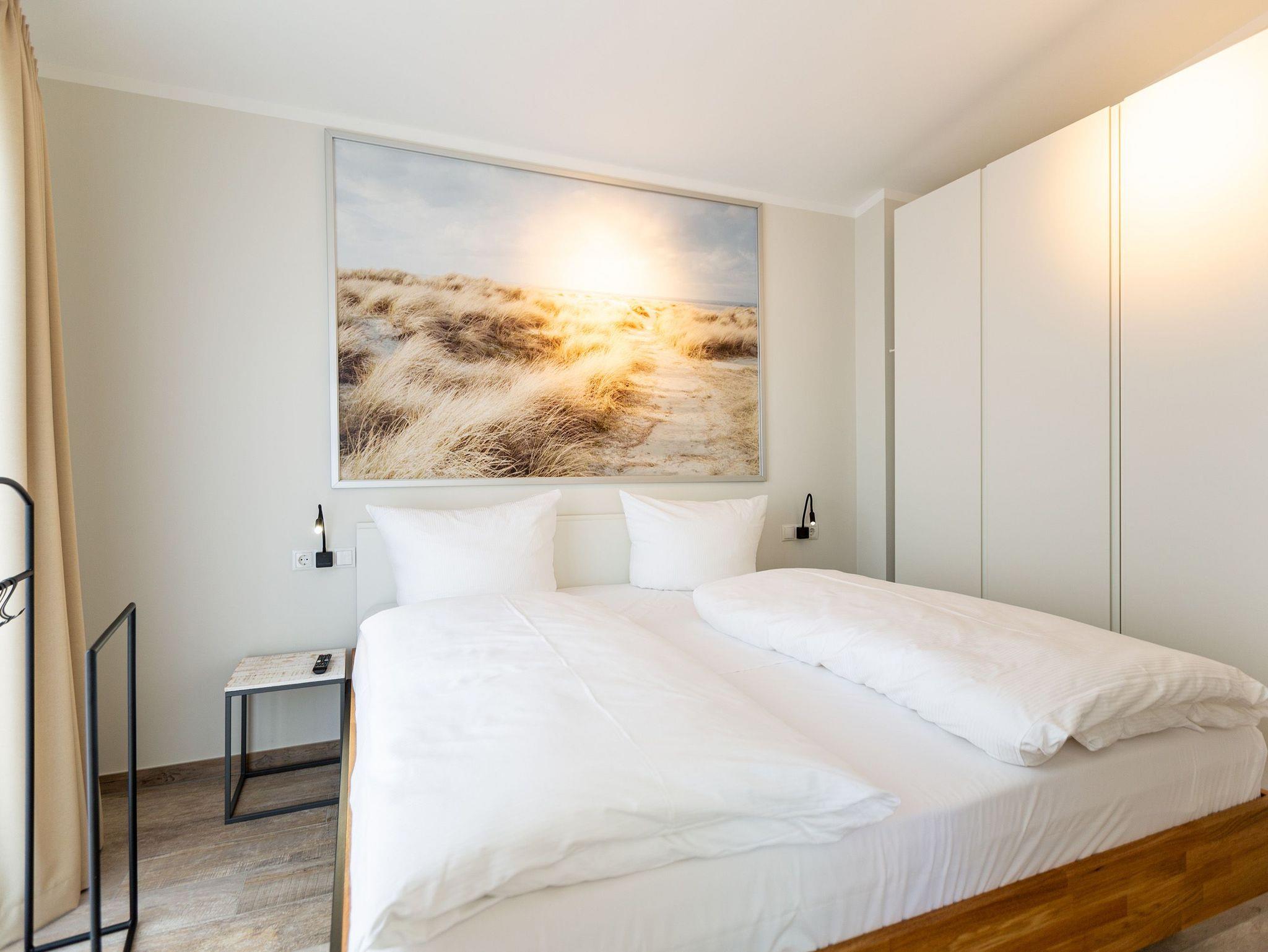 Ein wunderschönes Design-Appartement erwartet Sie im Dachgeschoss vom Quartier Sieben. Denn das 56 Quadratmeter große Feriendomizil ist besonders stilvoll und mit einem feinen Gespür für Möbel und Accessoires eingerichtet. Mit großer, umlaufender Außenterrasse (34 Quadratmeter) und einem geräumigen Innenbereich sorgt es für Wohlgefühl von der ersten Minute an. Bis zu drei Personen können hier in den drei Zimmern Urlaub machen. Ein elegant und stylisch eingerichtetes Wohnzimmer bietet viel Platz zum Entspannen und zur Unterhaltung. Ein Elektro-Kamin schenkt abends oder an ungemütlichen Tagen ein bisschen Romantik. Ein großer Flat-TV bietet Spaß und spannende Filme. Einfach aufs Sofa oder in den urigen Kord-Sessel fallen lassen und abschalten. In das Wohnzimmer integriert ist eine moderne und voll ausgestattete Küche und ein Essplatz mit gemütlichen Moises-Stühlen. Moderne Markengeräte wie ein Induktionsherd erleichtern das Kochen und Zubereiten der Speisen oder den Abwasch. Edles Ess- und Kochgeschirr finden Sie in den Küchenschränken. Das Master-Schlafzimmer verfügt über ein bequemes Doppelbett (1,80 m x 2,00 m). Ein großer Schrank und ein Flat-TV gehören ebenfalls zur Ausstattung. Im zweiten Schlafzimmer befindet sich ein Einzelbett (0,90 m x 2,00 m). Das Badezimmer wird durch ein Tageslichtfenster im Dach beleuchtet. Es verfügt über eine Dusche, einen Waschtisch, ein WC und einen Waschtrockner. Entspannen Sie in Ihrem ganz privaten kleinen Spa bei kuscheligen Temperaturen. Denn das Highlight des Badezimmers ist eine kleine finnische Sauna. Handtücher liegen übrigens für Sie bereit. Auch die Betten sind bei Anreise schon bezogen. In der Tiefgarage gibt es einen Pkw-Stellplatz für Sie. Das WLAN-Netz ist kostenfrei nutzbar. Ein abschließbarer, wohnungseigener Fahrradkeller steht Ihnen ebenfalls zur Verfügung. Hier haben Sie die Möglichkeit, Ihr E-Bike aufzuladen.