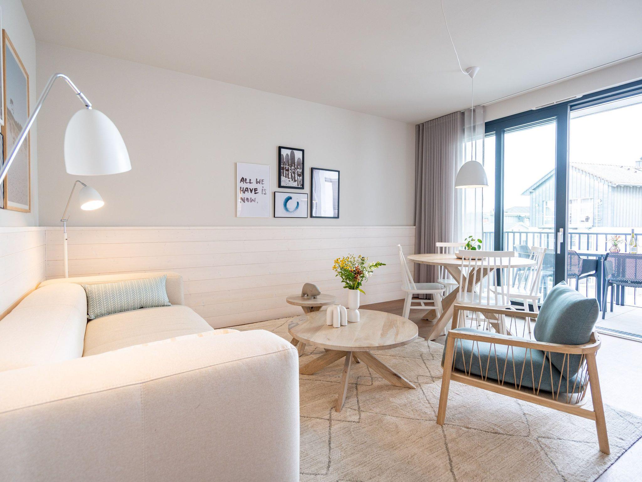 Helle, lichtdurchflutete Räume, ein hyggeliges Designkonzept und allen Komfort, den man sich nur wünschen kann ? das 2-Raum-Appartement B 2.9 (Haus B) in der 2. Etage der Strandterrasse bietet auf 60 Quadratmetern zwei Personen und einem Kind bis 5 Jahre all das und noch viele weitere Annehmlichkeiten. Hier wird Ihre Ostseeauszeit zu einem unvergesslich schönen Erlebnis, denn Sie wohnen in einem Urlaubsparadies, aus dem Sie am liebsten gar nicht wieder ausziehen wollen. Das großzügige und wunderschön eingerichtete Wohn-Esszimmer lädt zum Genießen am großen Esstisch und zum Relaxen auf der gemütlichen Sofa-Sitzgruppe ein. Ein Flat-TV (50 Zoll) sorgt für Kinounterhaltung und ein Elektrokamin (ohne Wärmeabgabe) schafft mit seinem flackernden Flammenspiel eine kuschelig romantische Atmosphäre. In der offenen Küchenzeile ist alles vorhanden, was Sie für die Zubereitung gemeinsamer Mahlzeiten brauchen. Dazu gehören ein Backofen, ein 3-Platten-Induktionsherd, ein Toaster, ein Wasserkocher, eine Kaffeemaschine und eine Nespresso-Kapselmaschine. Sowohl vom Schlafzimmer als auch vom Wohnzimmer aus haben Sie Zugang auf einen Nord-Ost-Balkon. Ob morgens gleich nach dem Aufstehen oder beim Essen unter freiem Himmel ? lassen Sie sich sie frische Ostseeluft, die vom nahen Strand herüberrauscht, genüsslich um die Nase wehen. Sie ist sehr gesund. Im Schlafzimmer wartet ein komfortables Boxspringdoppelbett (1,80m x 2,00m) und ein Kindertagesbett (0,80m x 1,40m) nur darauf, Ihnen himmlische Träume zu verschaffen. Im modernen Badezimmer gibt es neben der Dusche, dem Waschtisch und dem WC sogar eine Infrarotsauna. Hier können Sie in wohliger Wärme die Zeit vergessen. Ein PKW-Stellplatz in der Tiefgarage sorgt für bequemes Parken. Wir wünschen Ihnen viel Freude in diesem charmanten Urlaubsdomizil.