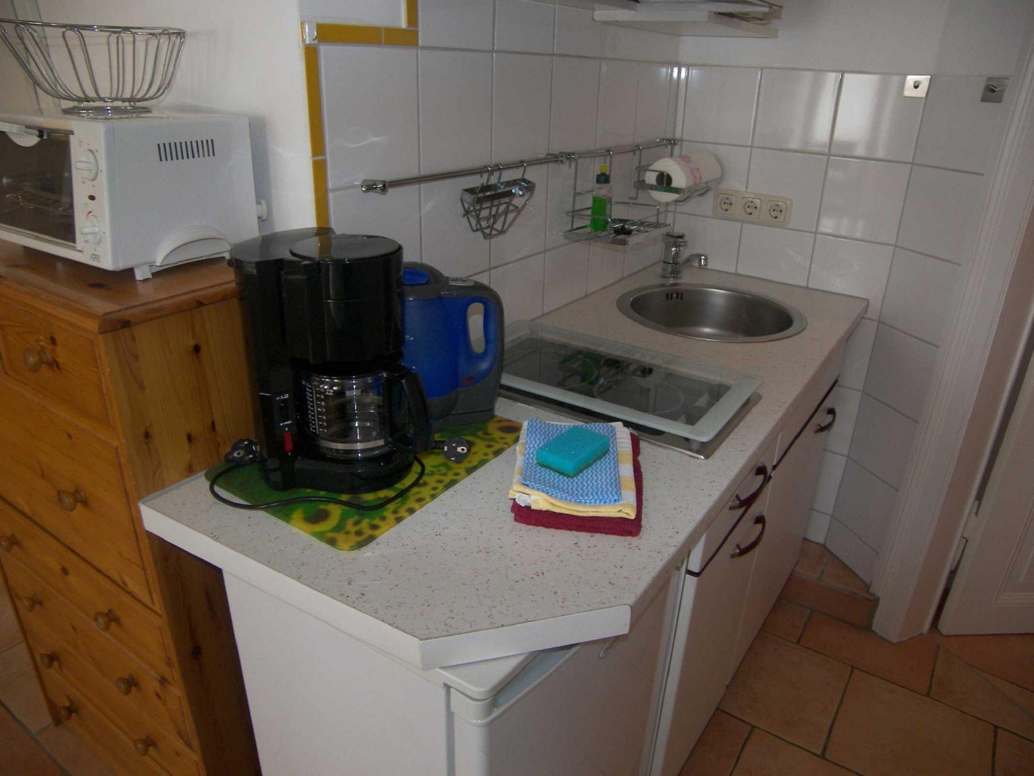 Die Pantryküche ist mit einen 2-Platten-Herd, Spüle, Kühlschrank, Kaffeemaschine, Wasserkocher, Toaster und Geschirr etc.). Badzimmer mit DU/WC.