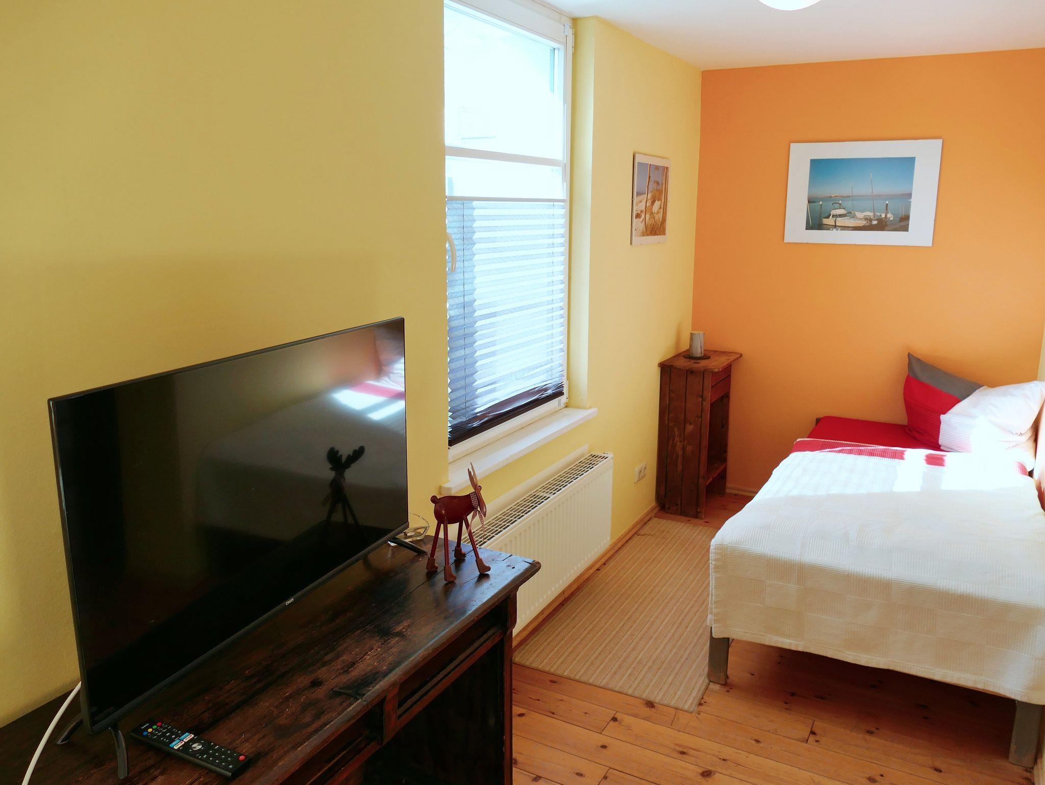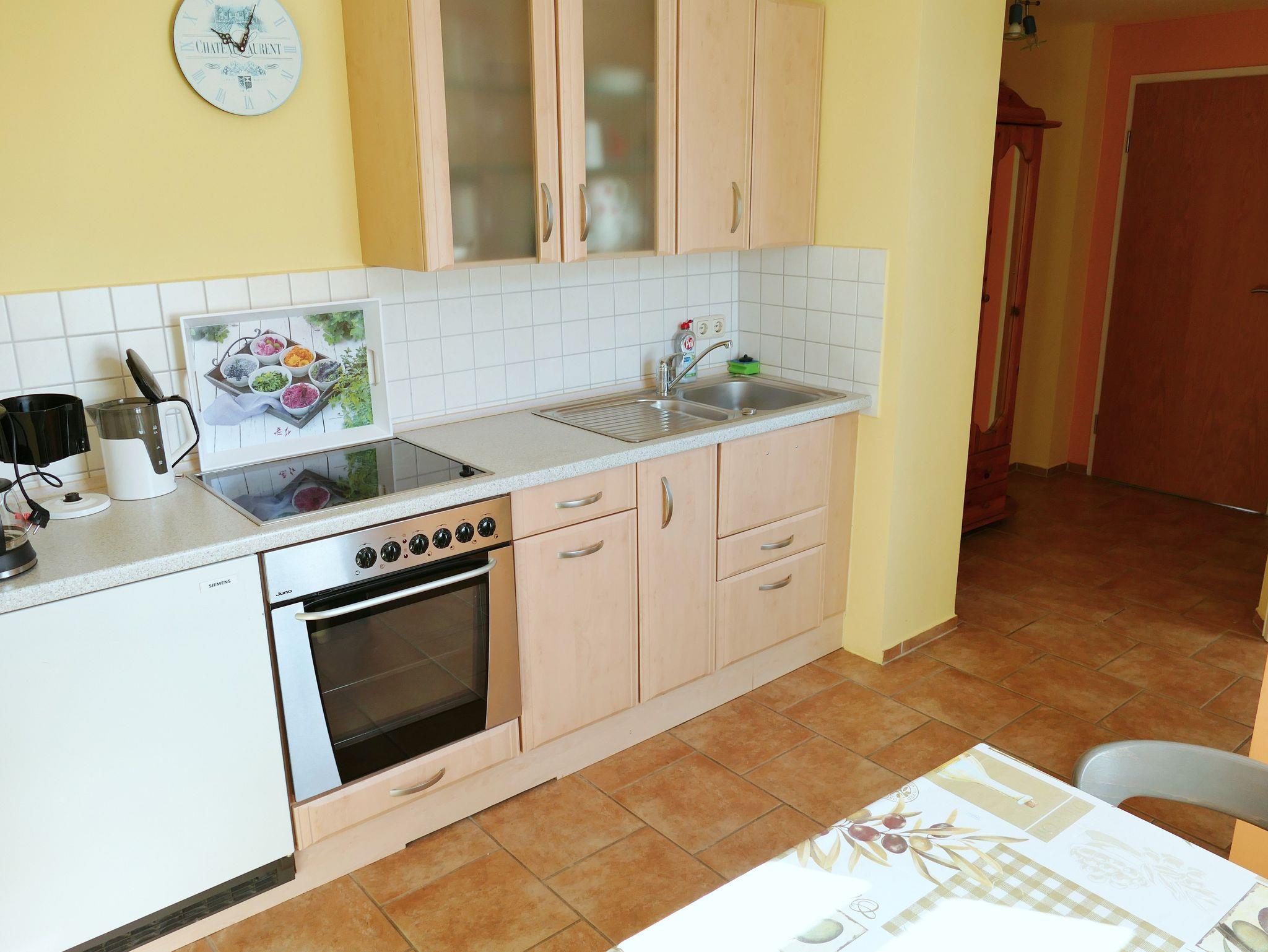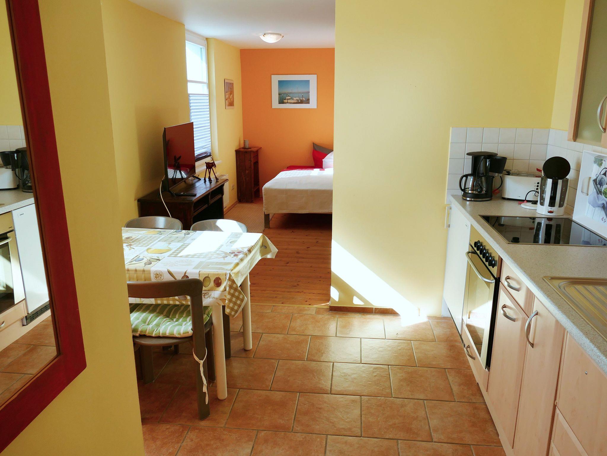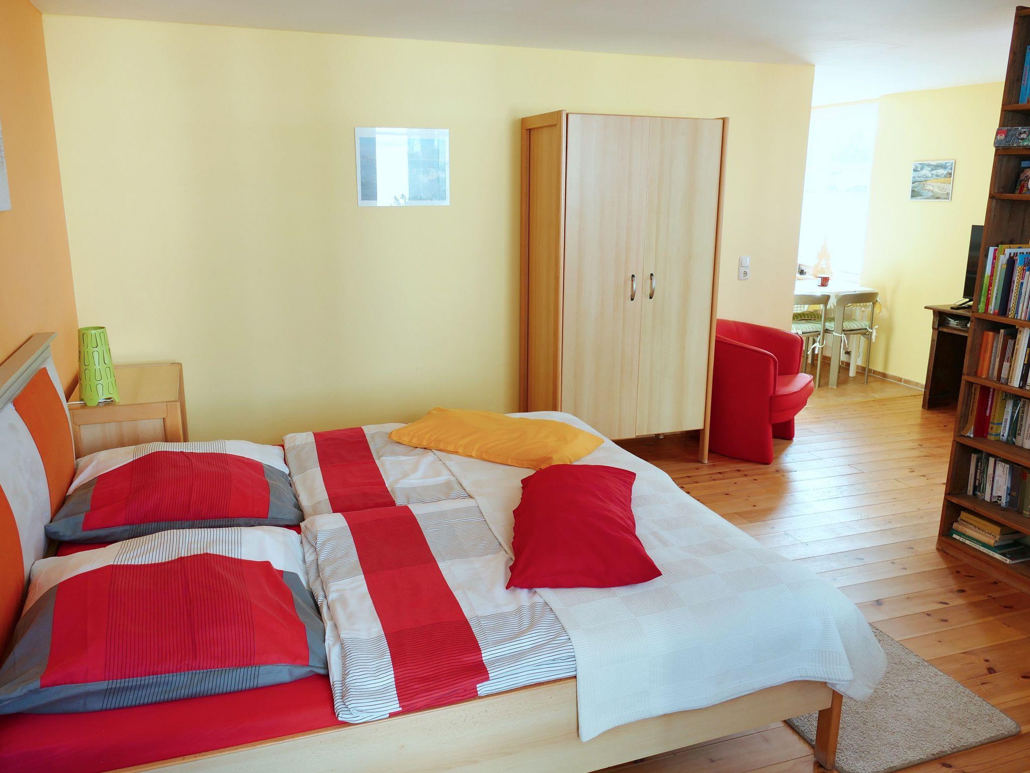 Die 45 qm große Ferienwohnung mit separatem Zugang befindet sich in der ersten Etage. Sie verfügt über einen kombinierten Wohn- Schlafbereich (mit Doppelbett und Einzelbett), einer angrenzenden Veranda mit Sitzgelegenheit sowie einer offenen Küchenzeile, ausgestattet mit Kühlschrank mit Tiefkühlfach, Kaffeemaschine, Toaster, Wasserkocher. Bad mit Dusche und WC, die Wohnung verfügt über eine Zentralheizung und WLAN.