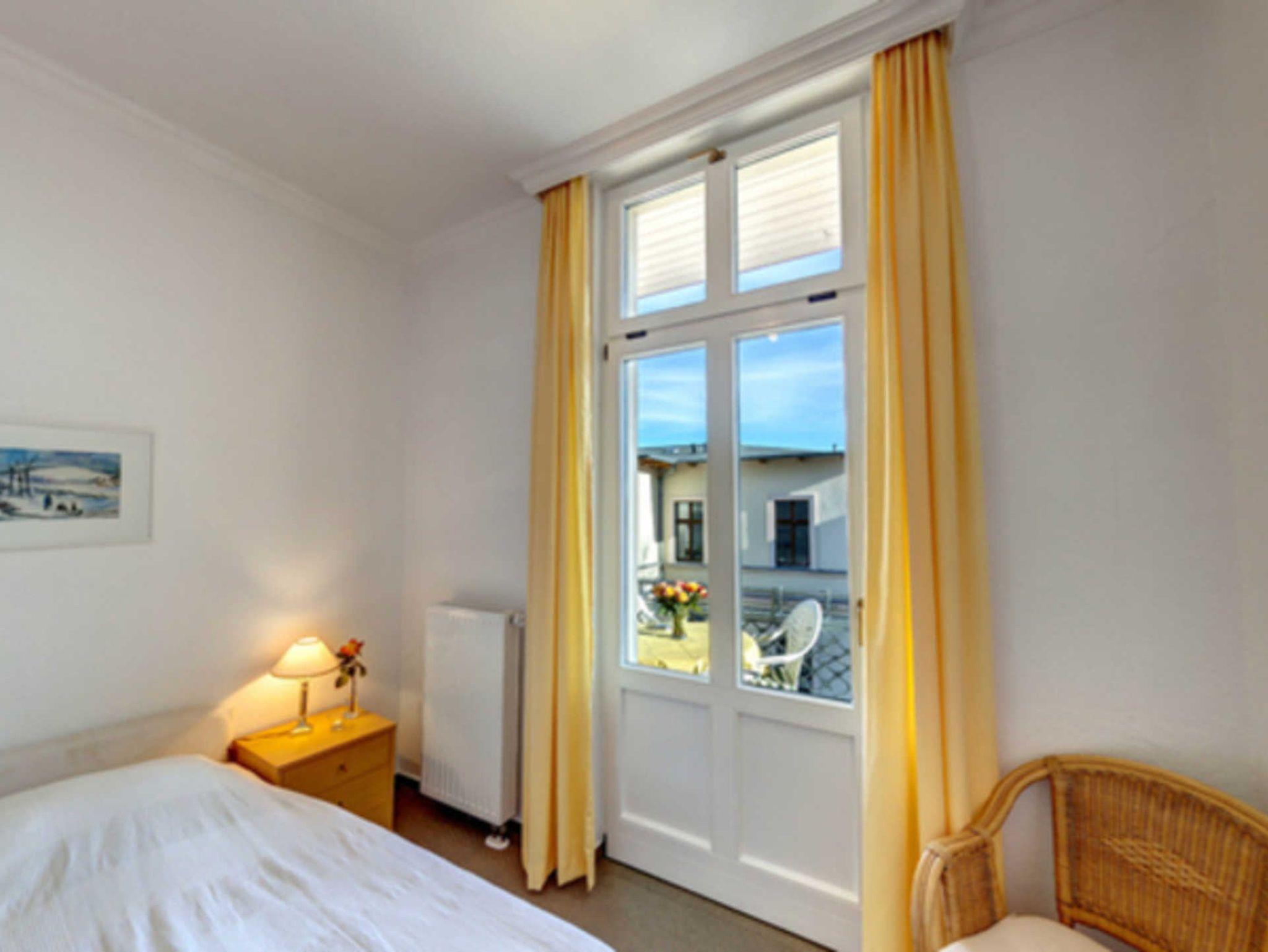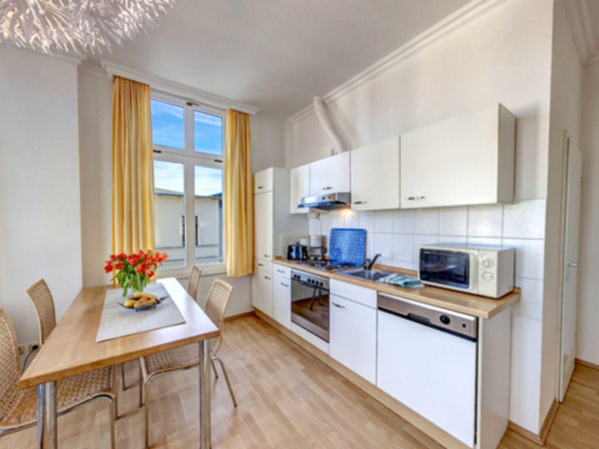 Das gemütliche 2-Zimmer-Appartement Nr. 11 befindet sich im ersten Obergeschoss der Villa Ostseewarte. Es verfügt über ein separates Schlafzimmer mit einem Doppelbett und einen Wohnbereich. Die voll ausgestattete Küchenzeile mit Kaffeemaschine, Wasserkocher, Toaster, Backofen und Geschirrspüler sowie einem Essplatz ist in den geräumigen Wohnbereich integriert. Das Bad ist mit Dusche und WC ausgestattet. Zum Appartement gehört darüber hinaus ein möblierter Südbalkon. Ein Pkw-Stellplatz steht Ihnen auf dem Grundstück kostenfrei zur Verfügung und Ihre Fahrräder können Sie ebenfalls auf dem Grundstück in einem separaten Abstellraum unterbringen. Alle Wohnungen in der Villa Ostseewarte haben passwortgeschütztem DSL-WLAN Internetzugang (gerätegebunden, Euro 1,50 pro Tag und Gerät). Ein FAHRSTUHL wurde nachträglich eingebaut. Eine Waschmaschine können Sie direkt im Haus gegen Gebühr nutzen (Münzgerät).