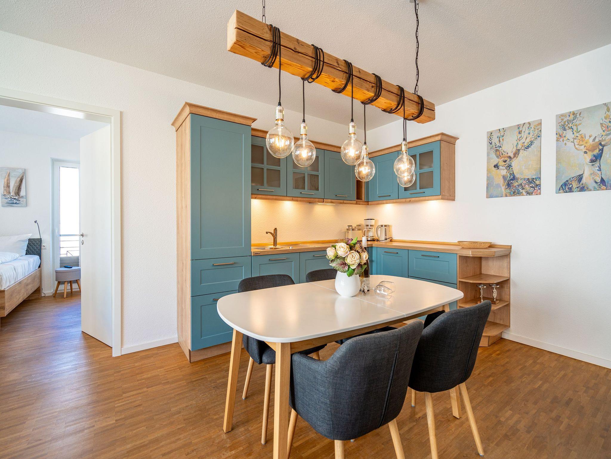 Helle Räume, ein natürliches Mobiliar und eine gemütliche Atmosphäre erwarten Sie in diesem 76qm großen Urlaubsdomizil in Seebad Ahlbeck. Das 3-Zimmer-Appartement im 1. Obergeschoss bietet ausreichend Platz für bis zu 4 Personen. Ob als Familie und Urlaub mit Freunden - hier fühlen sich alle rundum wohl! Der offen gestaltete Wohn-Ess-Bereich verfügt neben einer bequemen Sofalandschaft mit Sessel über einen 32-Zoll Flat-TV und ein Radio mit CD-Player. Die moderne Küche mit Ceranfeld, Backofen, Kühlschrank mit Gefrierfach, Geschirrspüler und Kleinküchengeräten lässt beim Zubereiten Ihrer Speisen keine Wünsche offen. Genießen Sie Ihre Mahlzeiten am Esstisch im skandinavischen Stil oder frühstücken Sie auf dem ca. 5qm großen Süd-West-Balkon direkt gegenüber. Auf Schlafkomfort müssen Sie auch in Ihrem Urlaub in den beiden Schlafzimmern nicht verzichten, die mit bequemen Boxspringbetten (1,80 m x 2,00 m), Flat-TVs und ausreichend Schrankraum für Ihre Urlaubsgarderobe ausgestattet sind. Vor allem befreundete Paare kommen in diesem Appartement in den Luxus zwei getrennter Badezimmer, die jeweils mit Dusche, Waschtisch und WC ausgestattet sind. In einem der beiden Badezimmer befindet sich darüber hinaus eine finnische Sauna, die vor allem an kalten Wintertagen wohlige Entspannung für bis zu 4 Personen verspricht. Ein Waschtrockner im Hauswirtschaftsraum, kostenfreies WLAN und ein Pkw-Stellplatz in der hauseigenen Tiefgarage runden Ihren Usedom-Urlaub ab!