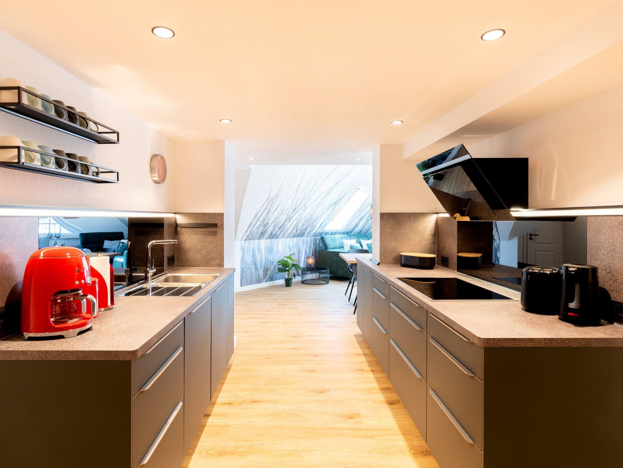 Die 96 qm große und komfortable Wohnung befindet sich im Dachgeschoss und ist für bis zu sechs Personen ausgestattet. Sie wurde 2024 komplett renoviert. Die Wohnung verfügt über drei separate Schlafzimmer mit Doppelbett (mit zusätzlichem TV-Gerät), ein Wohnzimmer mit großzügiger und gemütlicher Couch-Ecke, TV sowie eine offene moderne Küche, ausgestattet mit einem Kühlschrank, Herd, Mikrowelle, Spülmaschine u.v.m.. Zwei Bäder mit ebenerdiger Dusche und WC. Bitte beachten Sie, dass durch die Lage im Dachgeschoss, die Deckenhöhe teilweise etwas niedrig ist.