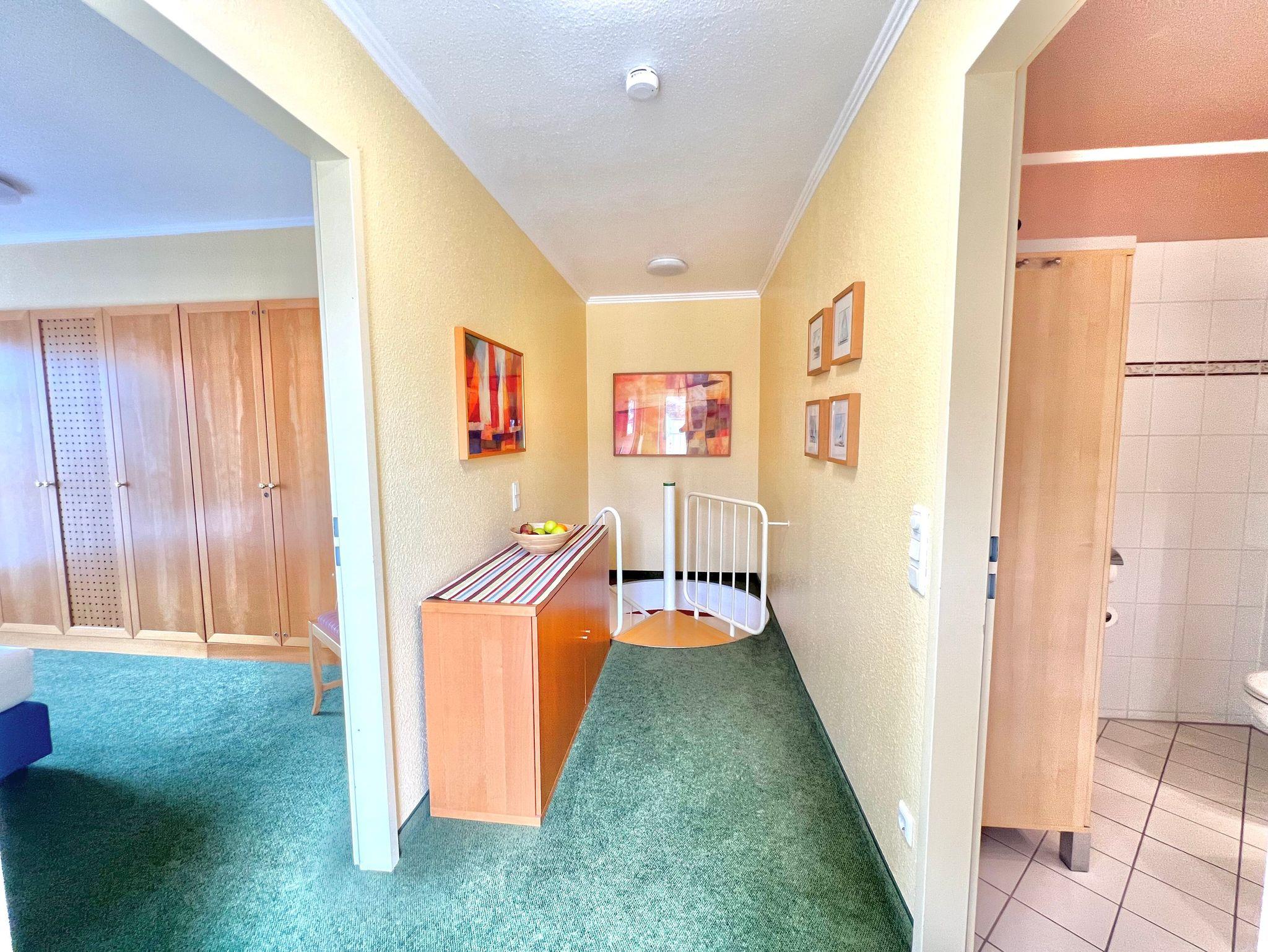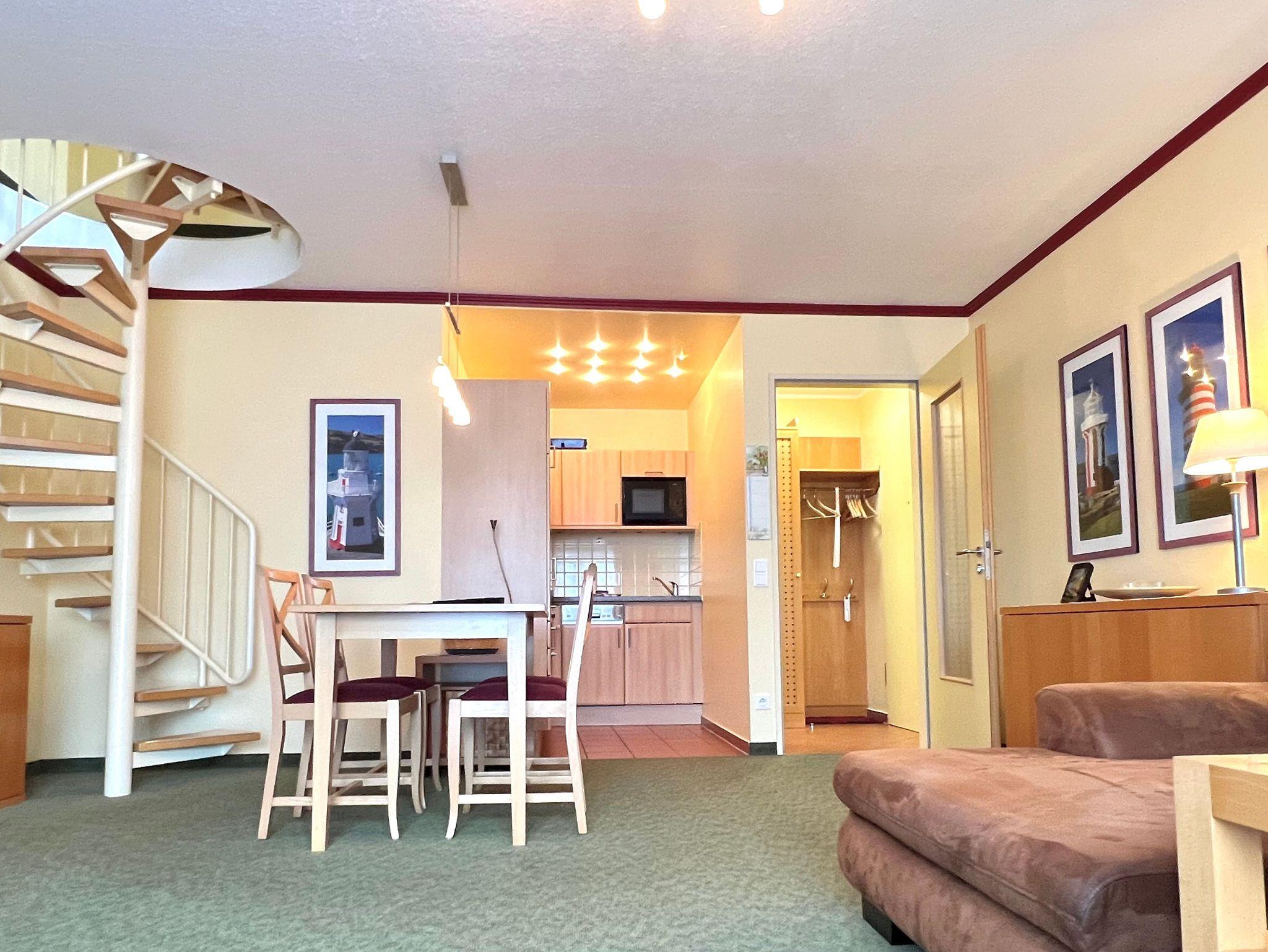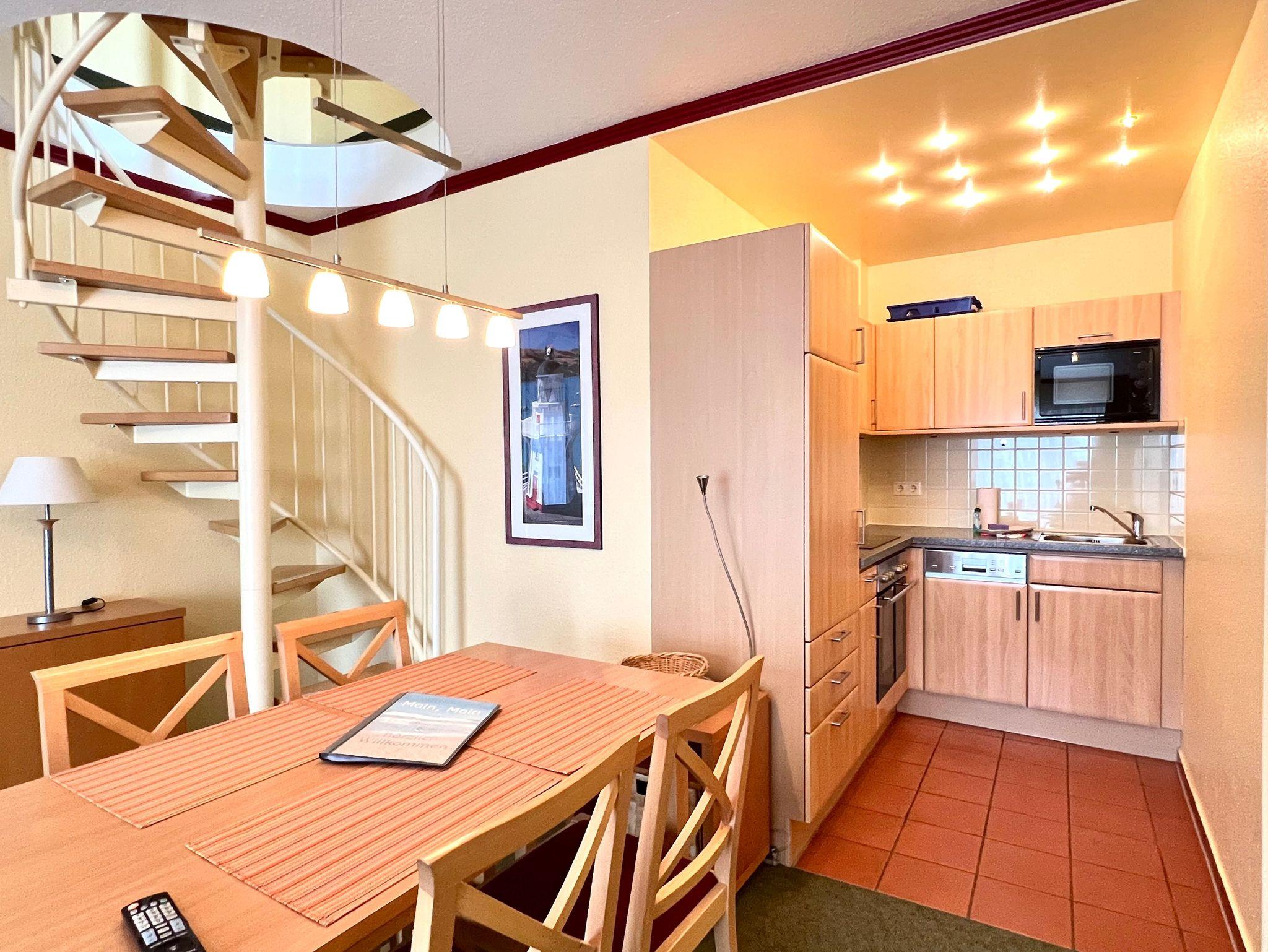 Die komfortabel ausgestattete Wohnung für bis zu 4 Personen (65 qm) erstreckt sich über zwei Etagen und befindet sich im 2. OG. Dies trennt in angenehmer Weise Wohn- und Schlafbereich. Die Wohnung mit Südausrichtung verfügt im unteren Geschoss über ein Wohnzimmer mit Couch und Sesseln, eine vollständige Küchenzeile (4-Platten-Ceranherd mit Umluftbackofen, Geschirrspülmaschine, Mikrowelle, Kühlschrank mit Gefrierfach) und eine Essecke. Der Schlafraum, sowie ein Bad mit Dusche und WC und eigener Waschmaschine im OG sind über eine Treppe erreichbar. Vom OG aus erreichen Sie die großzügige Dachterasse (Richtung Ostsee). Im Schlafzimmer befindet sich ein Doppelbett (2,10 m lang und ohne Fußende).