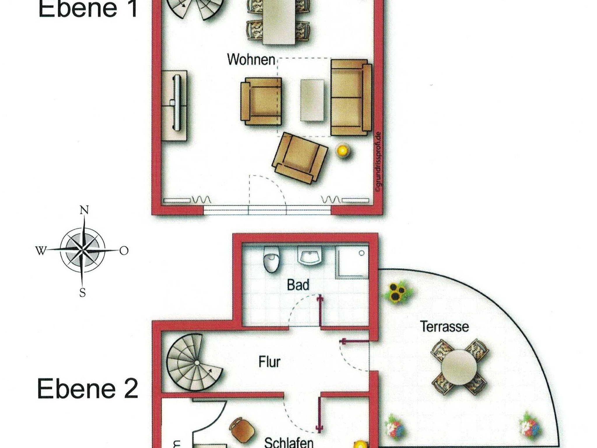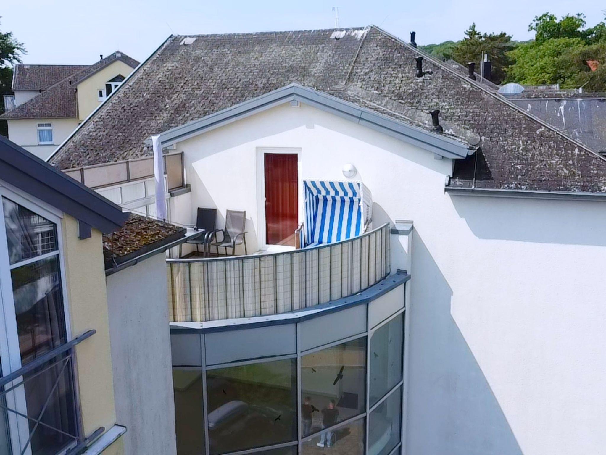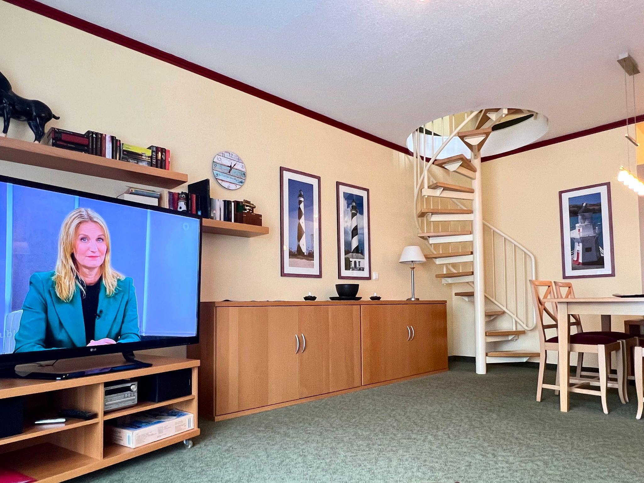 Die komfortabel ausgestattete Wohnung für bis zu 4 Personen (65 qm) erstreckt sich über zwei Etagen und befindet sich im 2. OG. Dies trennt in angenehmer Weise Wohn- und Schlafbereich. Die Wohnung mit Südausrichtung verfügt im unteren Geschoss über ein Wohnzimmer mit Couch und Sesseln, eine vollständige Küchenzeile (4-Platten-Ceranherd mit Umluftbackofen, Geschirrspülmaschine, Mikrowelle, Kühlschrank mit Gefrierfach) und eine Essecke. Der Schlafraum, sowie ein Bad mit Dusche und WC und eigener Waschmaschine im OG sind über eine Treppe erreichbar. Vom OG aus erreichen Sie die großzügige Dachterasse (Richtung Ostsee). Im Schlafzimmer befindet sich ein Doppelbett (2,10 m lang und ohne Fußende).