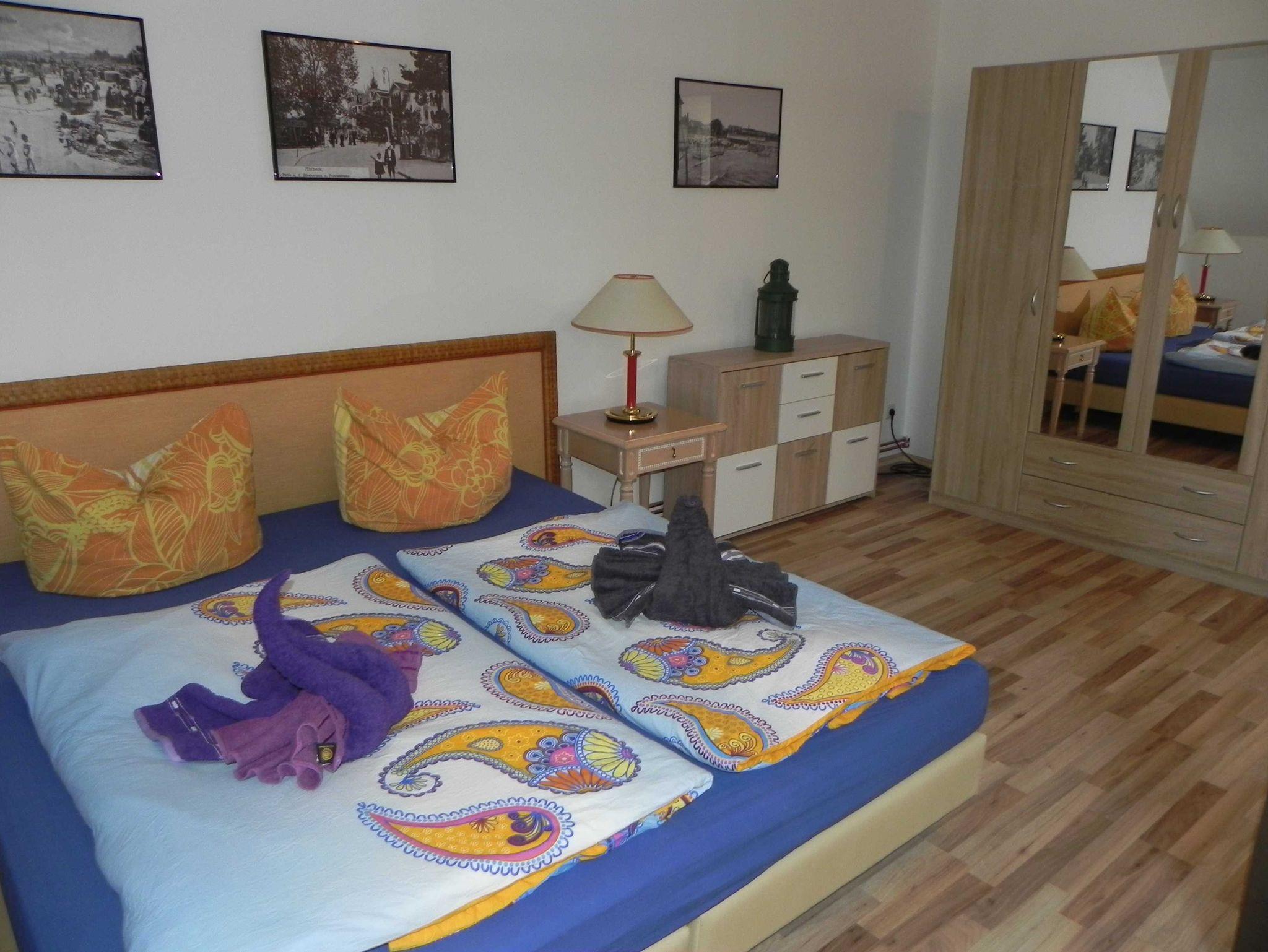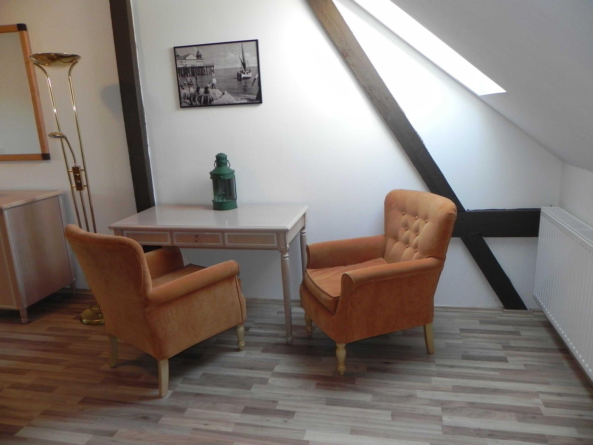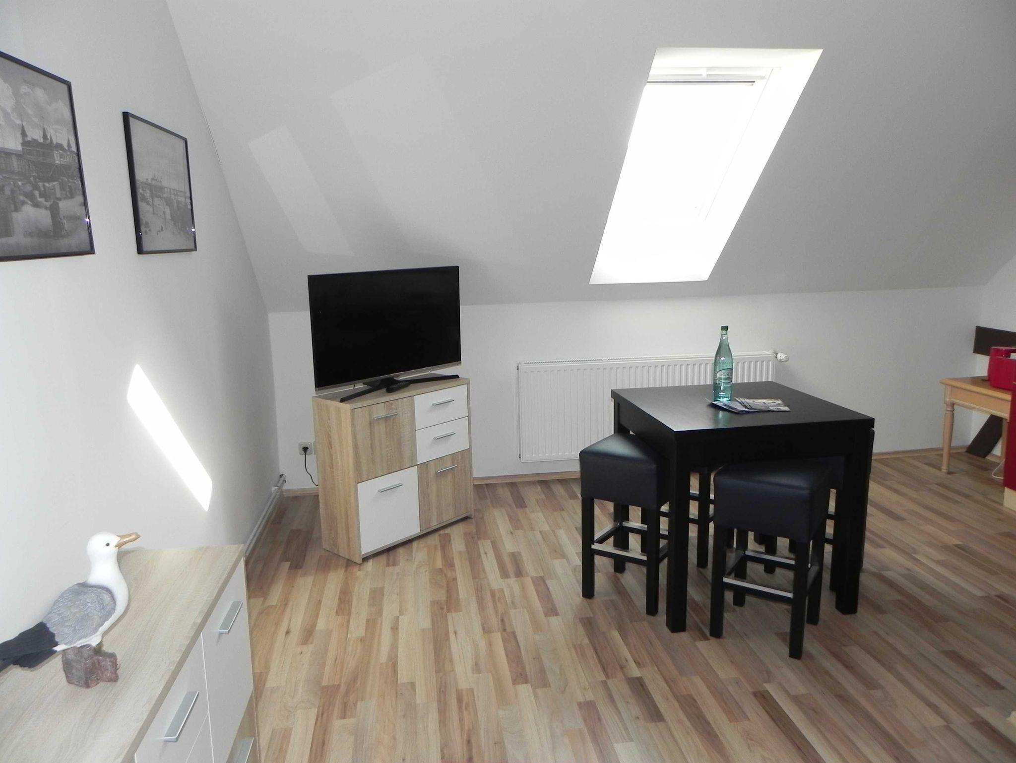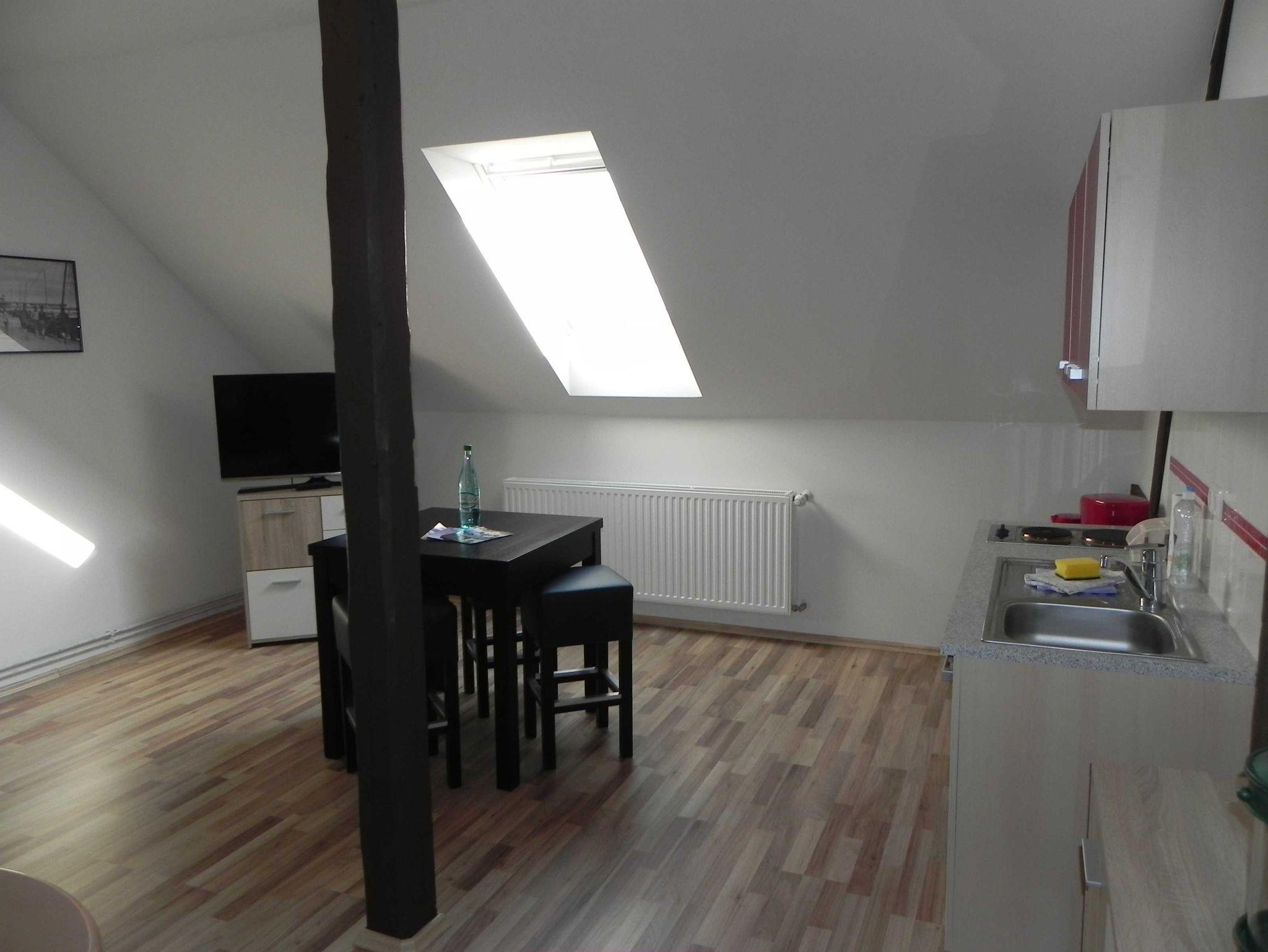 Die 62 qm große Ferienwohnung befindet sich im Dachgeschoss und ist mit einem Wohnzimmer mit Sitzecke und TV und einer kleinen Küchenzeile mit Kühlschrank und Gefriermöglichkeit, 2-Platten-Herd etc ausgestattet. Das Schlafzimmer verfügt über ein Doppelbett. Bad mit Dusche und WC. Die Erstausstattung Bettwäsche und Handtücher ist im Preis enthalten.