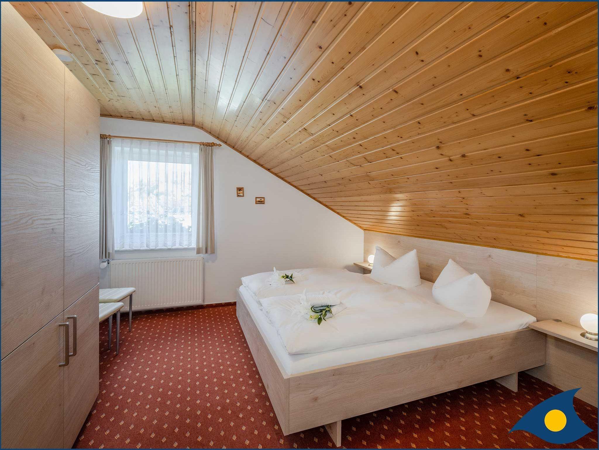 Eine schöne Holz-Treppe führt Sie in das Obergeschoss. Dort erwartet Sie unter dem Dach ein heimeliger Schlafraum. Neben dem großzügigen Doppelbett (180 x 200 cm) steht ein bequemes Einzelbett für die dritte Person zur verfügung.