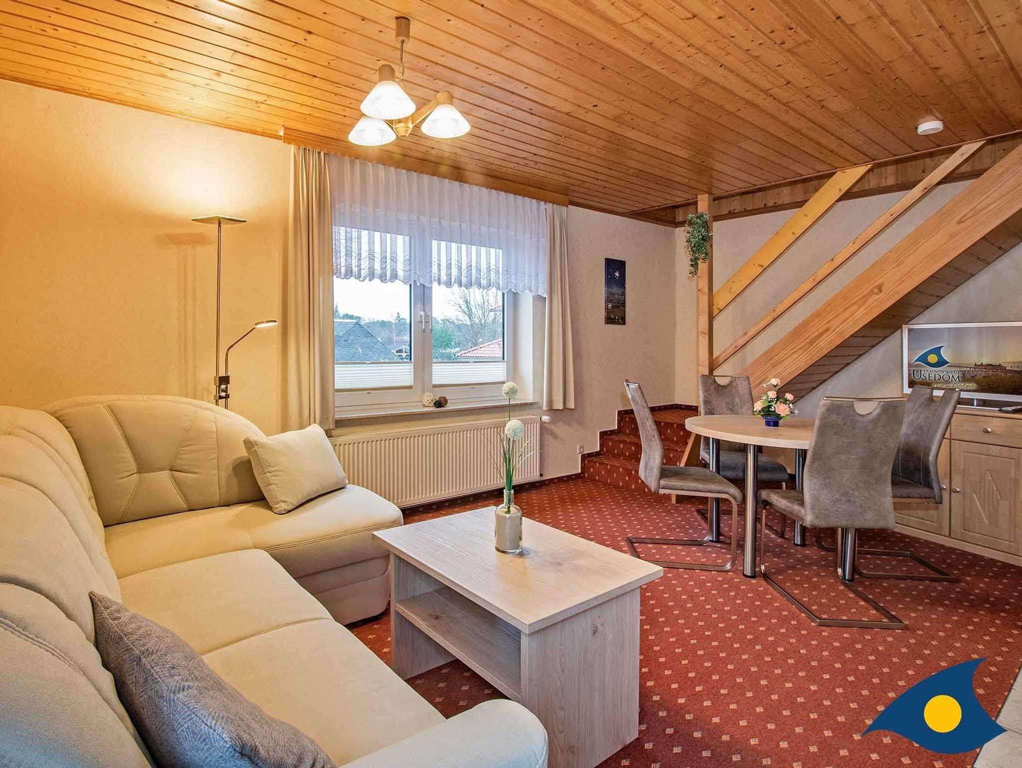 Die Ferienwohnung über 2 Etagen begrüßt Sie auf´s herzlichste. Im Erdgeschoss erwartet Sie ein gemütlicher Wohnraum inkl. Sofalandschaft und Küchenzeile. Der Essplatz mit den 3 Stühlen lädt zum gemeinsamen Frühstück oder einem Spieleabend ein. Das Badezimmer in der unteren Etage ist mit einer Dusche, einem WC und einem Handwaschbecken ausgestattet.
